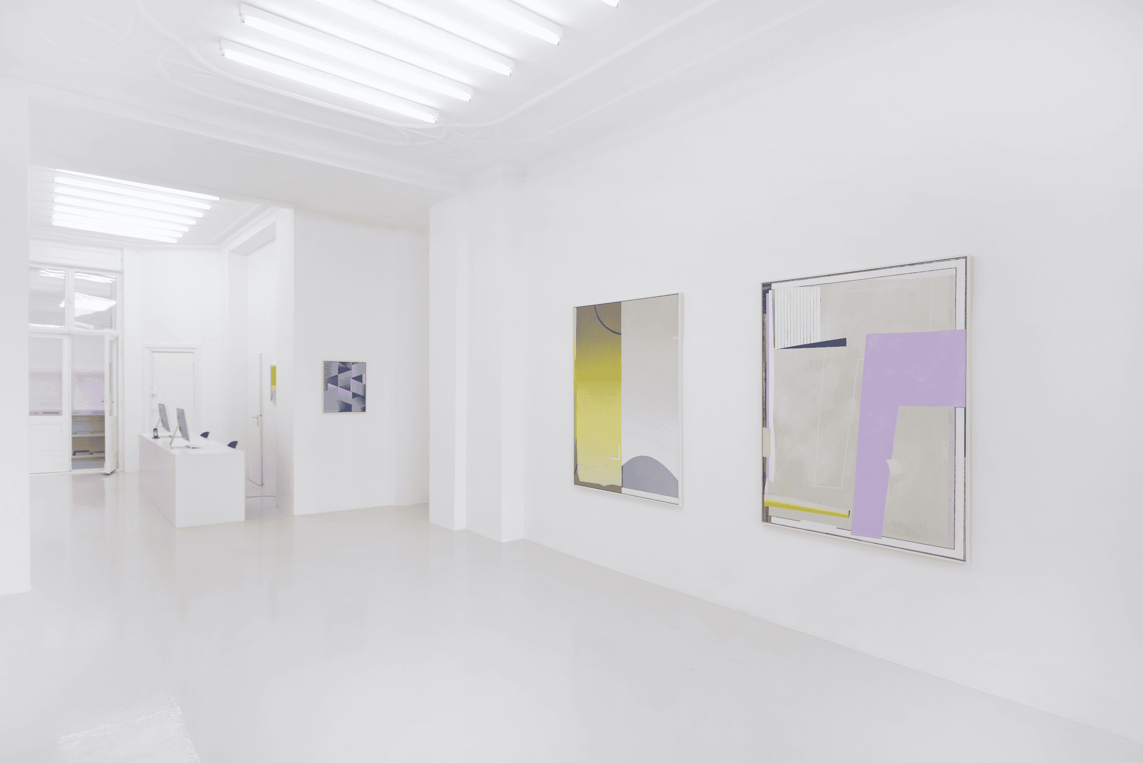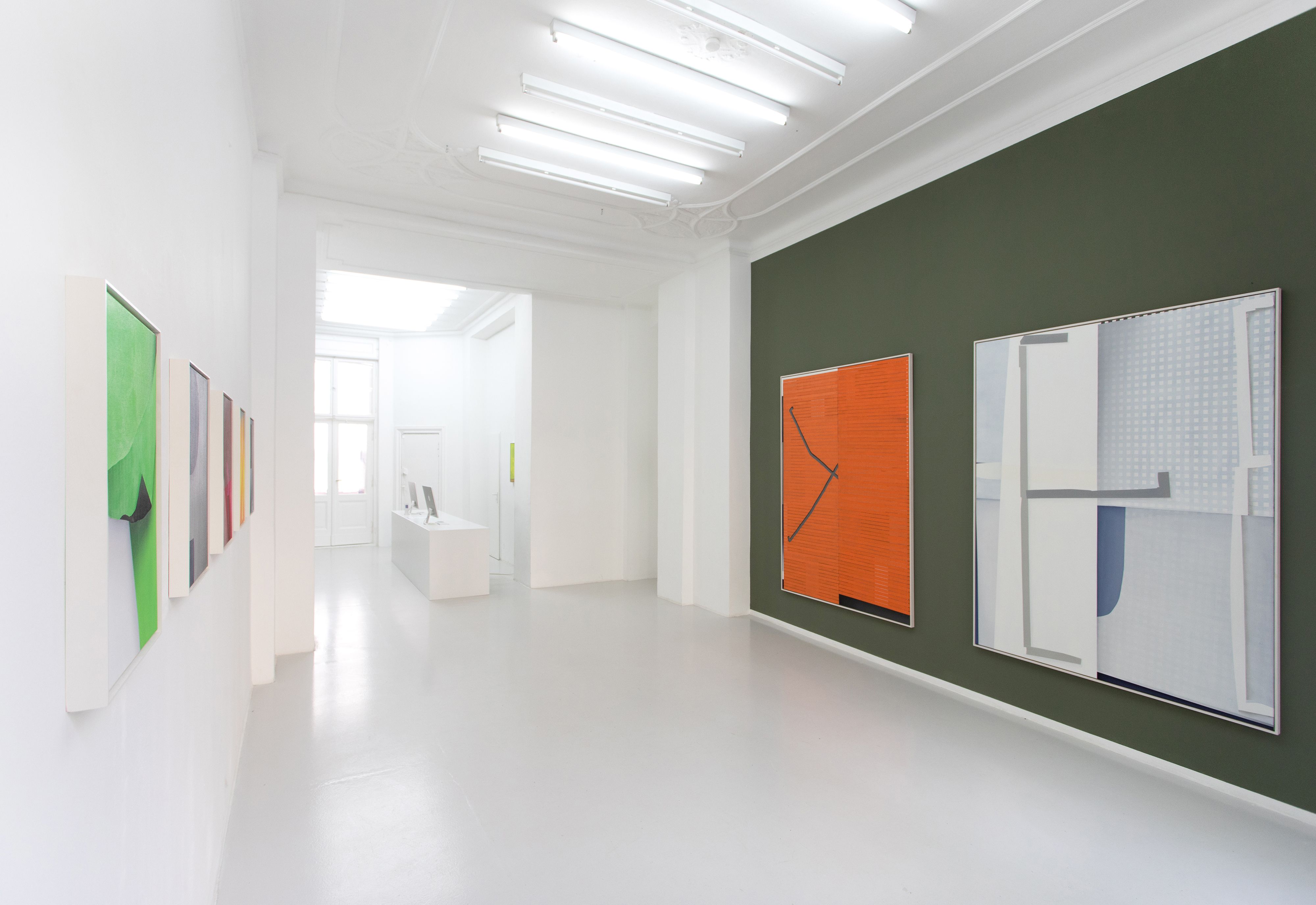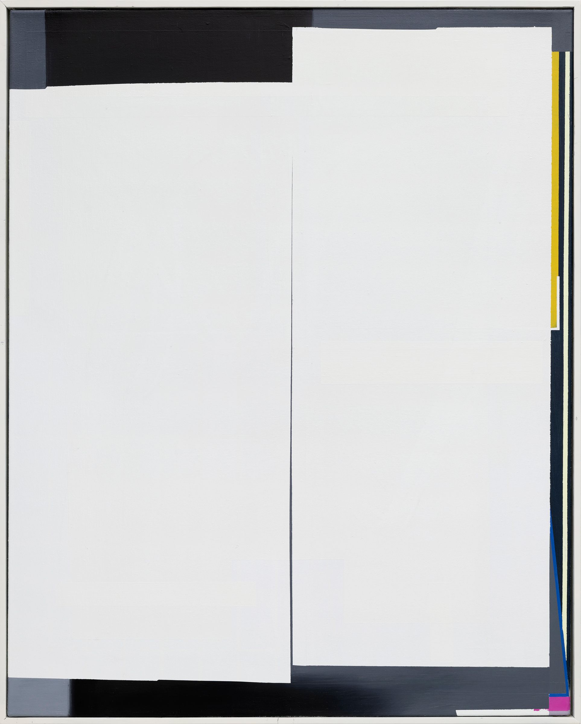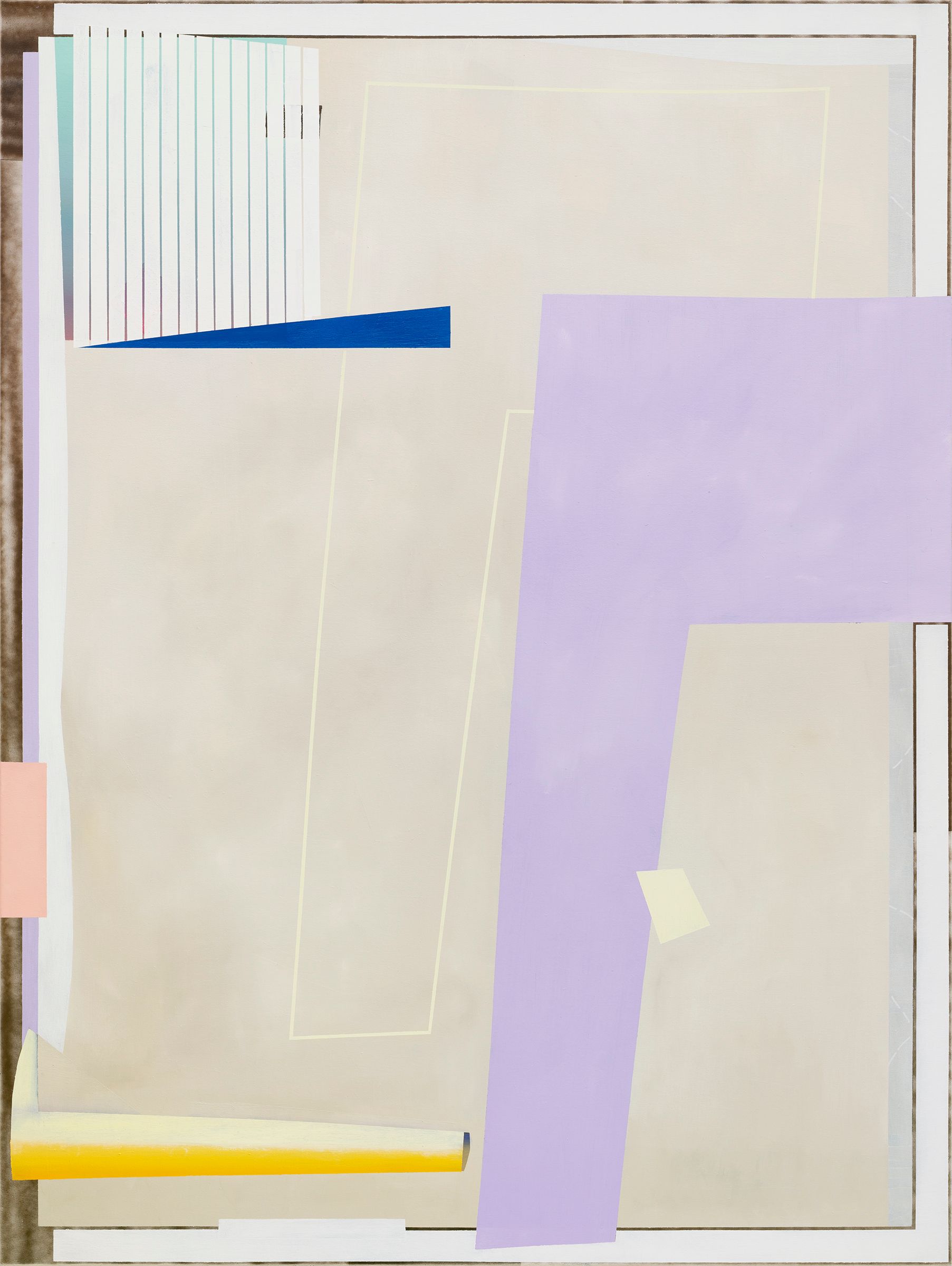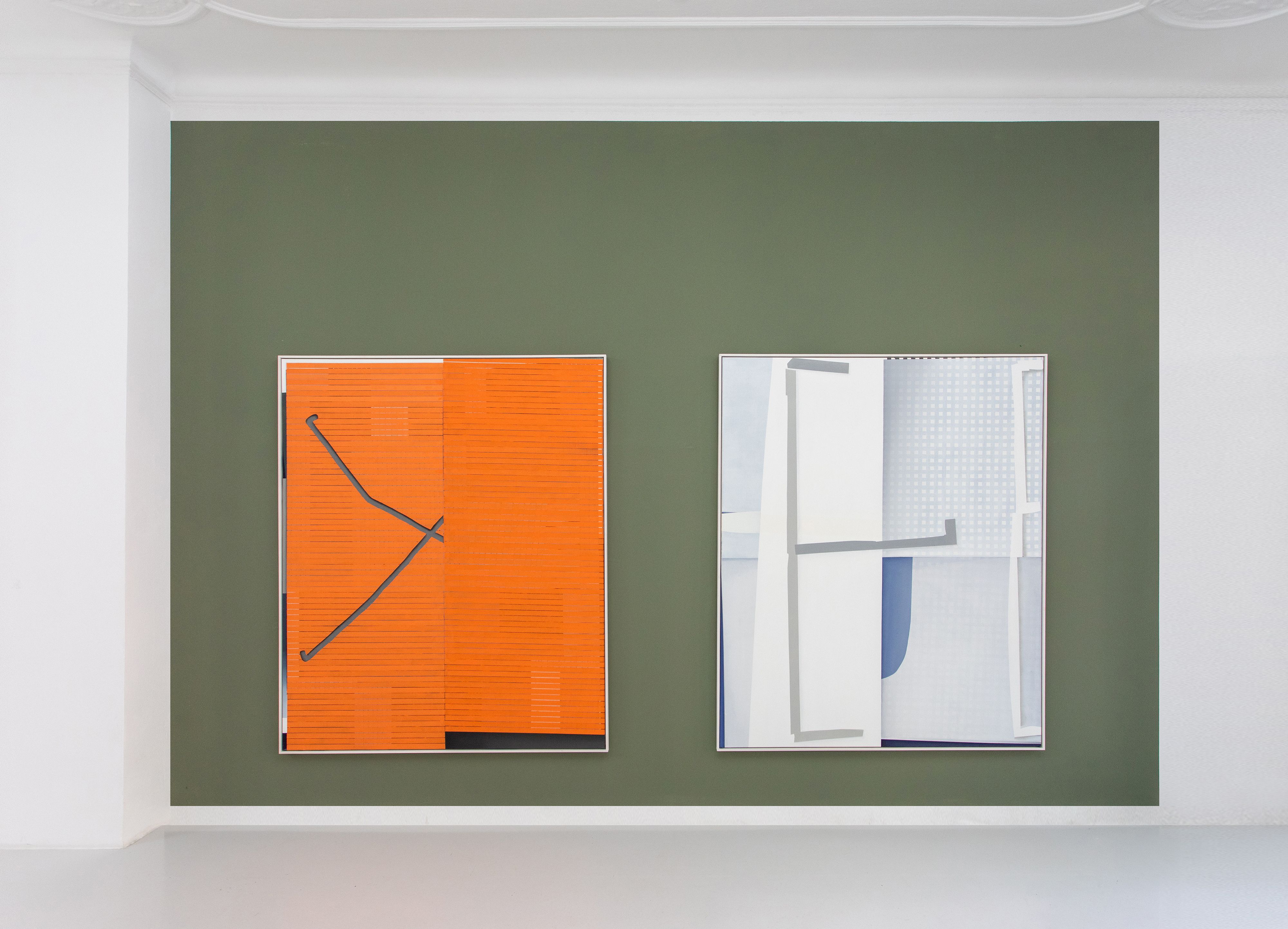 Enrico Bach's compositions are characterized by the division of the pictorial space into two halves. A picture-within-a-picture principle in which each side stands on its own and yet corresponds with the other half. The layered areas of color and pattern thus create the illusion of a more or less deep space. At the same time, Bach leaves behind the conventional compositional pattern of a centered motif: the picture's edge, ground and interfaces become depth-giving design levels.