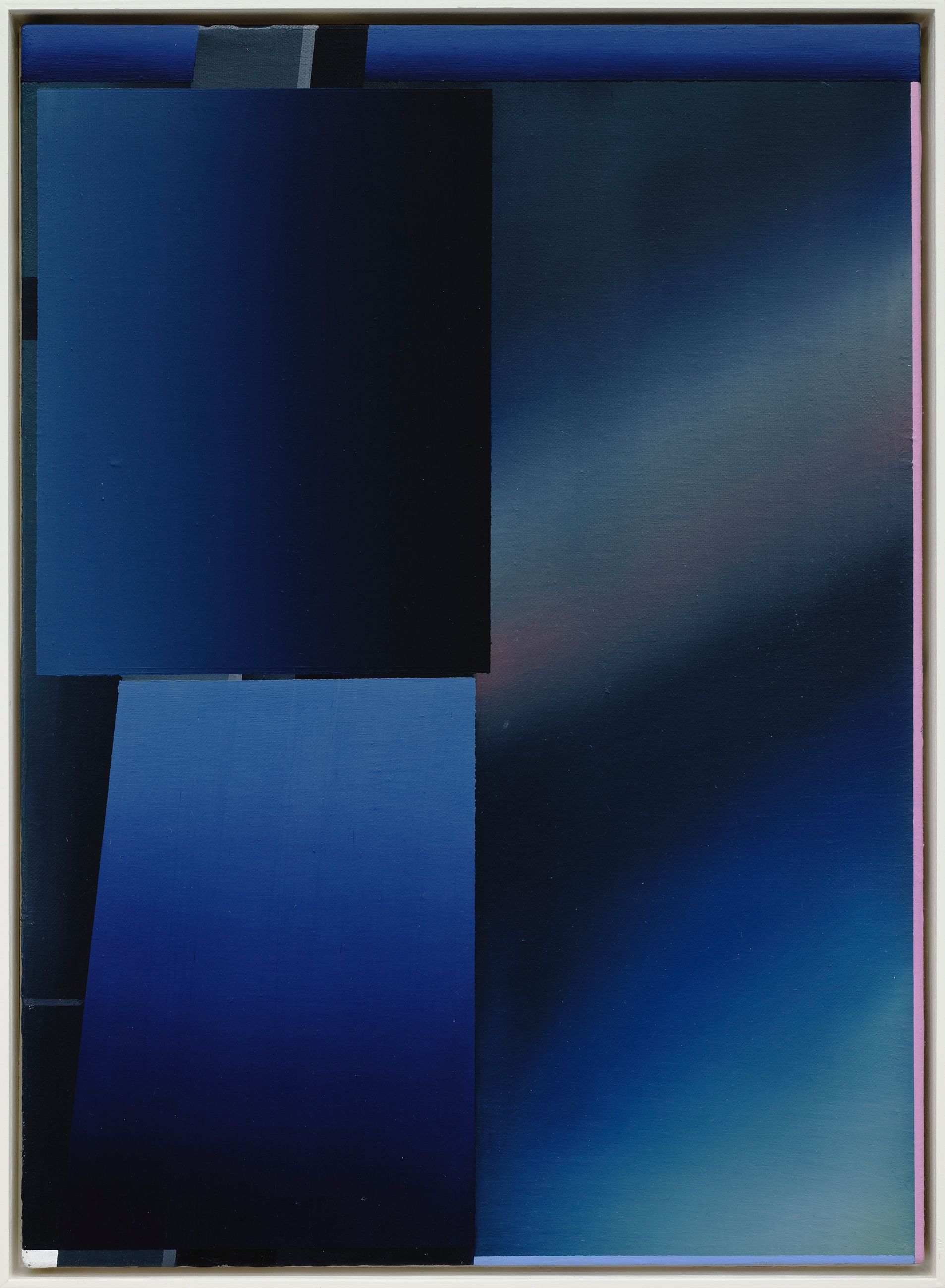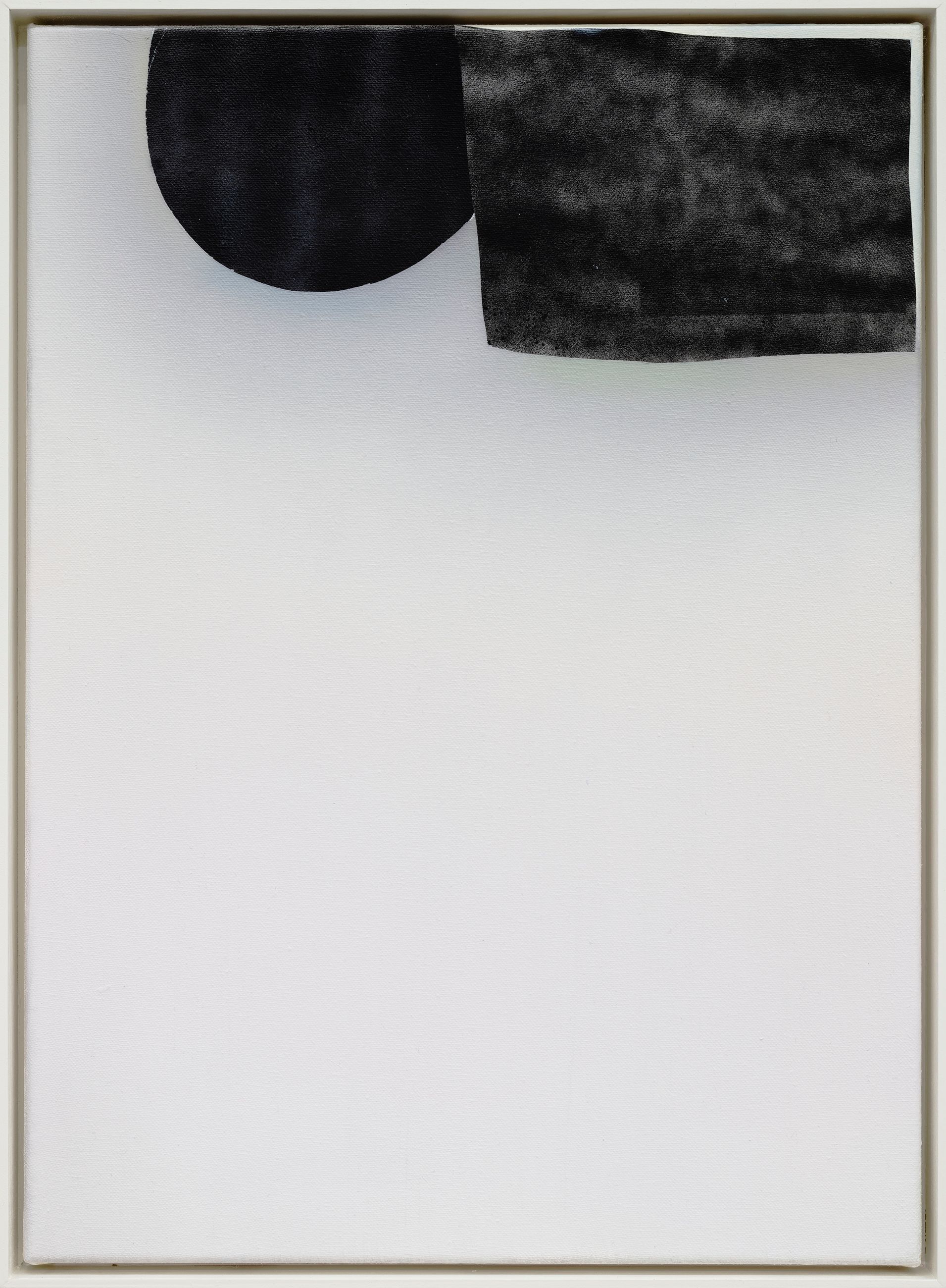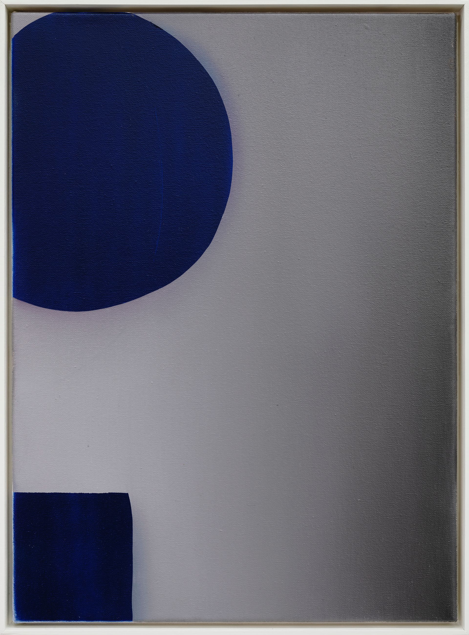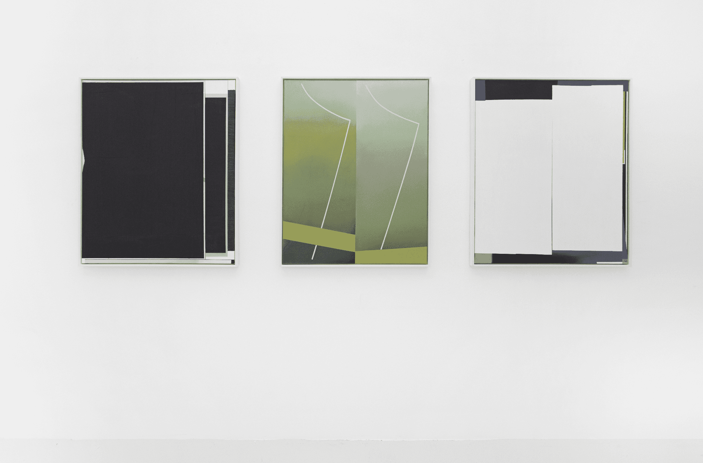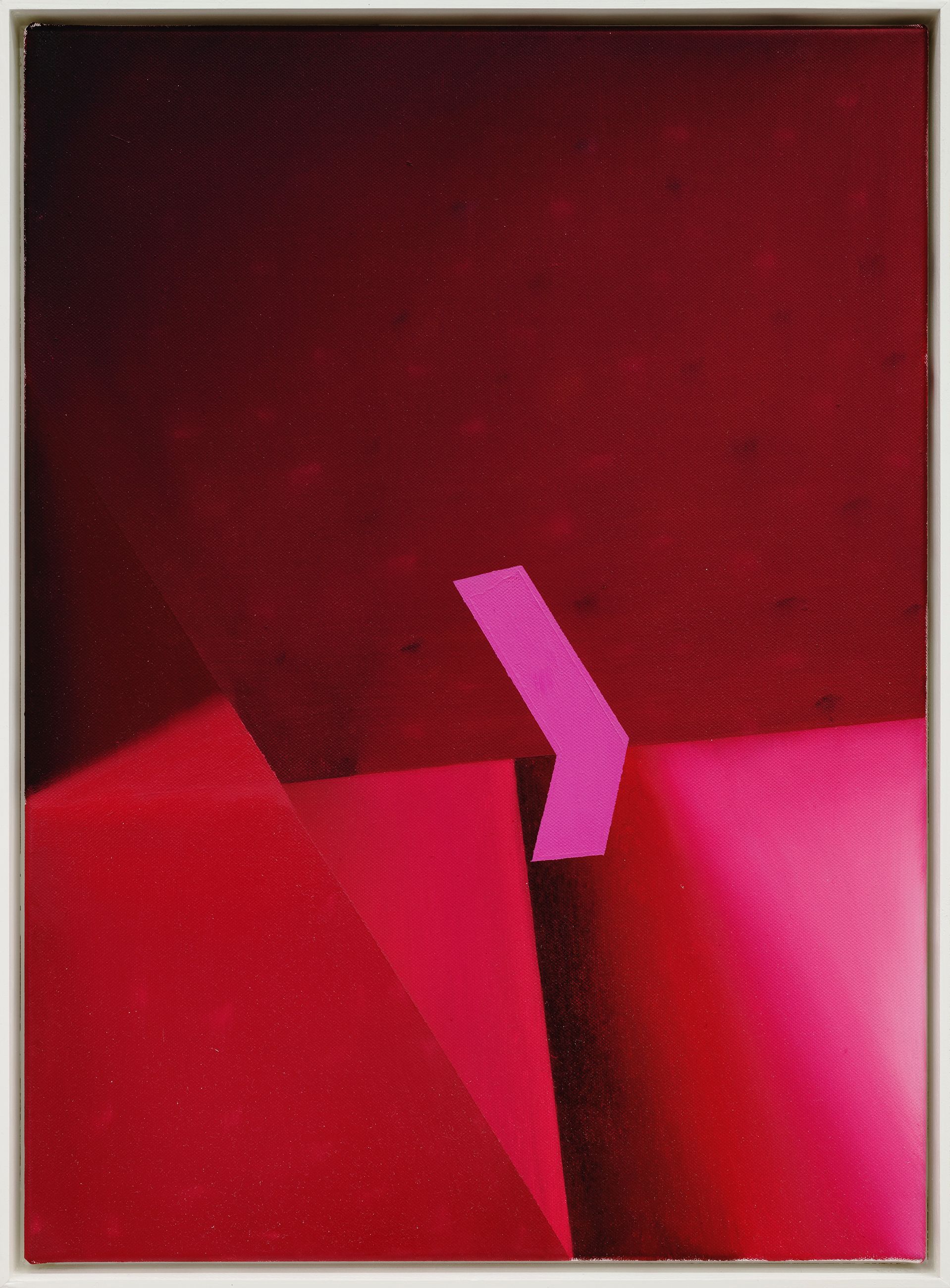 Enrico Bach's compositions are characterized by the division of the pictorial space into two halves. A picture-within-a-picture principle in which each side stands on its own and yet corresponds with the other half. The layered areas of color and pattern thus create the illusion of a more or less deep space. At the same time, Bach leaves behind the conventional compositional pattern of a centered motif: the picture's edge, ground and interfaces become depth-giving design levels.