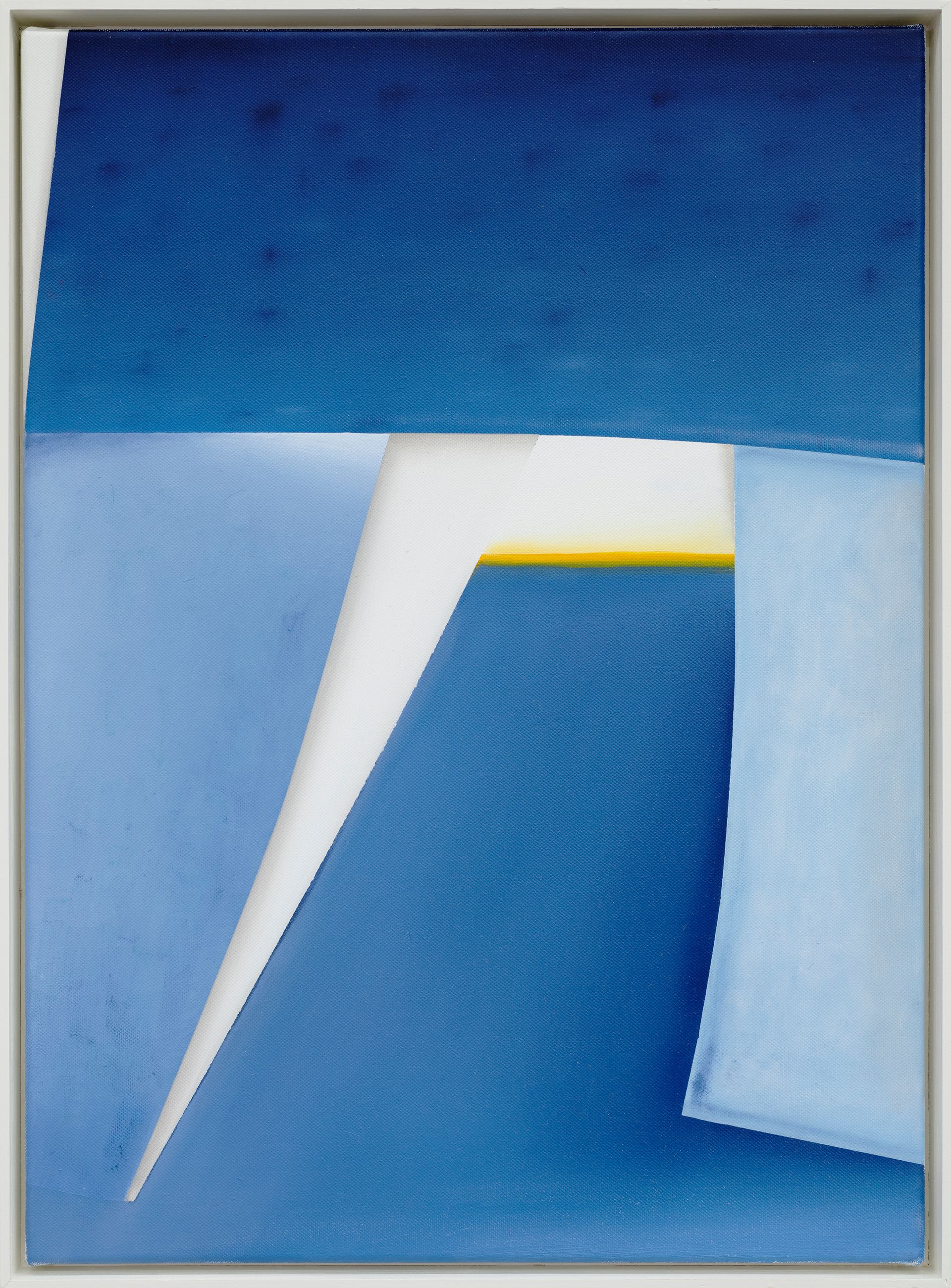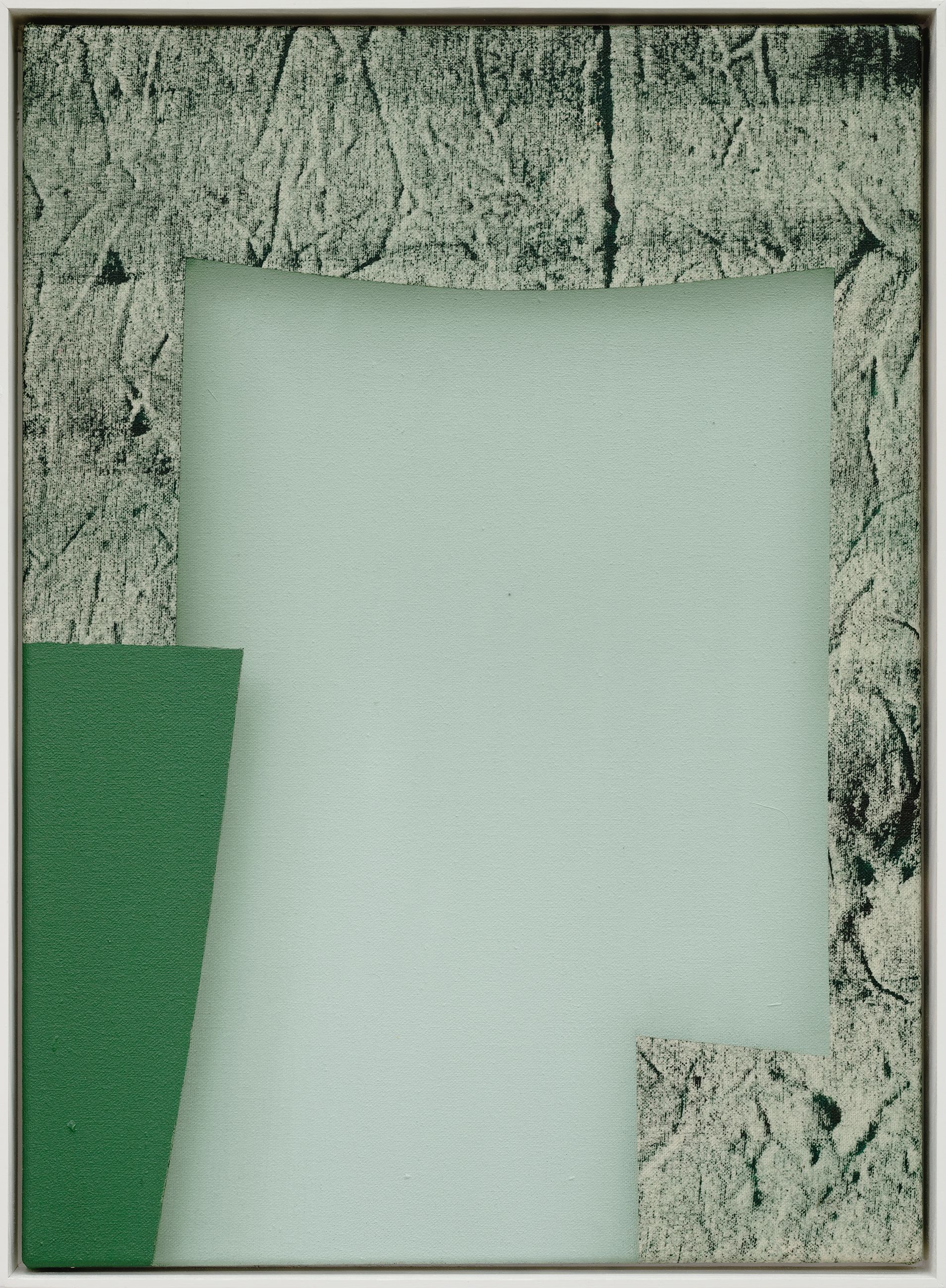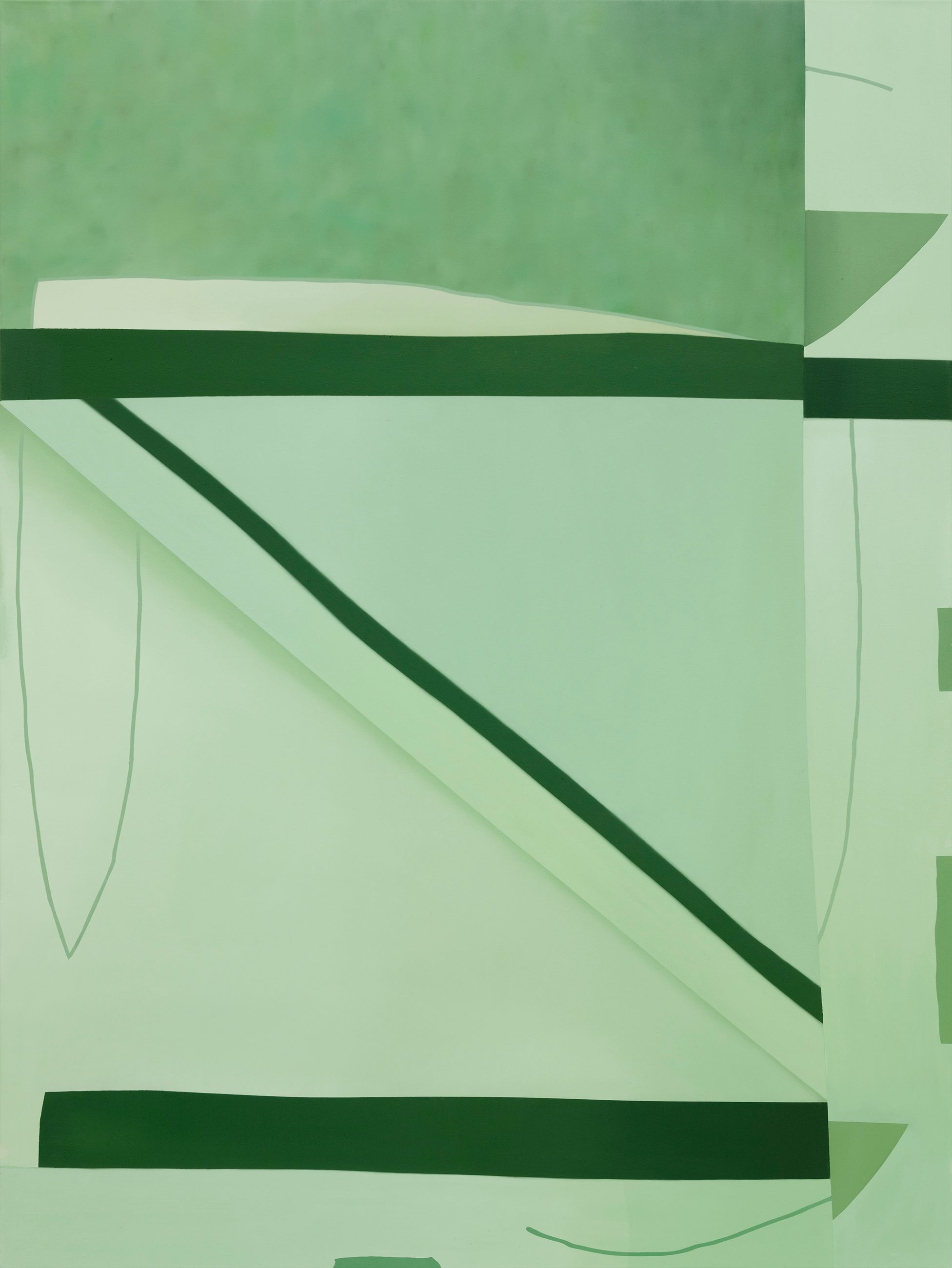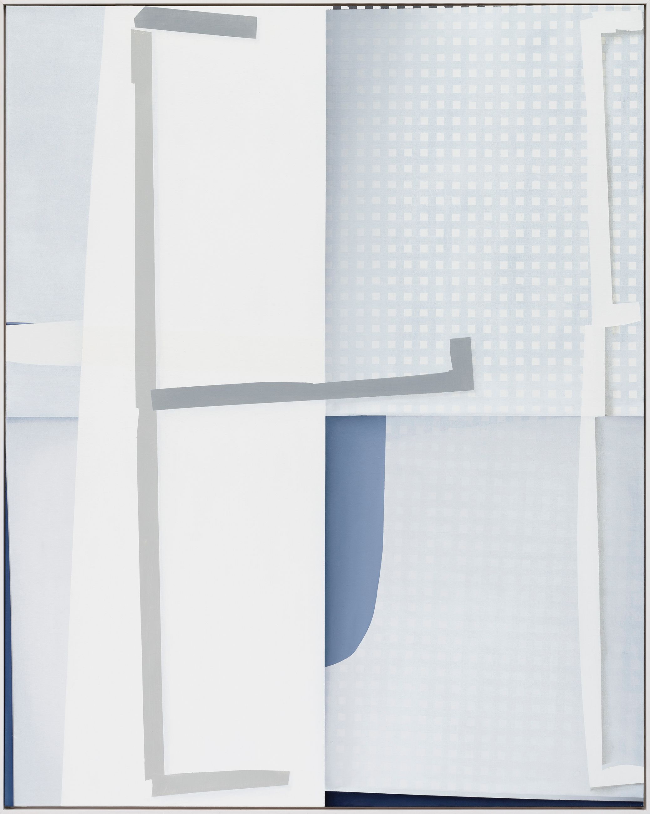 Enrico Bach's compositions are characterized by the division of the pictorial space into two halves. A picture-within-a-picture principle in which each side stands on its own and yet corresponds with the other half. The layered areas of color and pattern thus create the illusion of a more or less deep space. At the same time, Bach leaves behind the conventional compositional pattern of a centered motif: the picture's edge, ground and interfaces become depth-giving design levels.