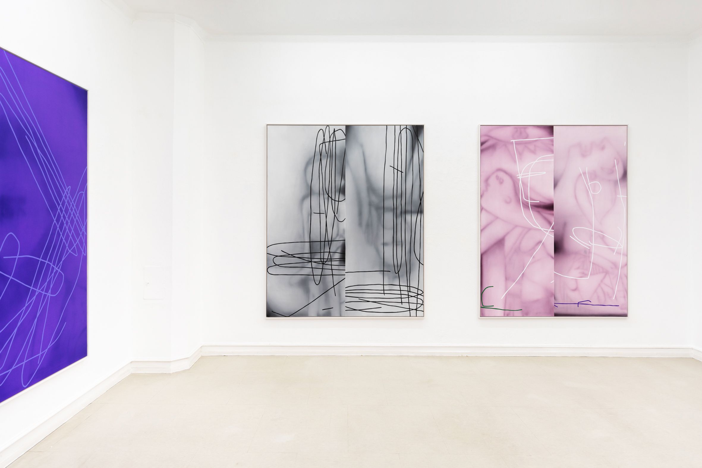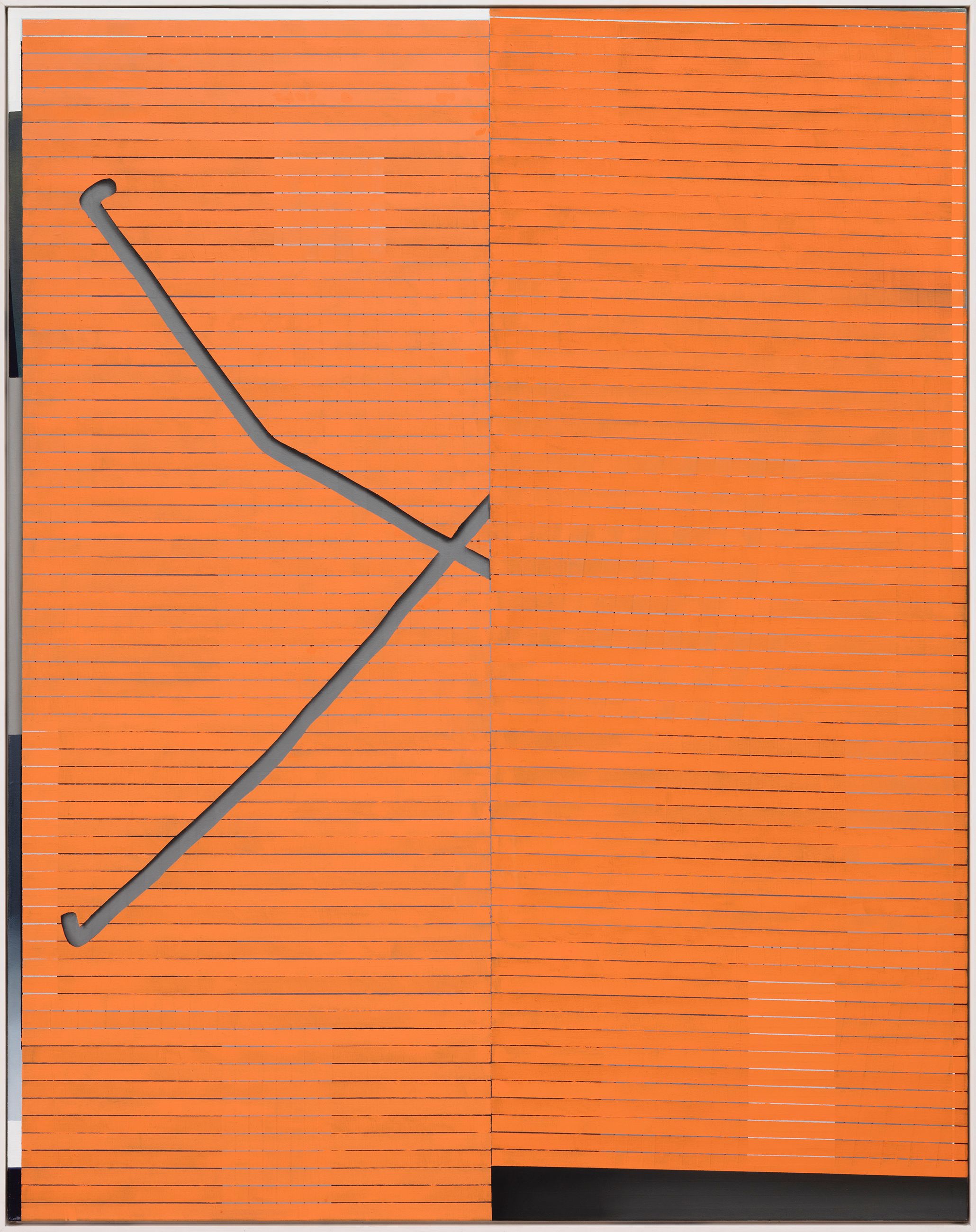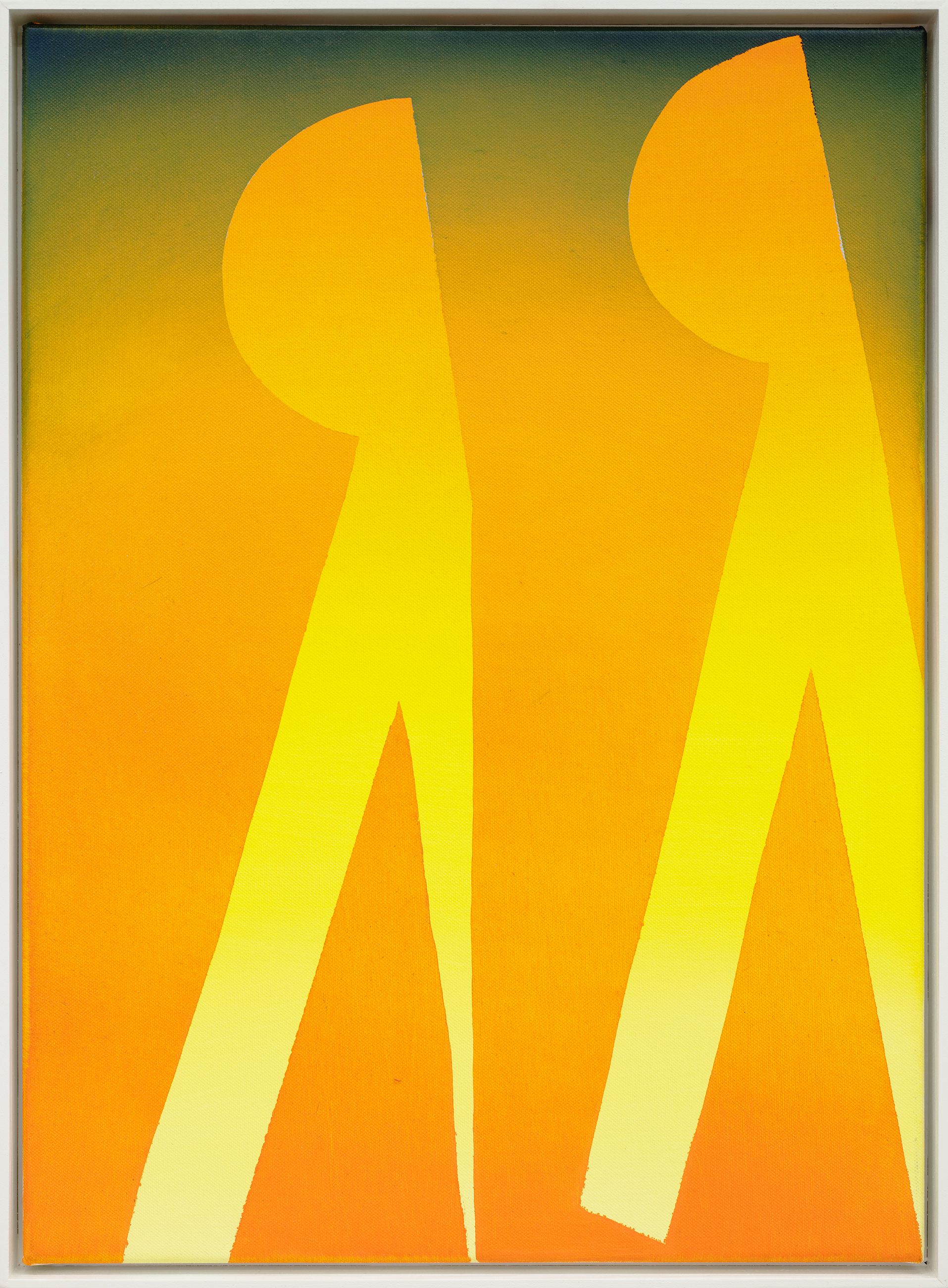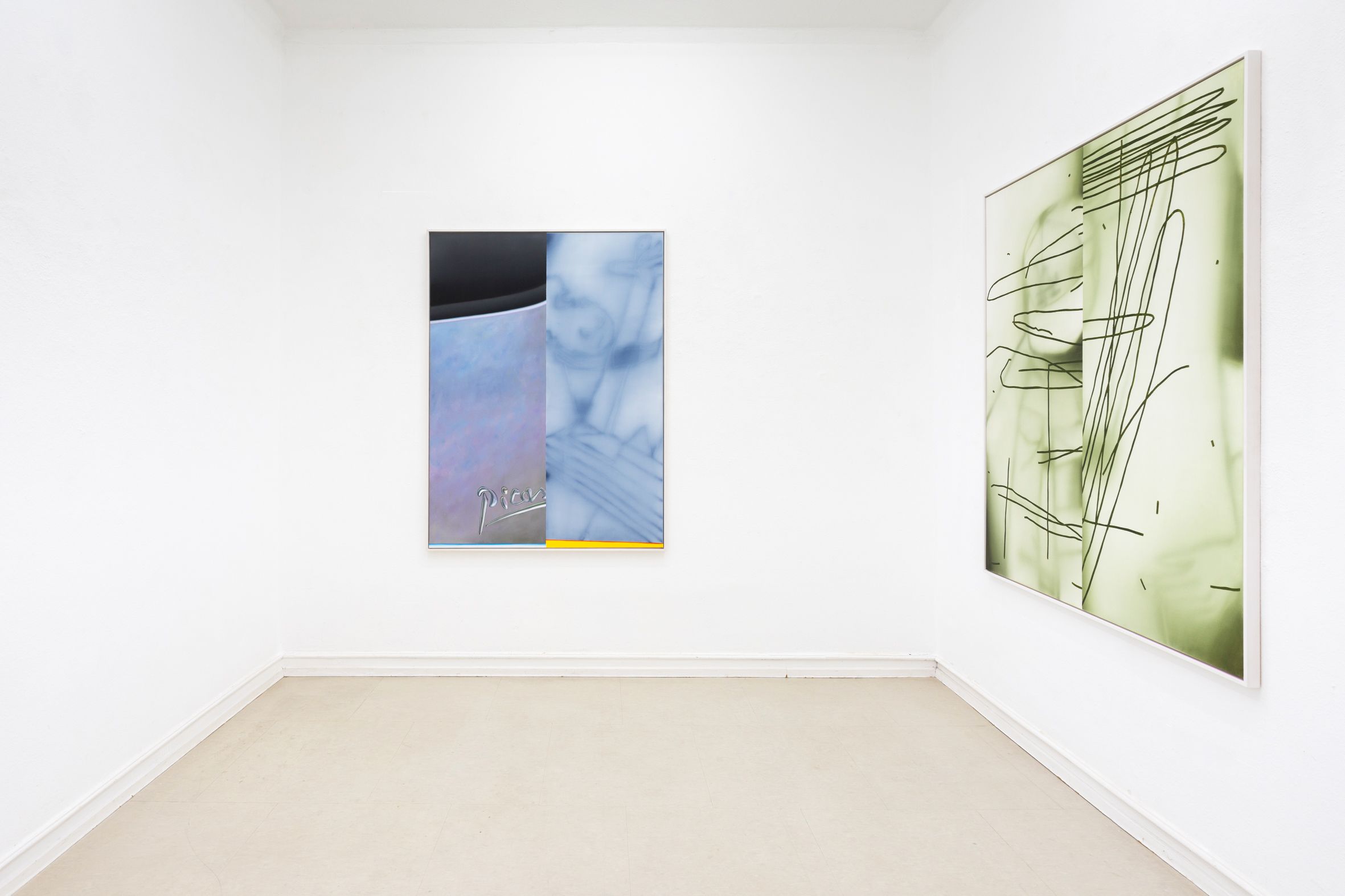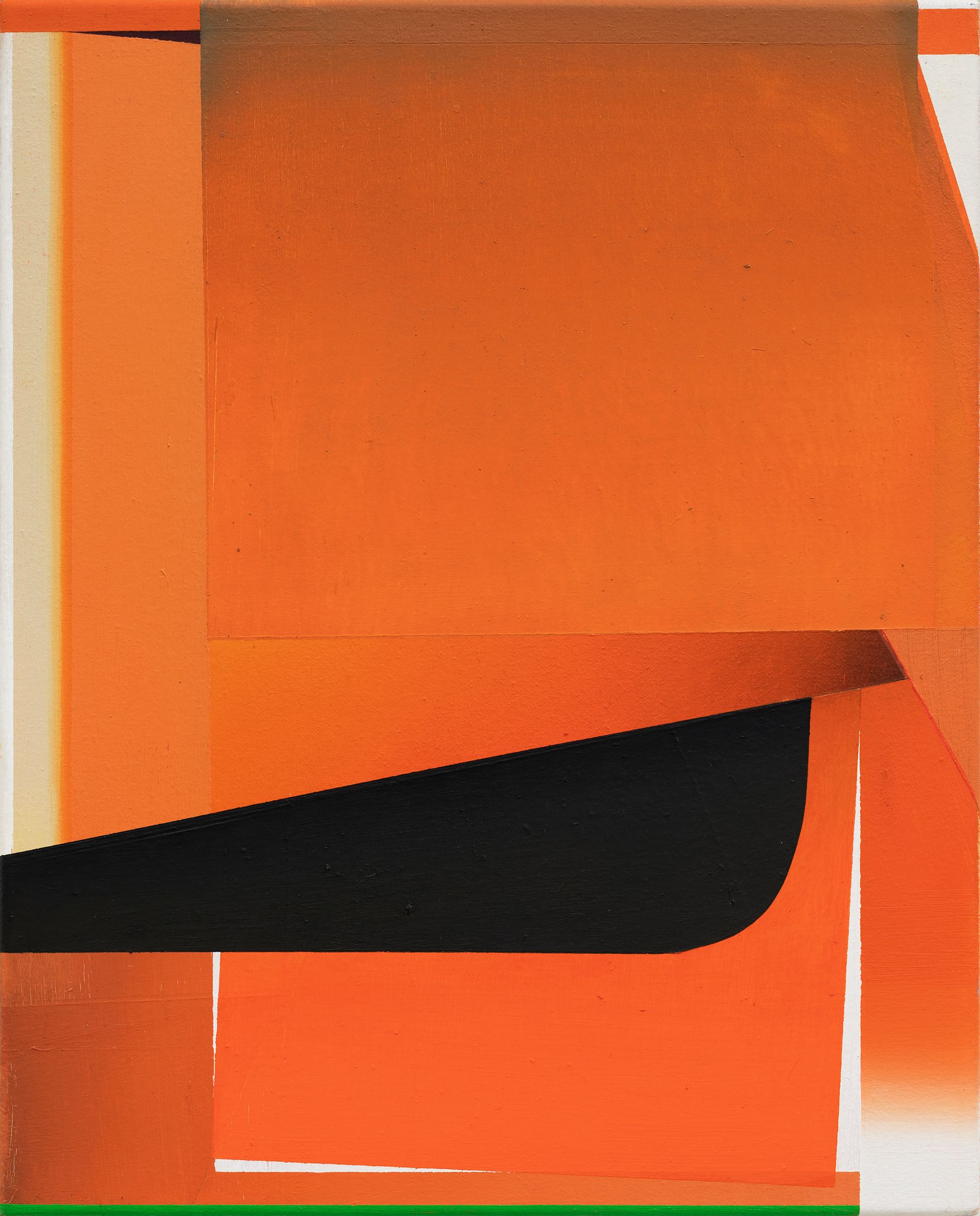 Enrico Bach's compositions are characterized by the division of the pictorial space into two halves. A picture-within-a-picture principle in which each side stands on its own and yet corresponds with the other half. The layered areas of color and pattern thus create the illusion of a more or less deep space. At the same time, Bach leaves behind the conventional compositional pattern of a centered motif: the picture's edge, ground and interfaces become depth-giving design levels.