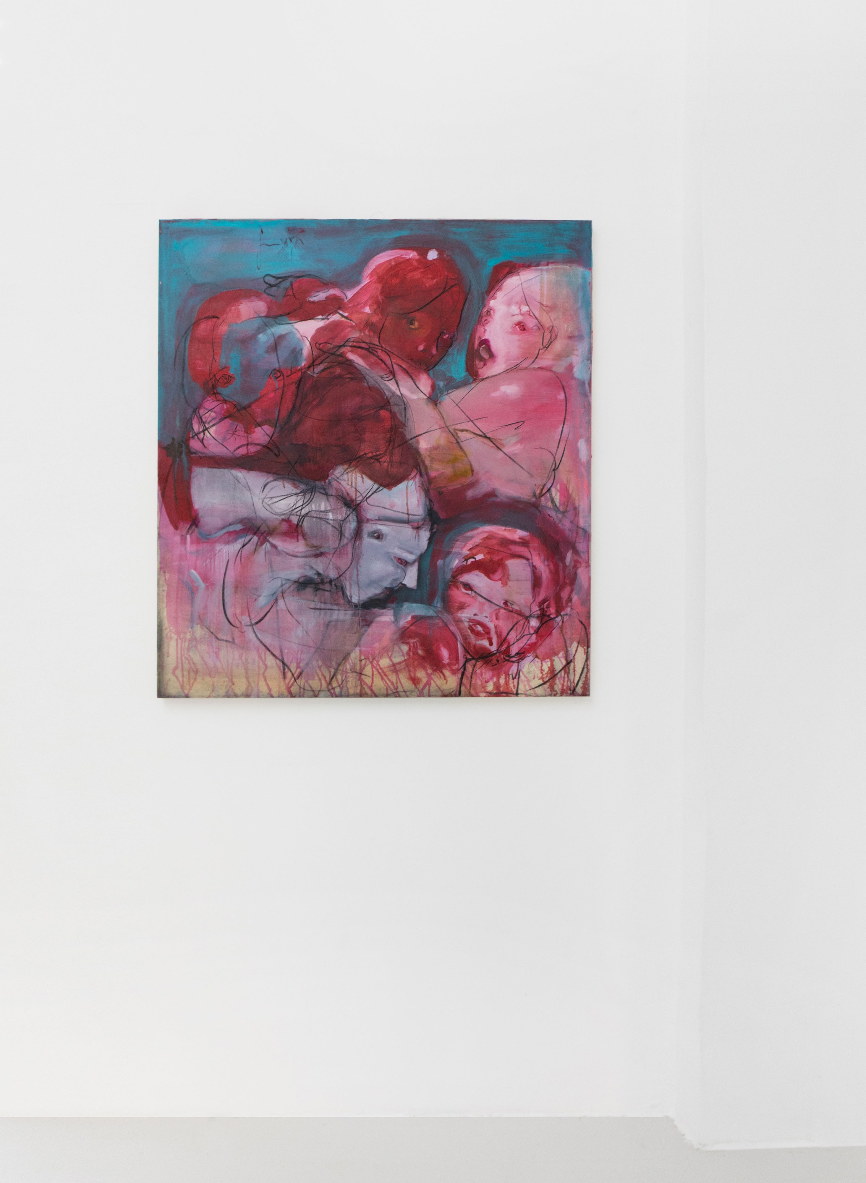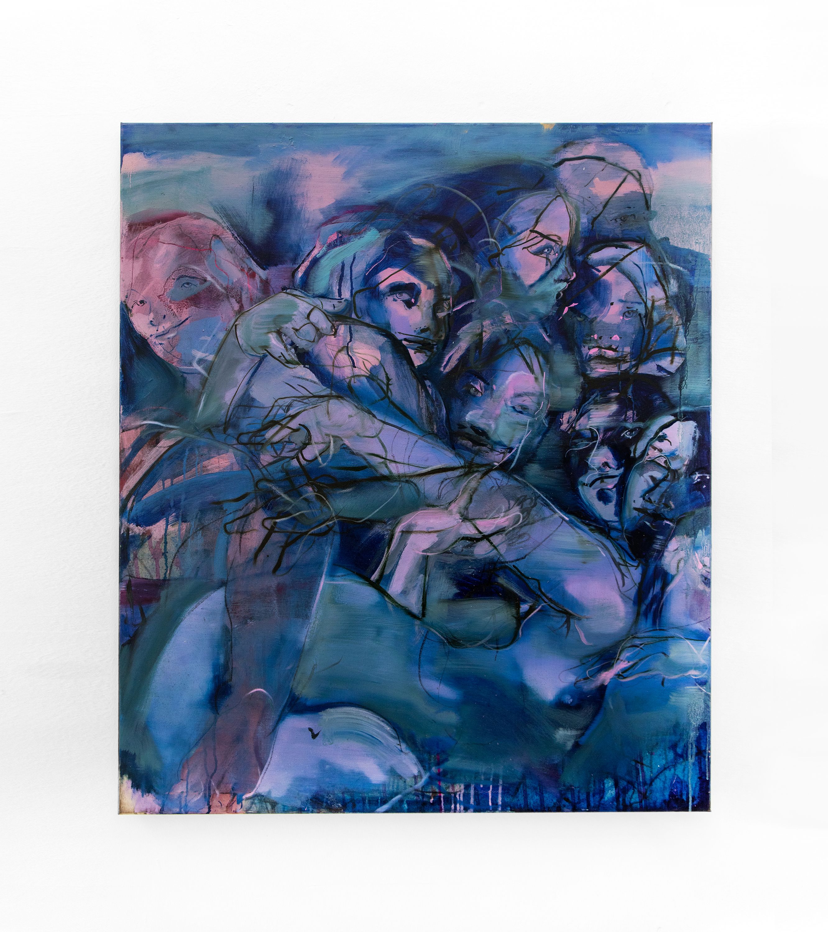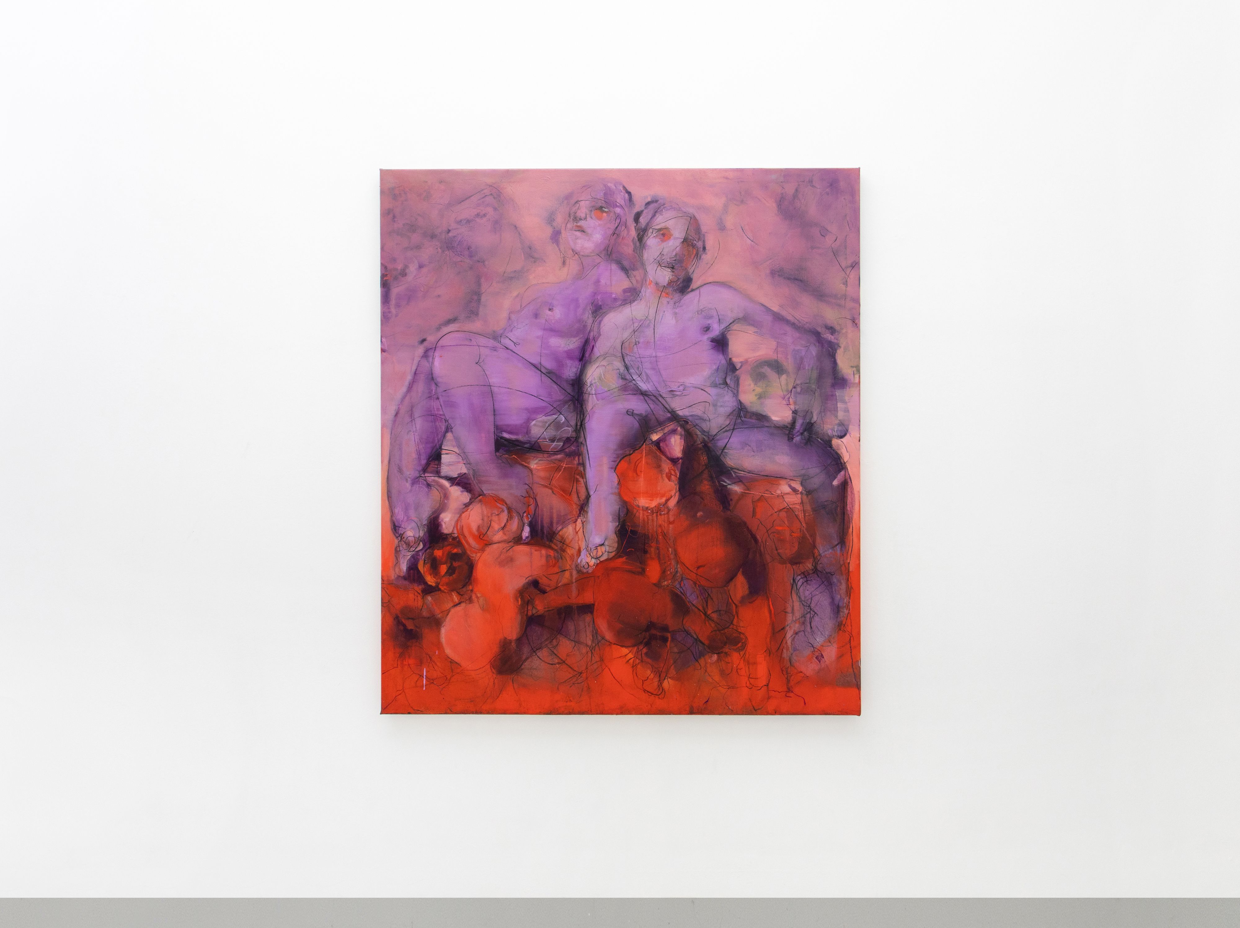 Painted with oil and charcoal on canvas, these intimate moments capture the climax of physical and emotional connection between the subjects.