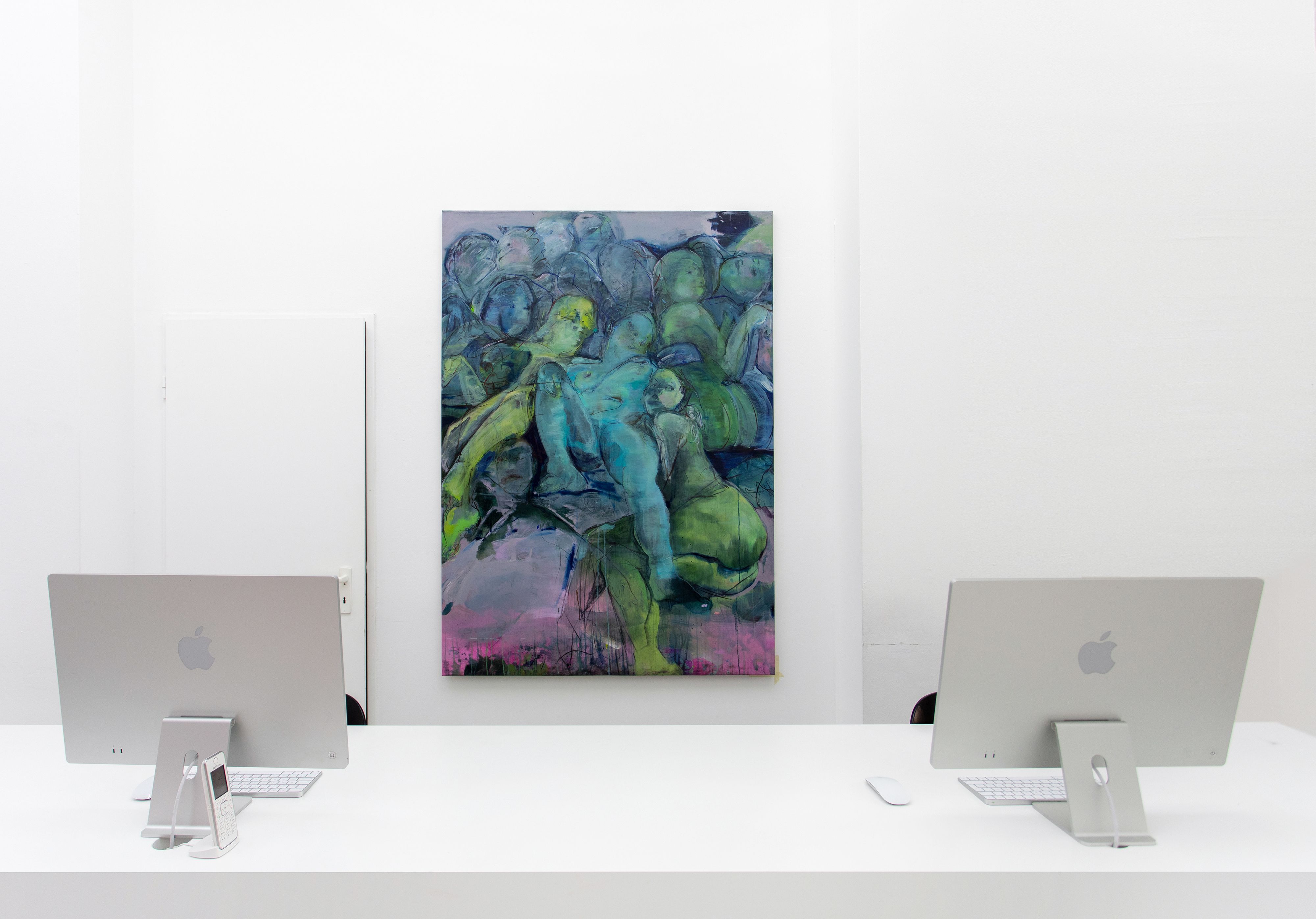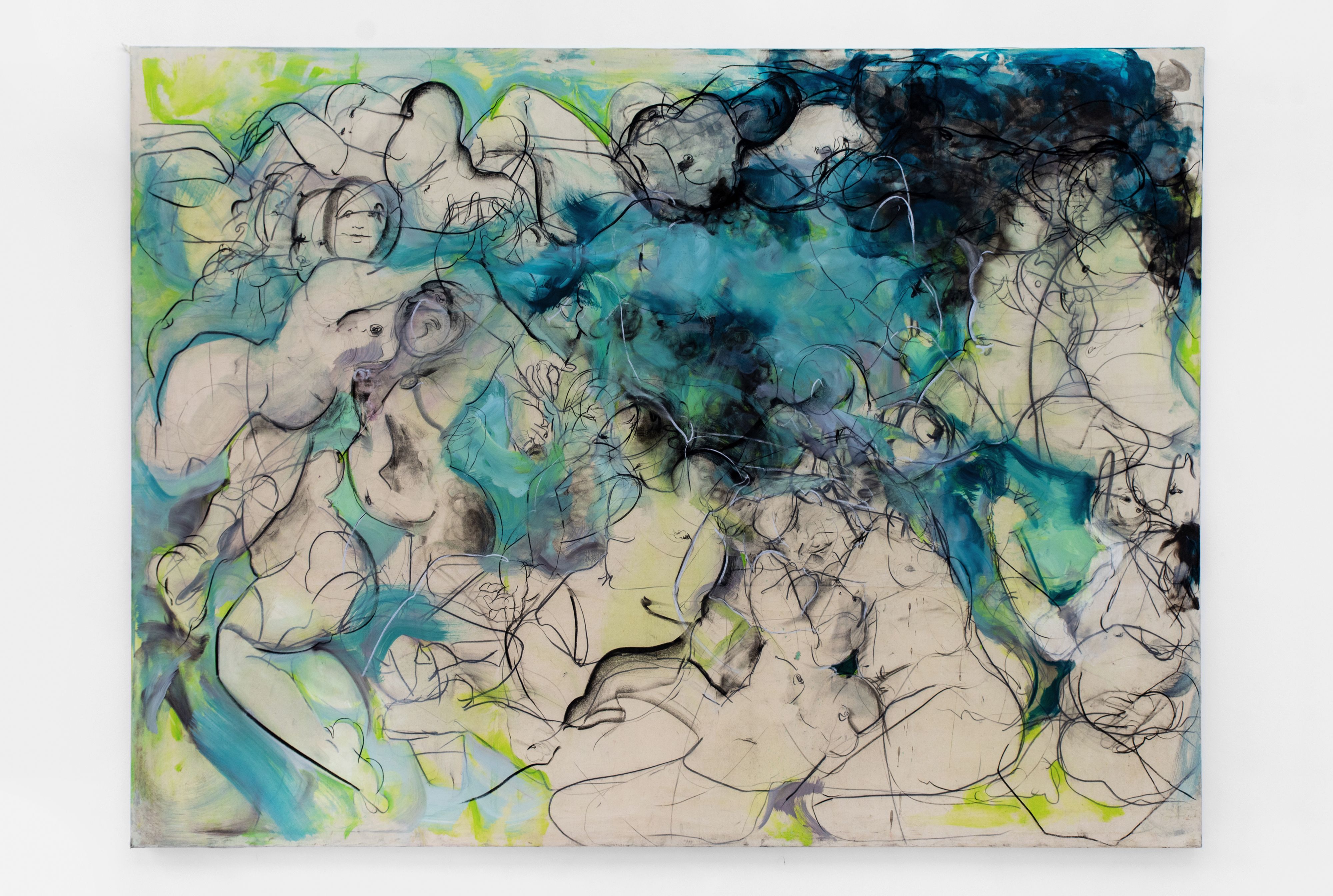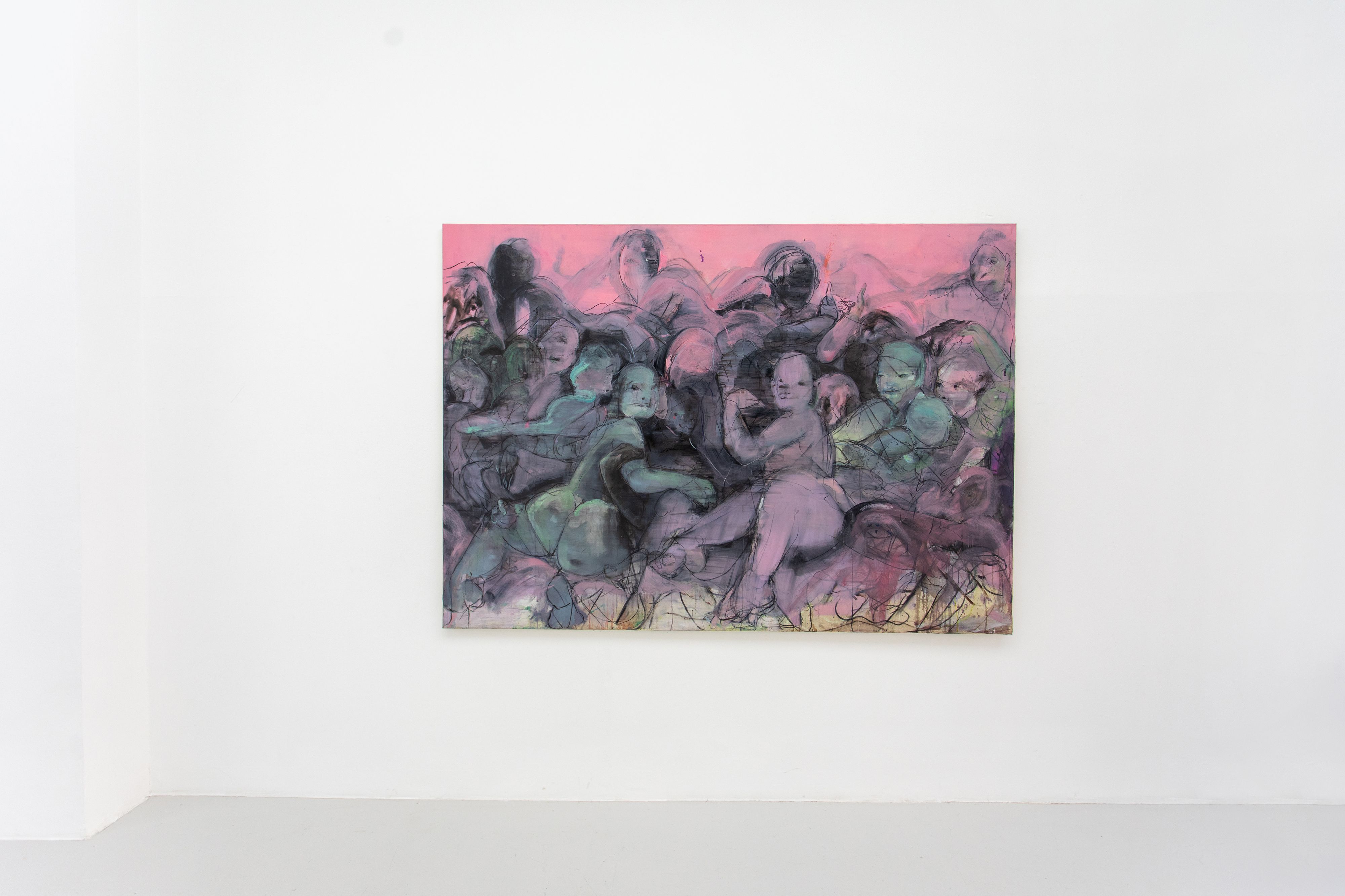 Painted with oil and charcoal on canvas, these intimate moments capture the climax of physical and emotional connection between the subjects.