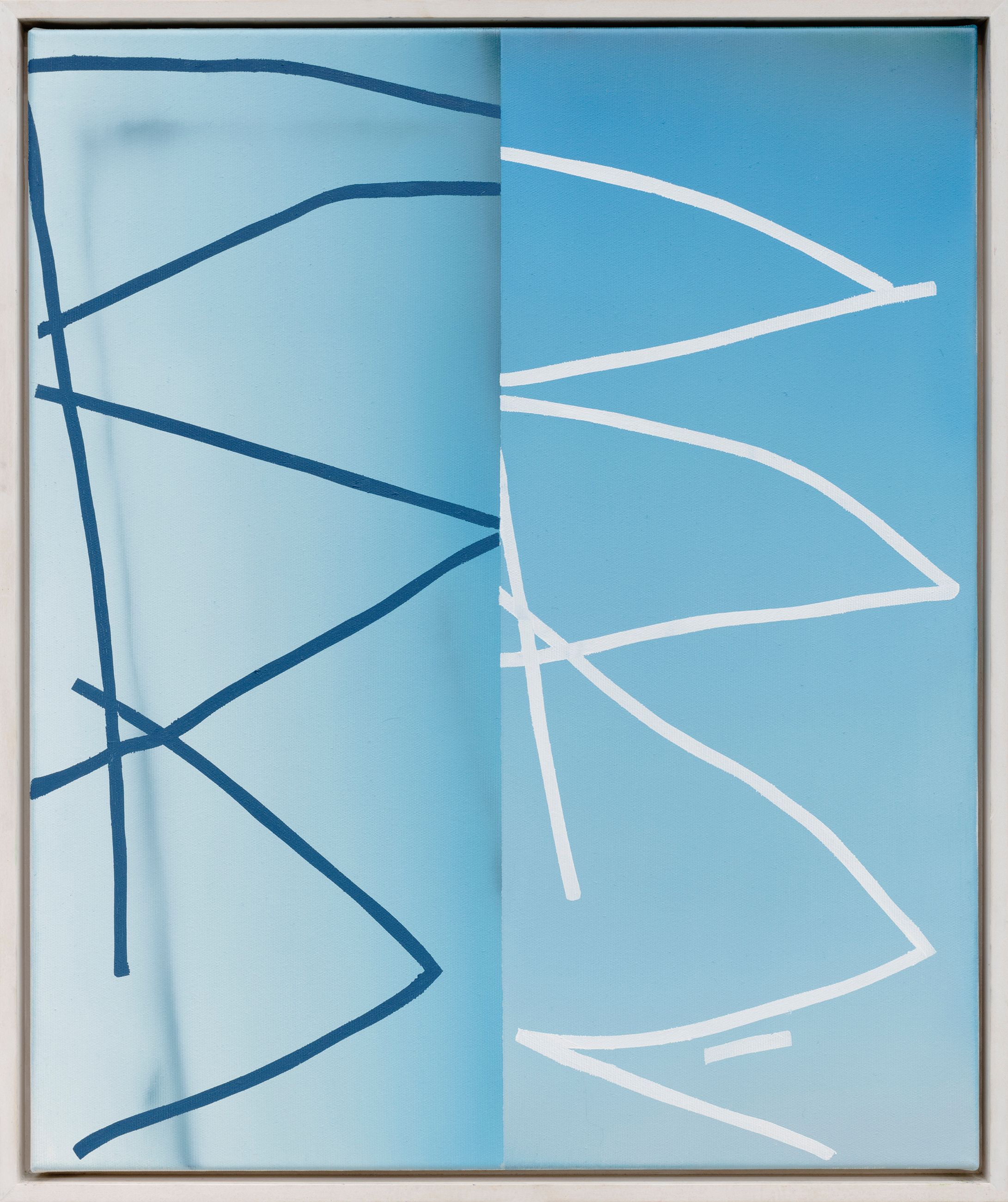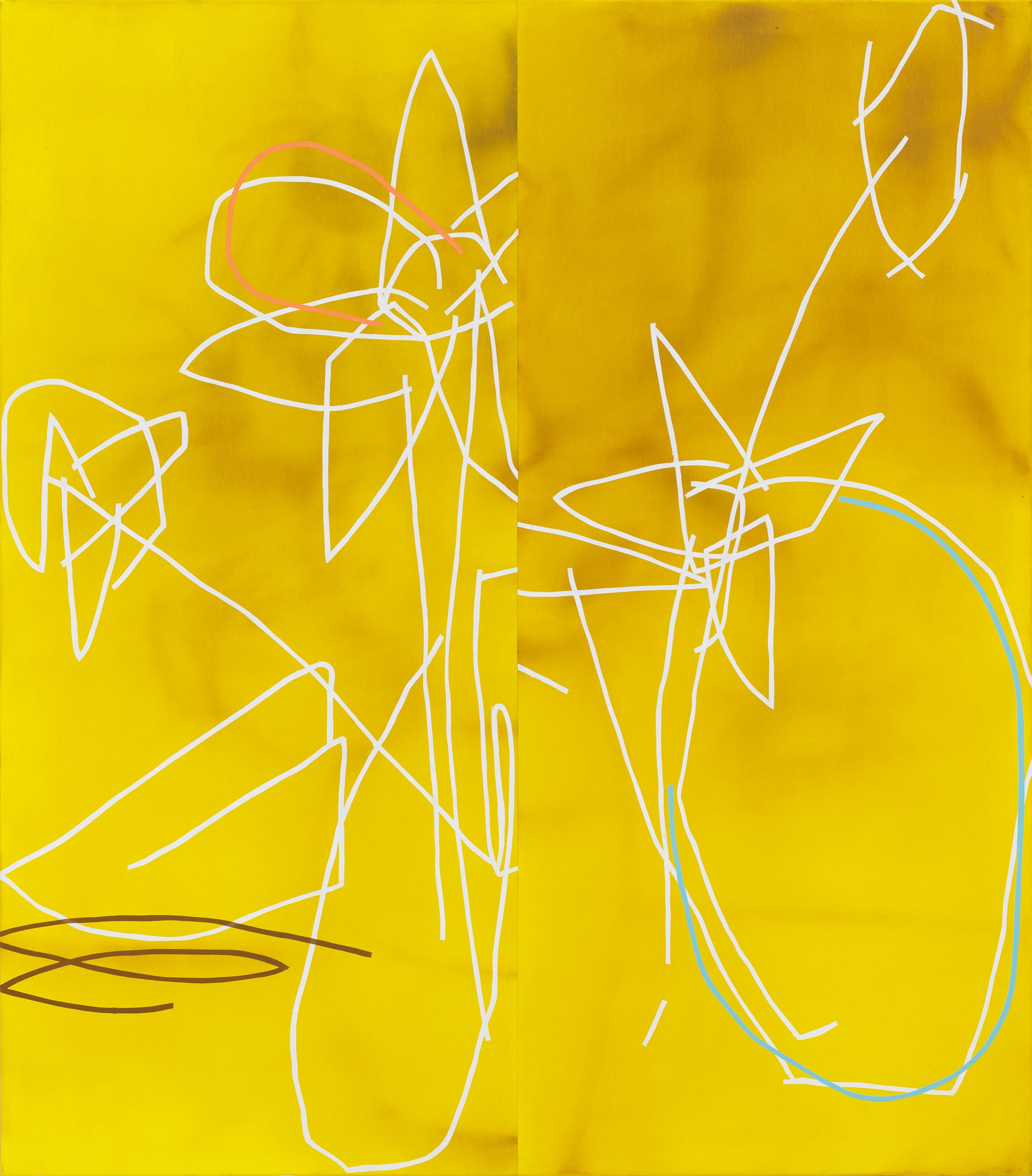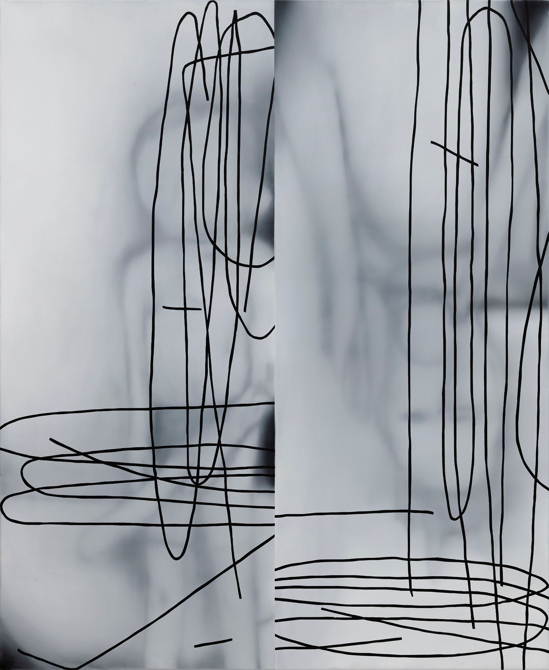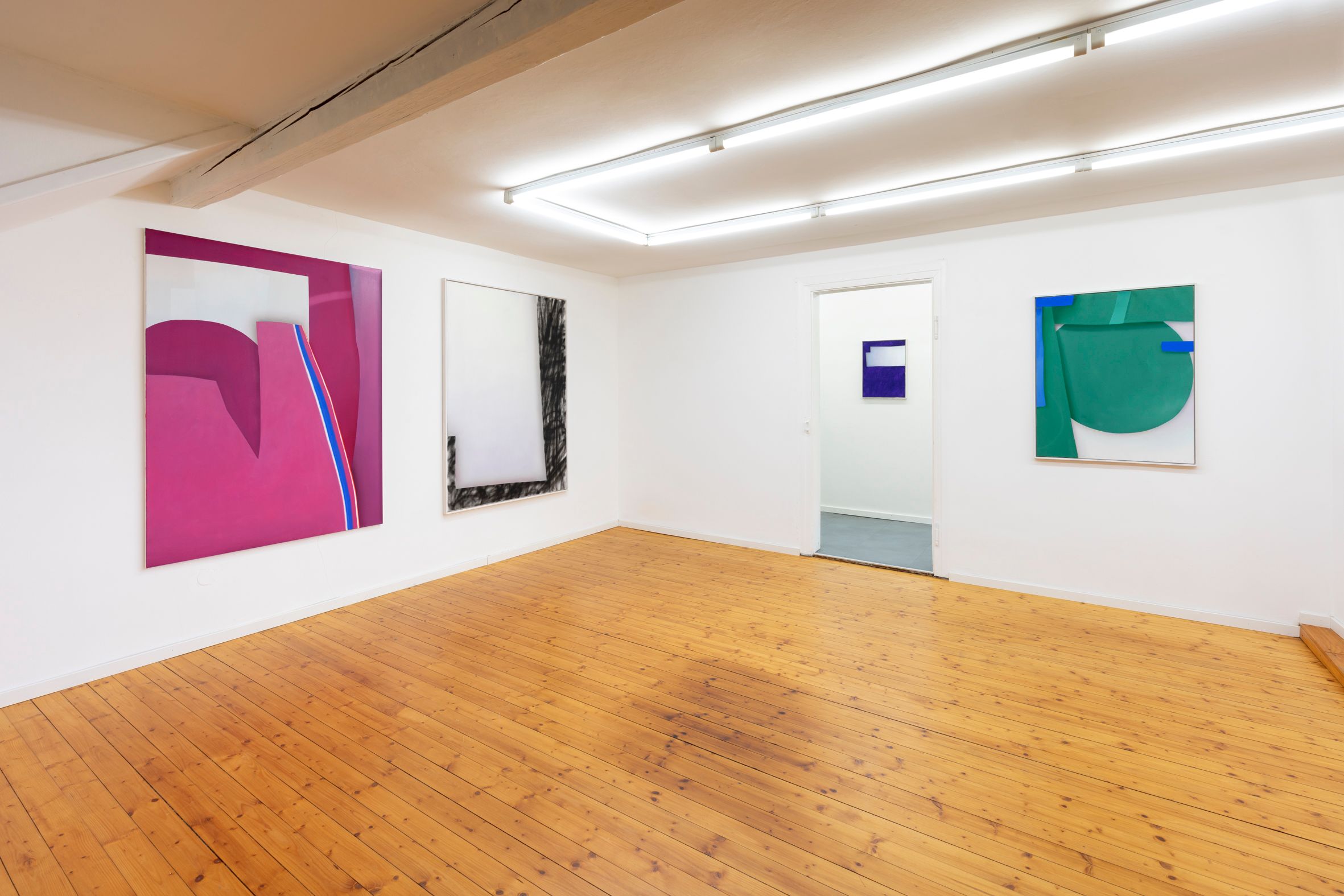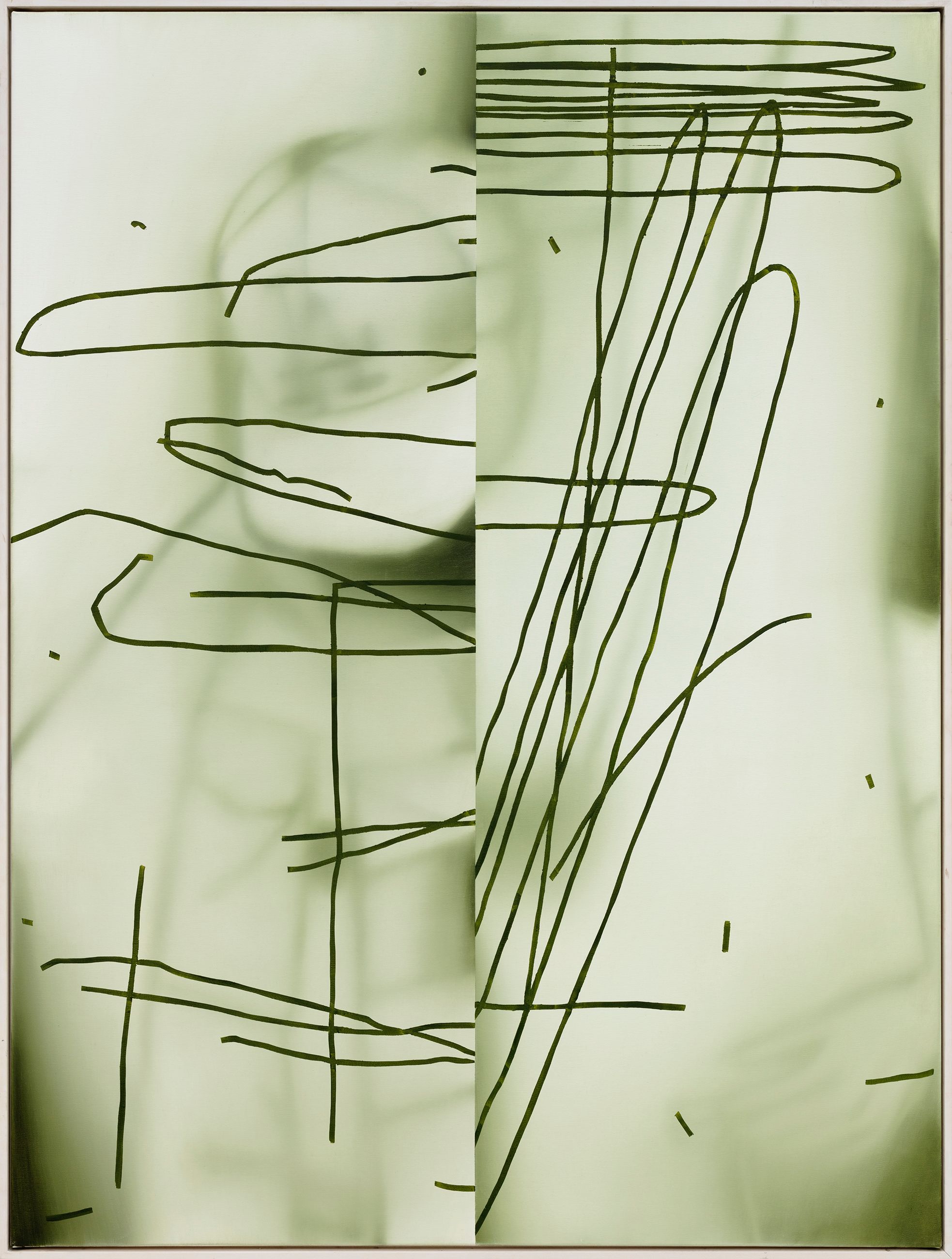 The pictorial motifs are no longer completely detached from any reference to concrete figuration, but question and revolve around it. The line always moves between figuration and abstraction and is in the process of defining surface and space more precisely.