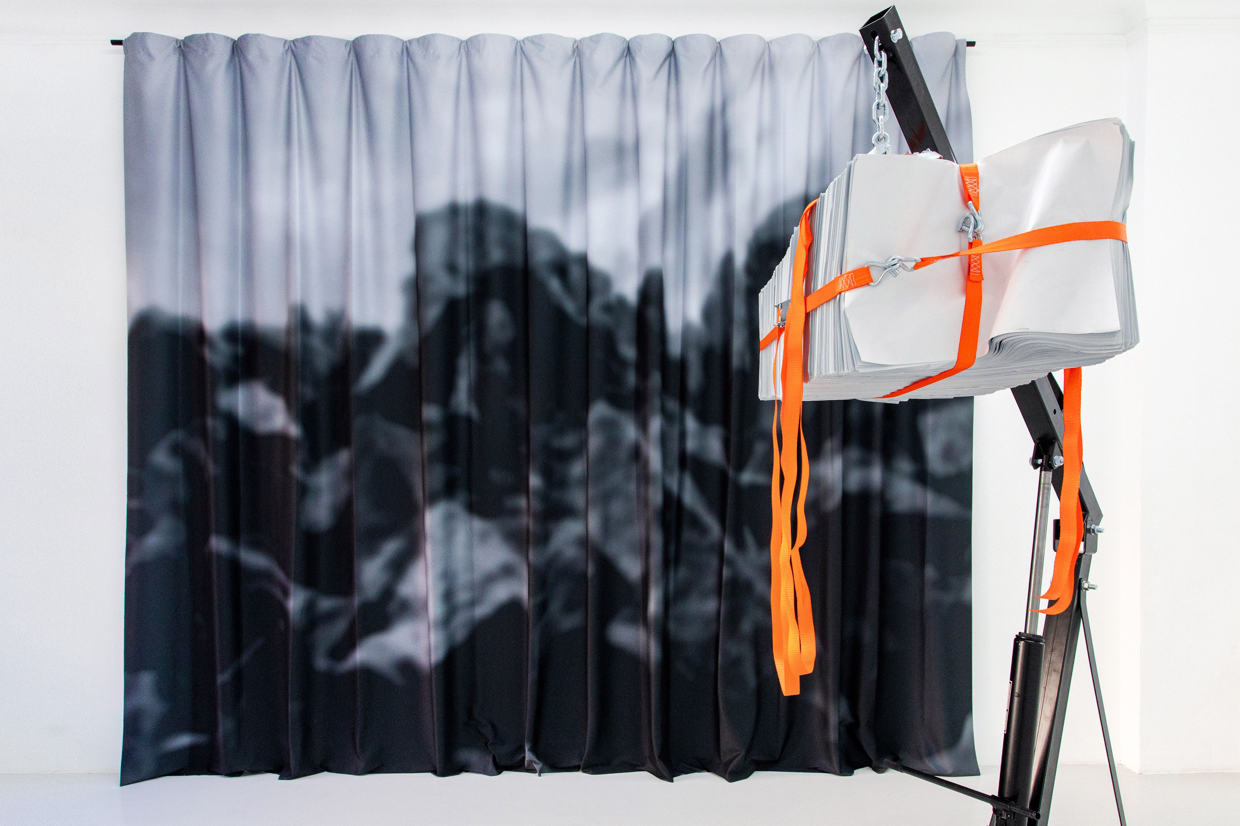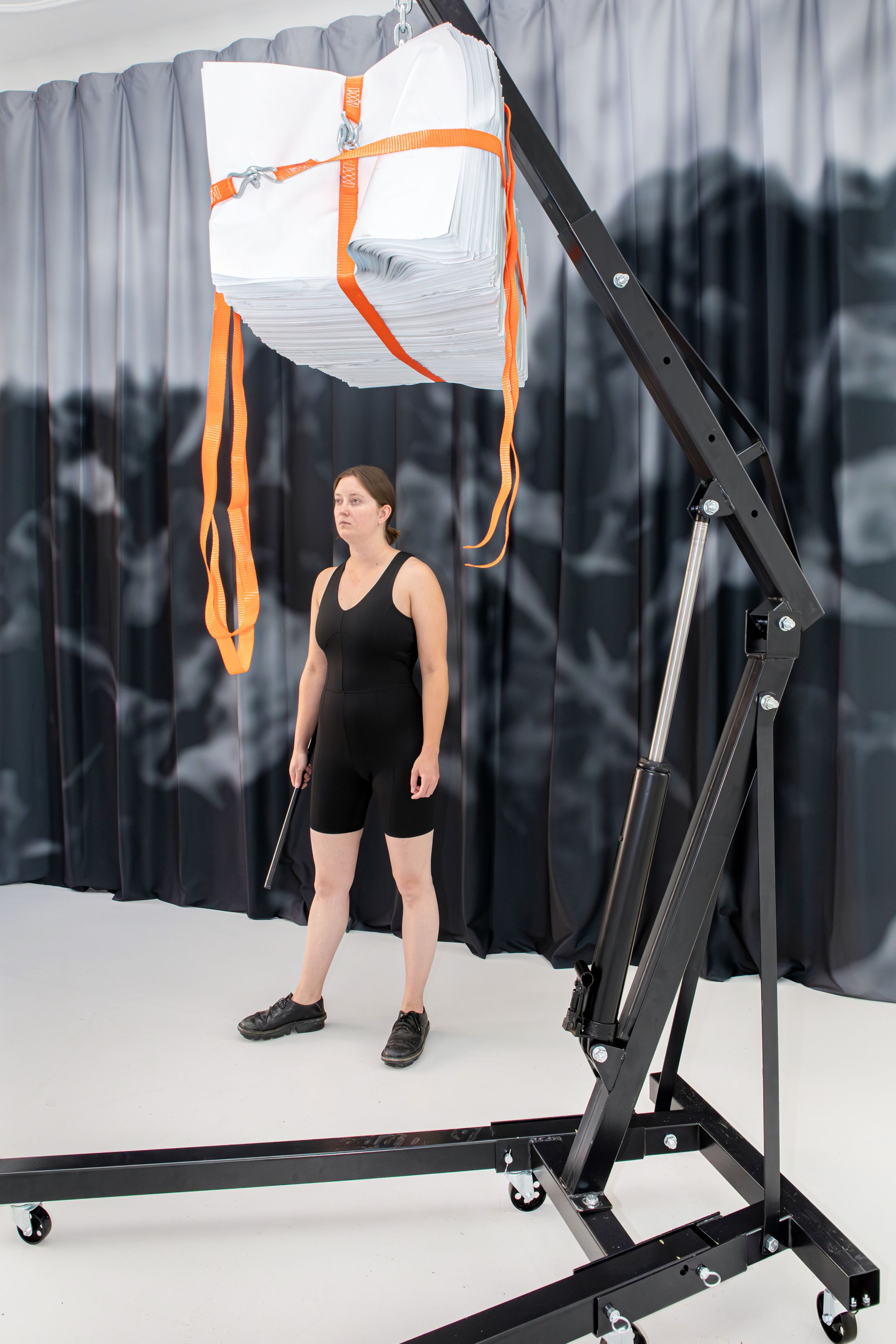 Finja Sander marks the beginning of her solo exhibition with a live performance in which she explores both the static and transformational potential of the concept of monument. A mobile crane serves as the artist's tool for heaving massive cuboids of paper into the air and ultimately keeping them suspended. The artist has already used the poster convolutions with the inscription Für Morgen (For Tomorrow), lashed together with tension belts, in several previous performances and sculptural settings. The phrase refers to the multimedia work series of the same name, Für Morgen, which Sander has been continuing since the beginning of 2023. The heavy paper cuboids that hang in the air far above Sander's head at the end of the performance are reminiscent of images of deconstructed, or destroyed, monuments: the severed, stone head of Lenin, or, more recently, the removal of Soviet memorials in Ukraine.