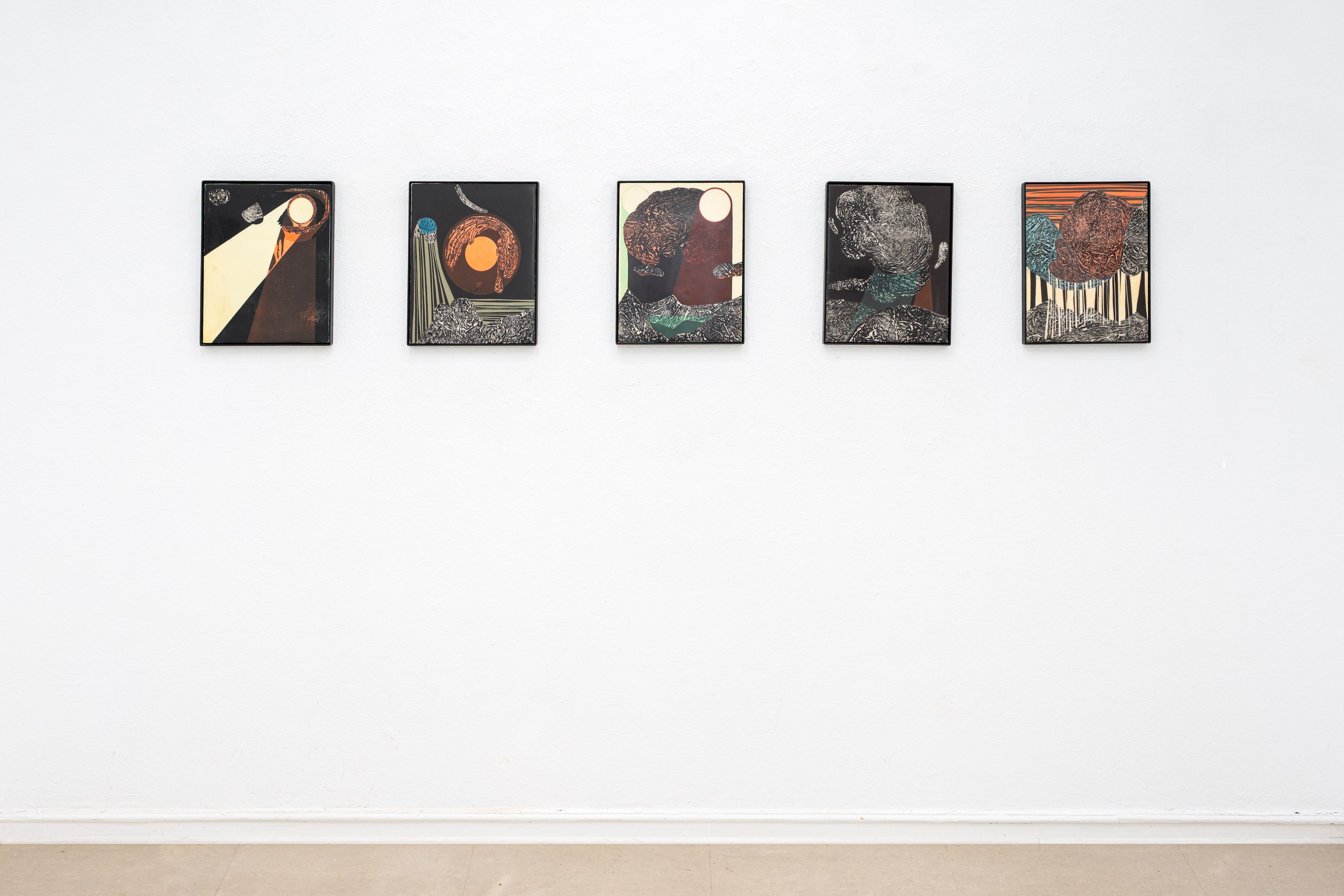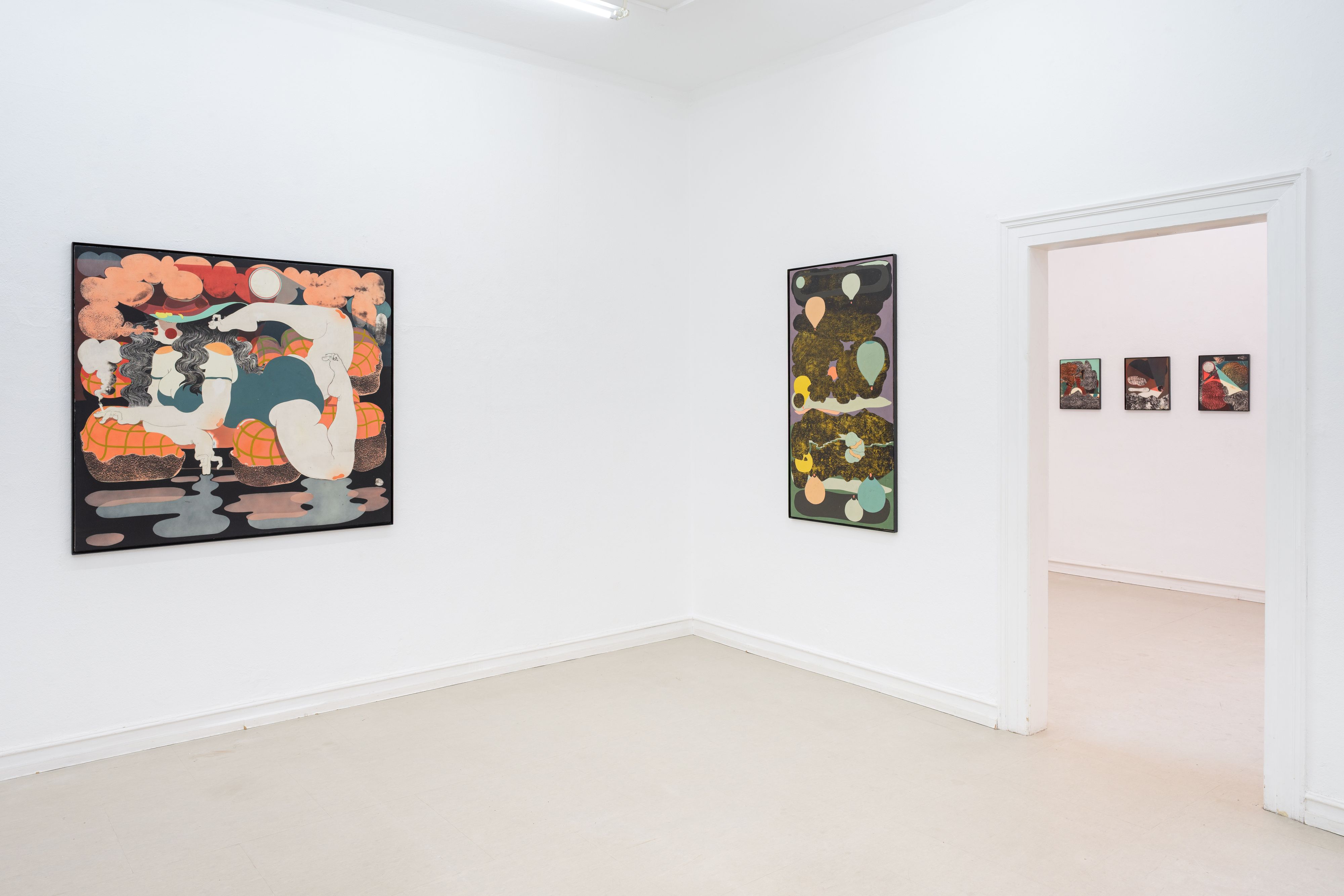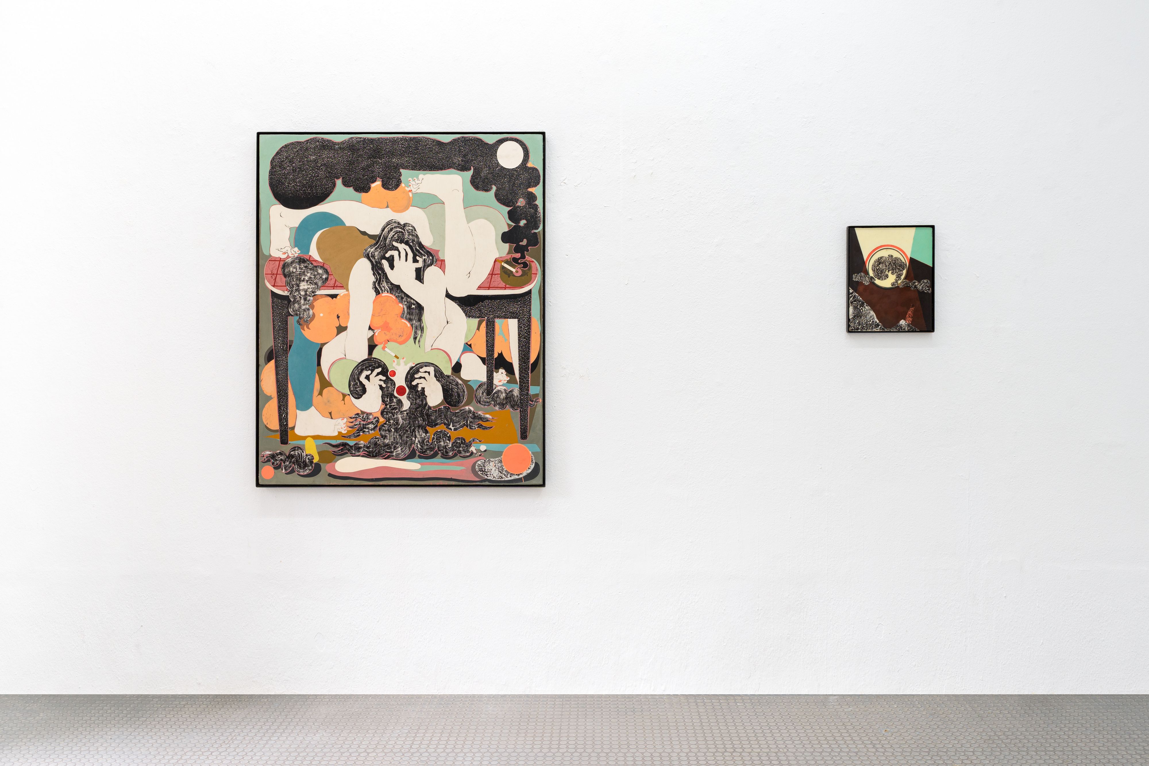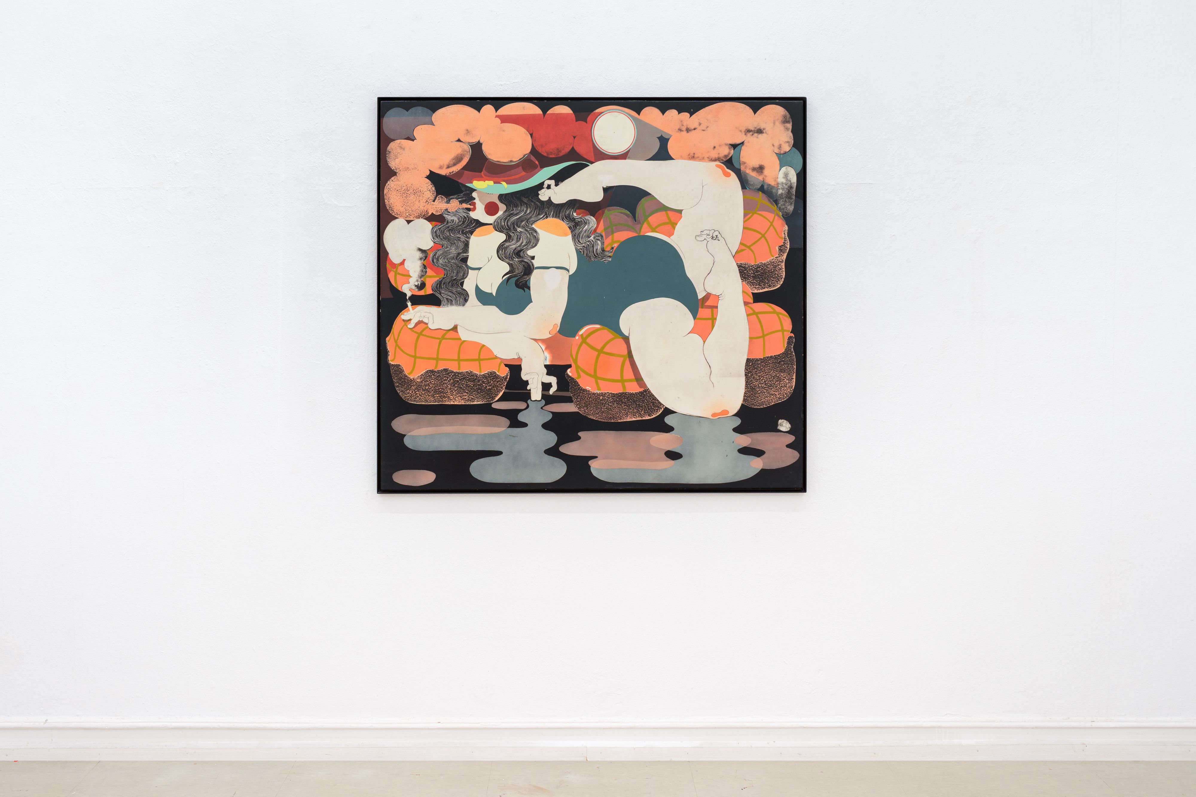 The compositions in Alex Feuerstein's paintings show abstract scenes that oscillate between fiction and reality. Banal perspectives change into dream-like sequences that are left so wide open and alienated that they can neither be clearly assigned in time nor in space: Is it the sun that shines there or perhaps the moon after all? Are the bizarrely billowing loops plumes of smoke or thunderclouds?