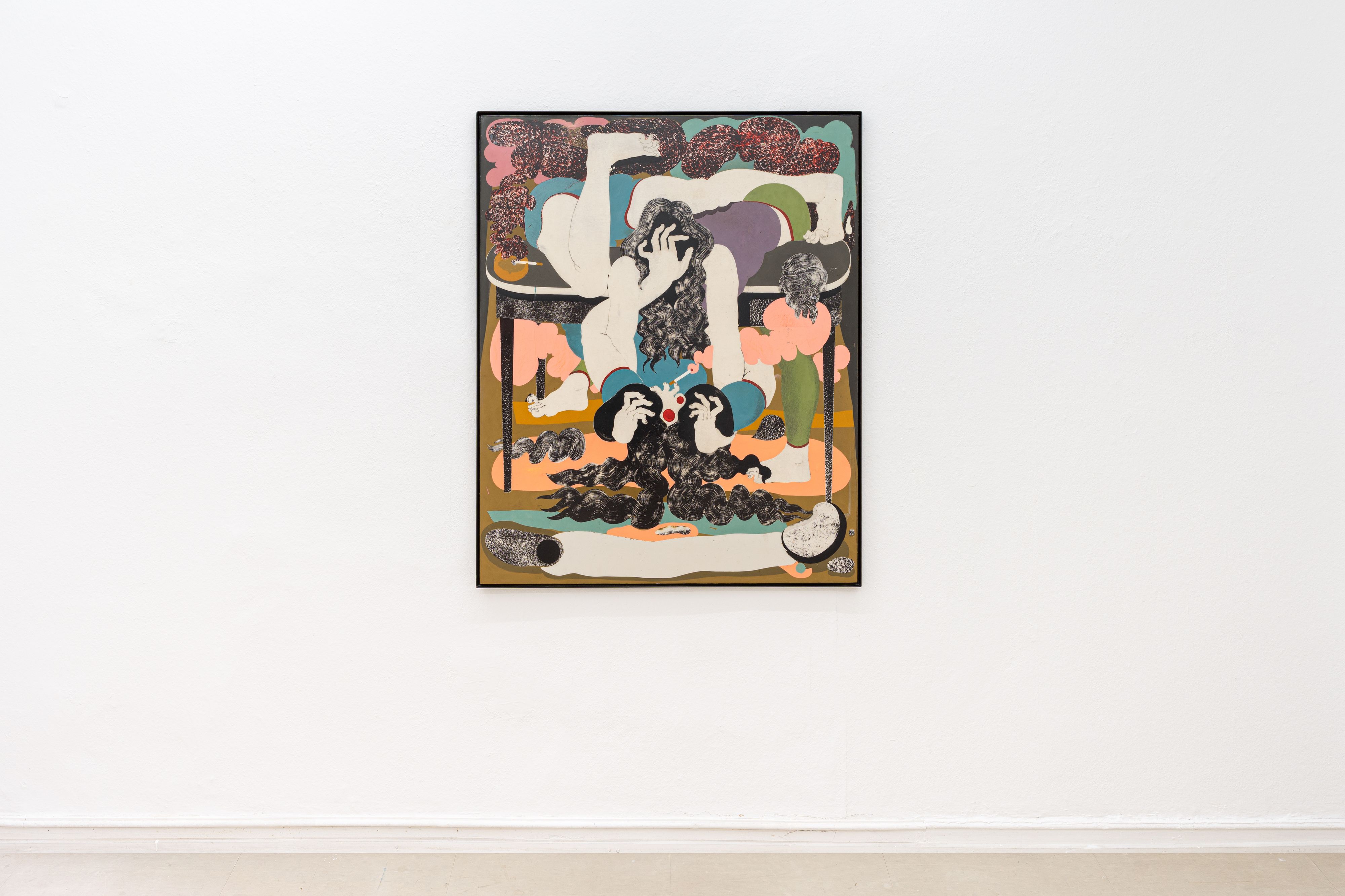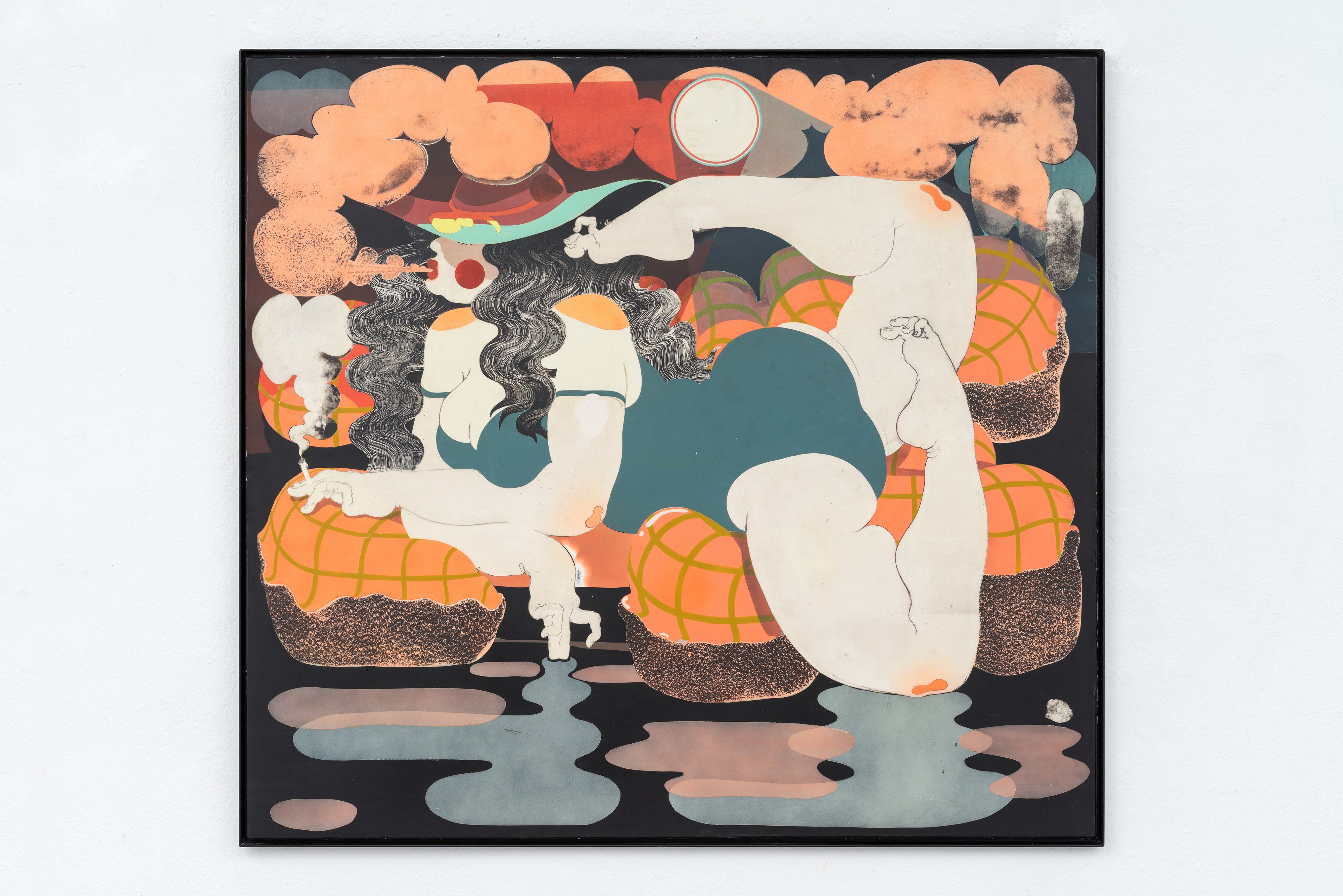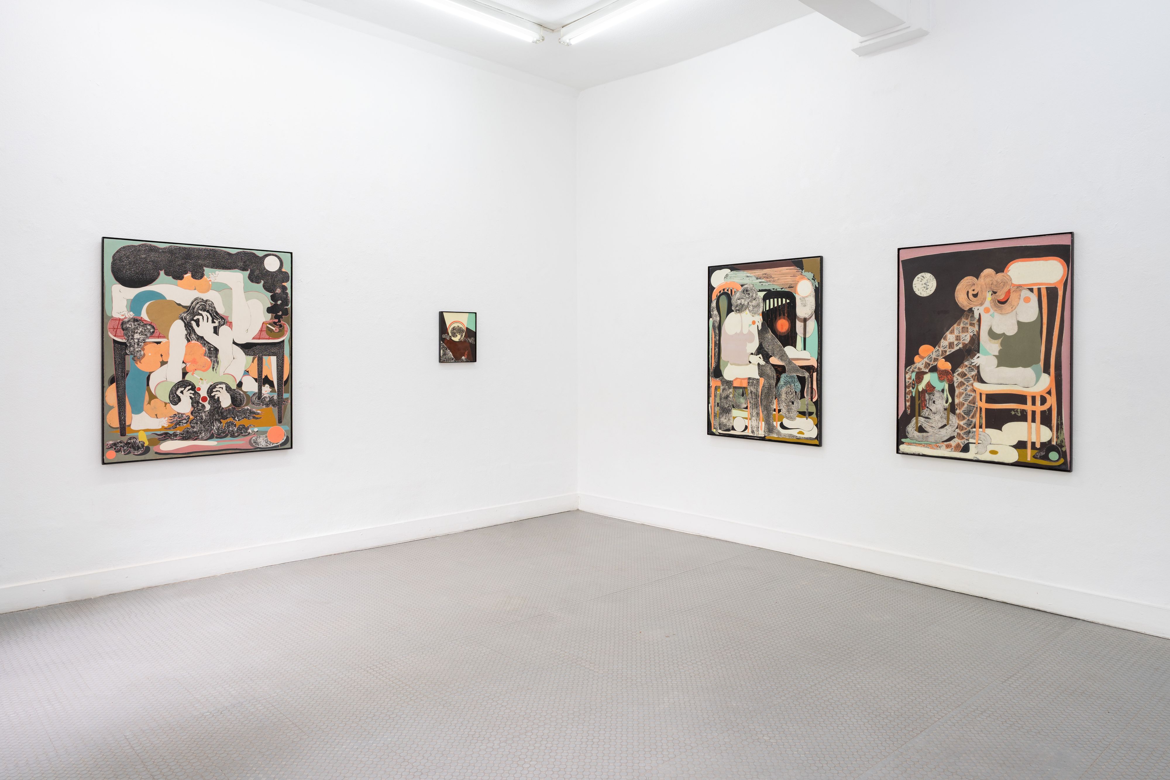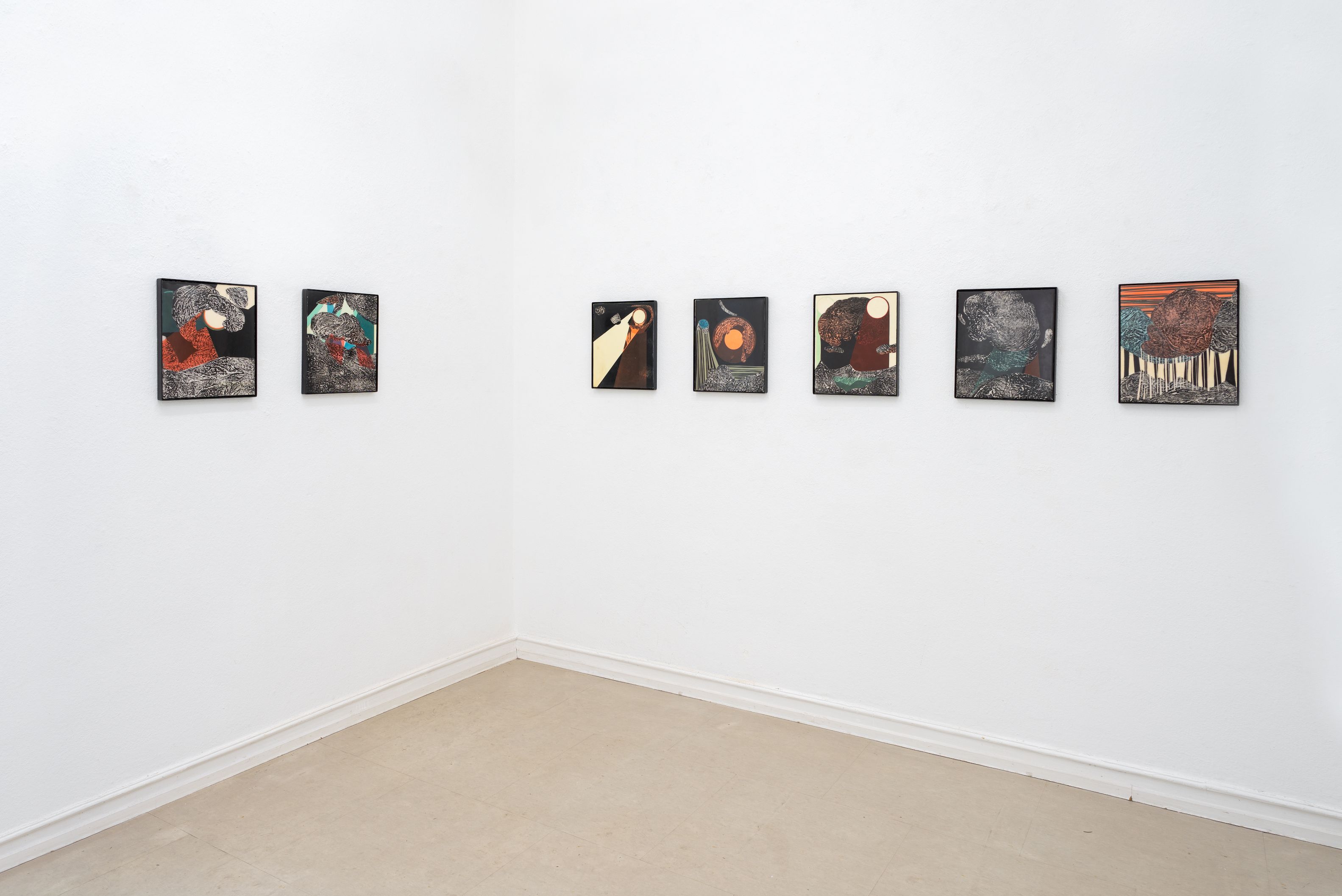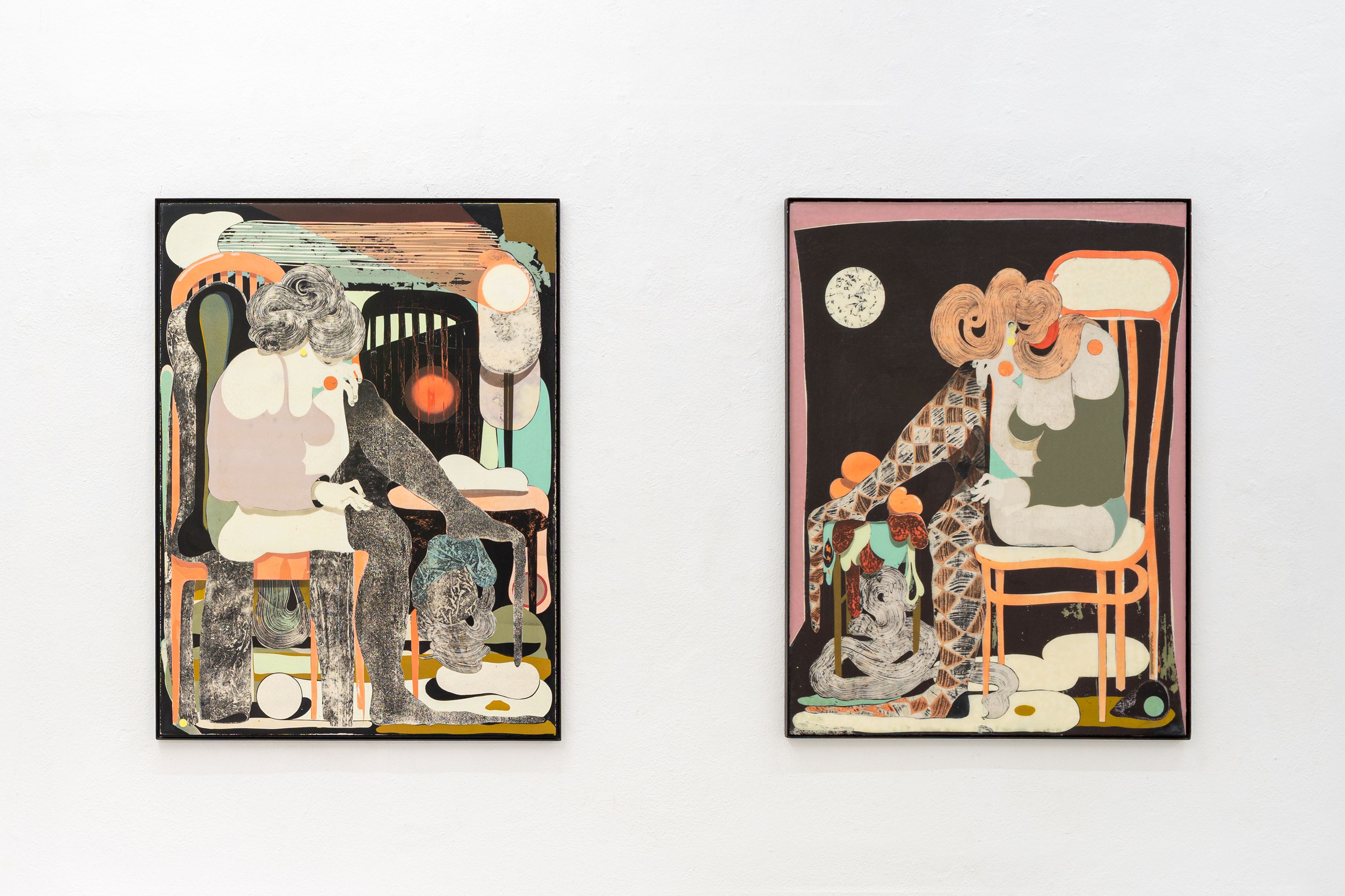 The compositions in Alex Feuerstein's paintings show abstract scenes that oscillate between fiction and reality. Banal perspectives change into dream-like sequences that are left so wide open and alienated that they can neither be clearly assigned in time nor in space: Is it the sun that shines there or perhaps the moon after all? Are the bizarrely billowing loops plumes of smoke or thunderclouds?