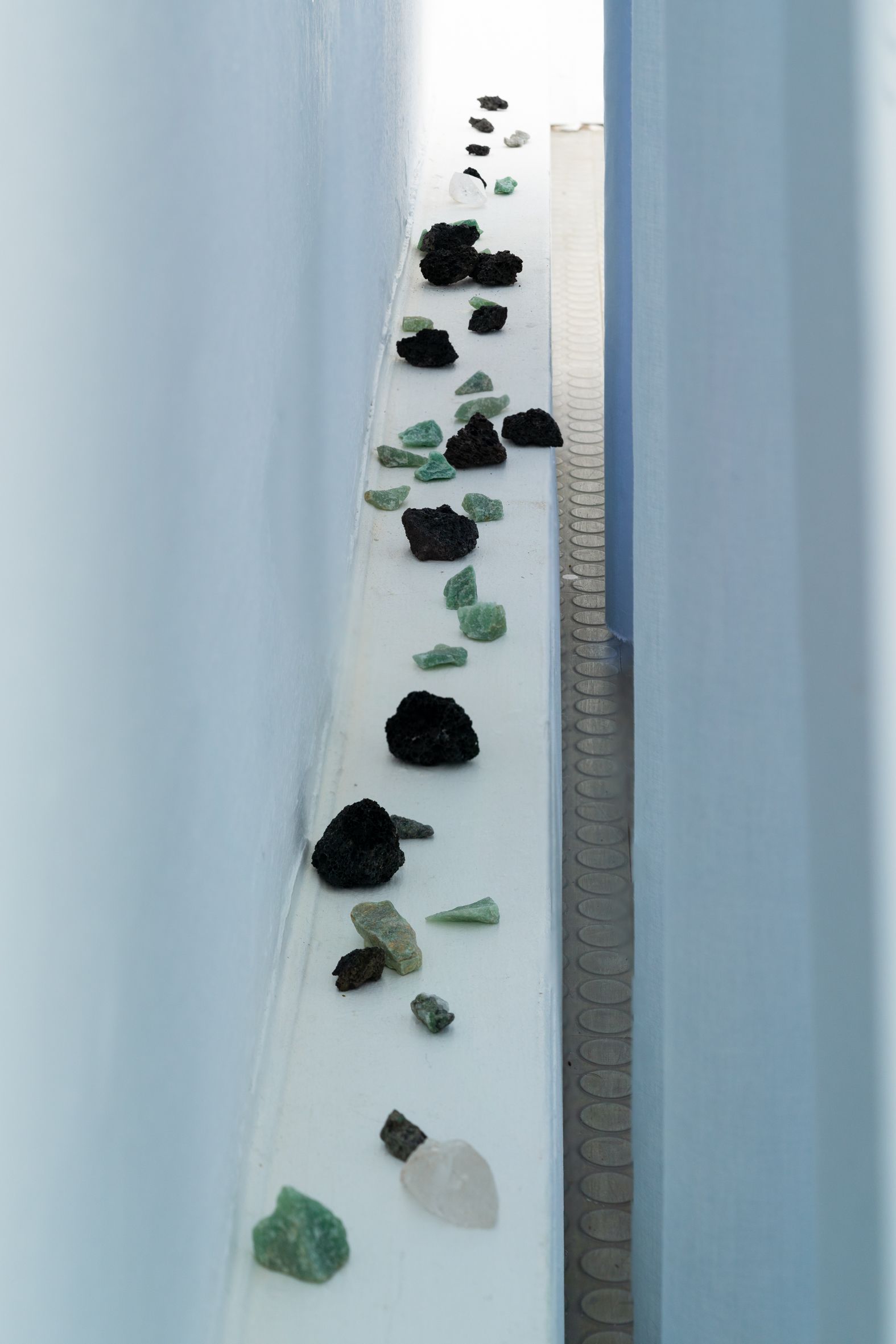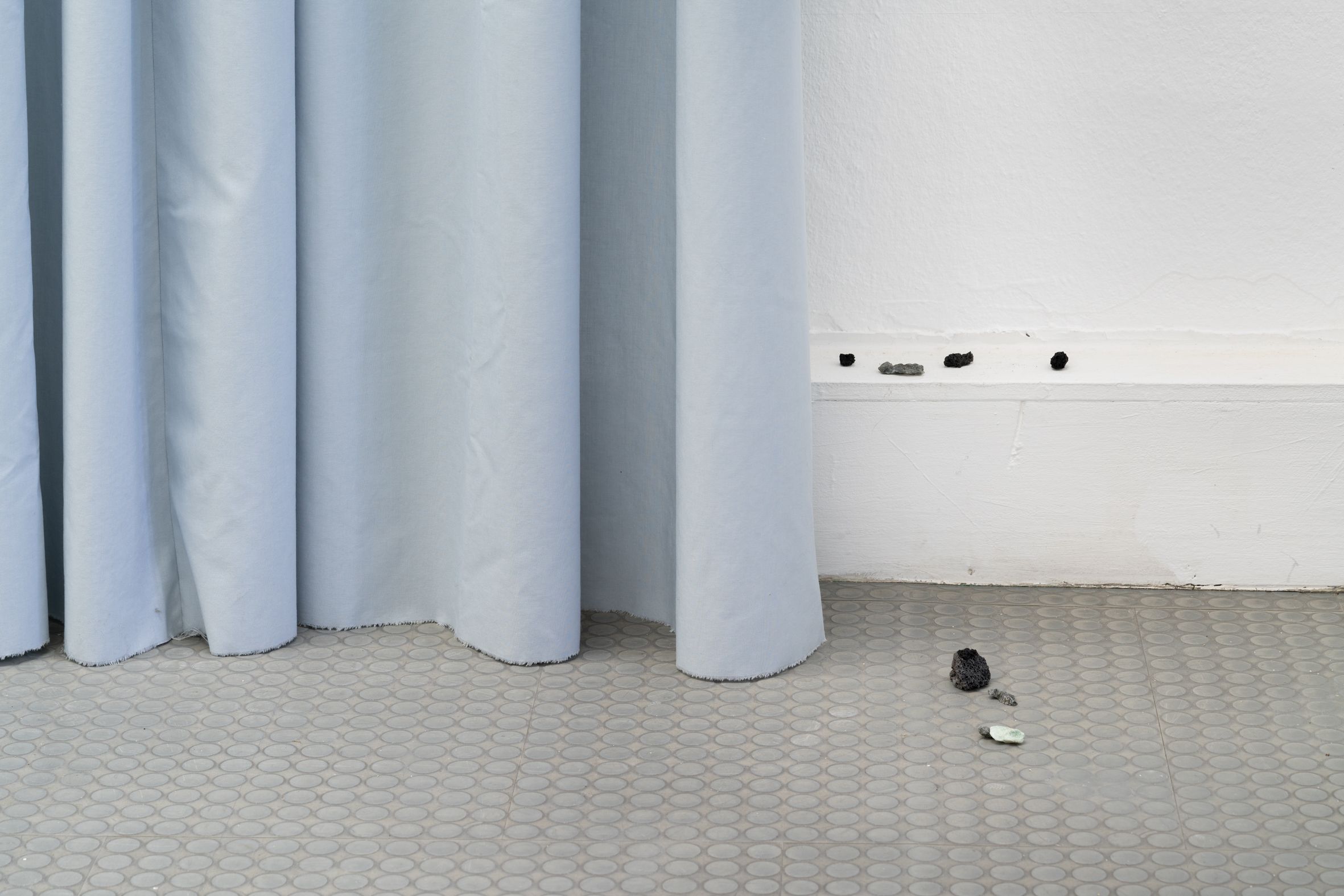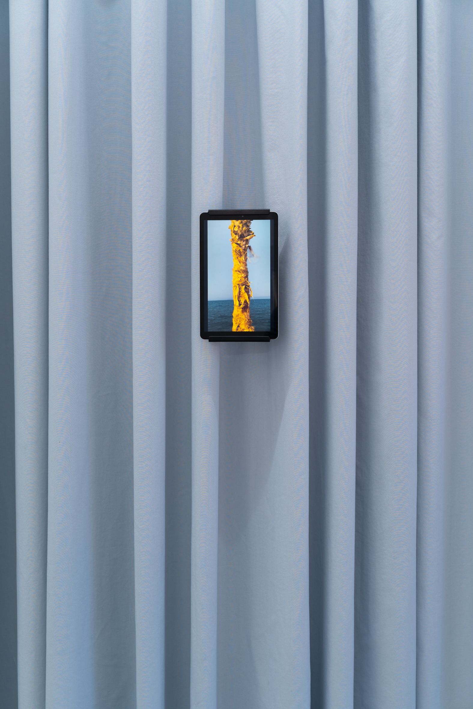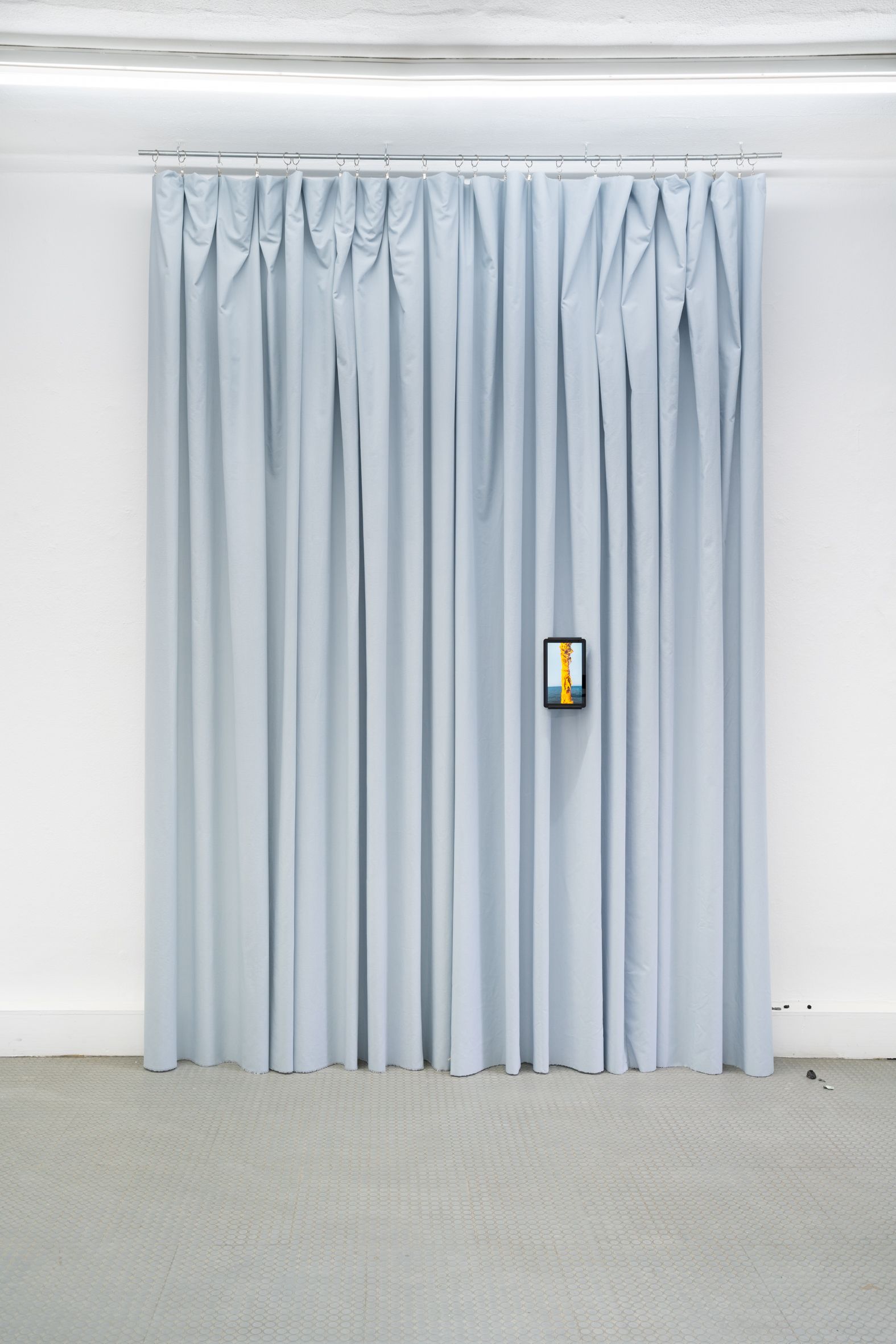 Her work endless memory is a curtain installation featuring an integrated video loop. The moving image depicts the endlessly swaying tip of a palm tree trunk—a quiet, almost meditative recollection of a fleeting moment.