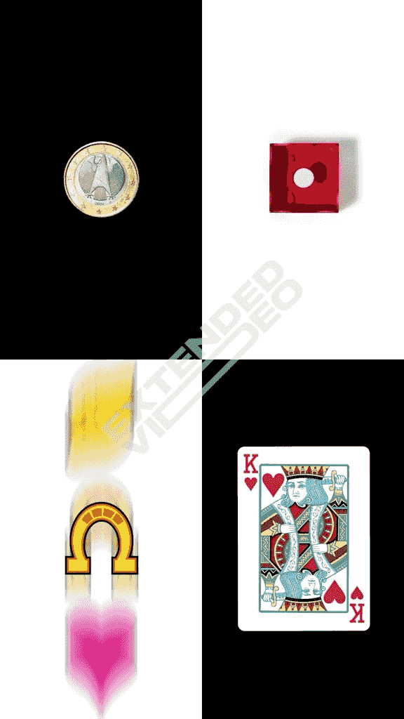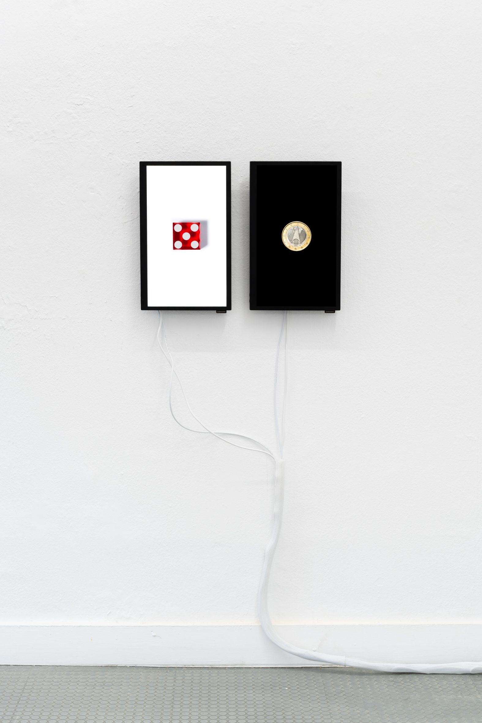 LUCK is a video installation by Kilian Kretschmer consisting of fast-paced loops: COIN, DICE, SLOT, and CARD, inviting viewers to engage interactively through photography-based prompts.