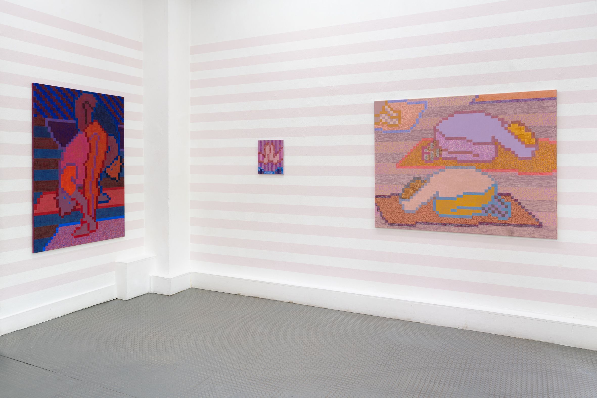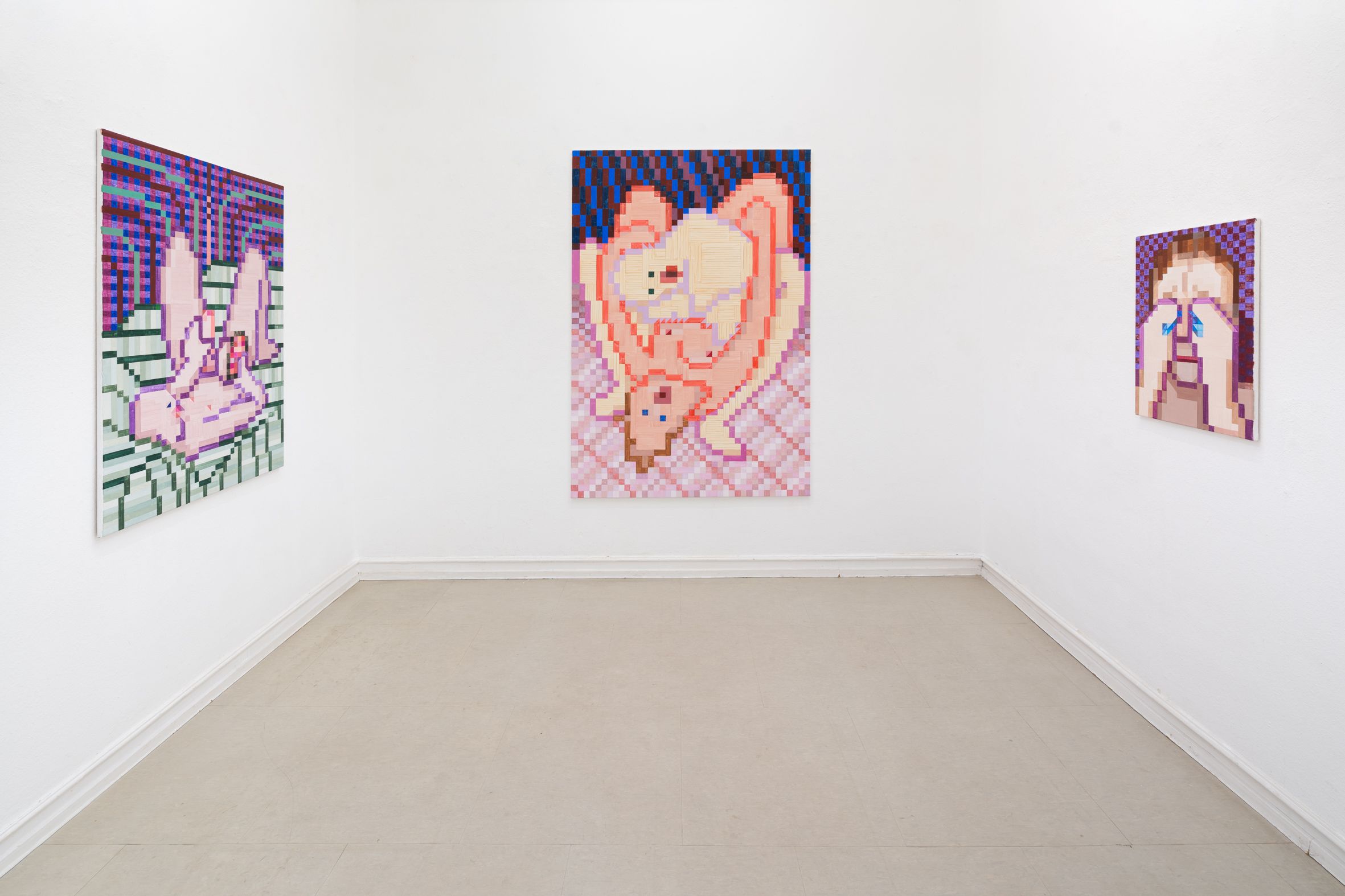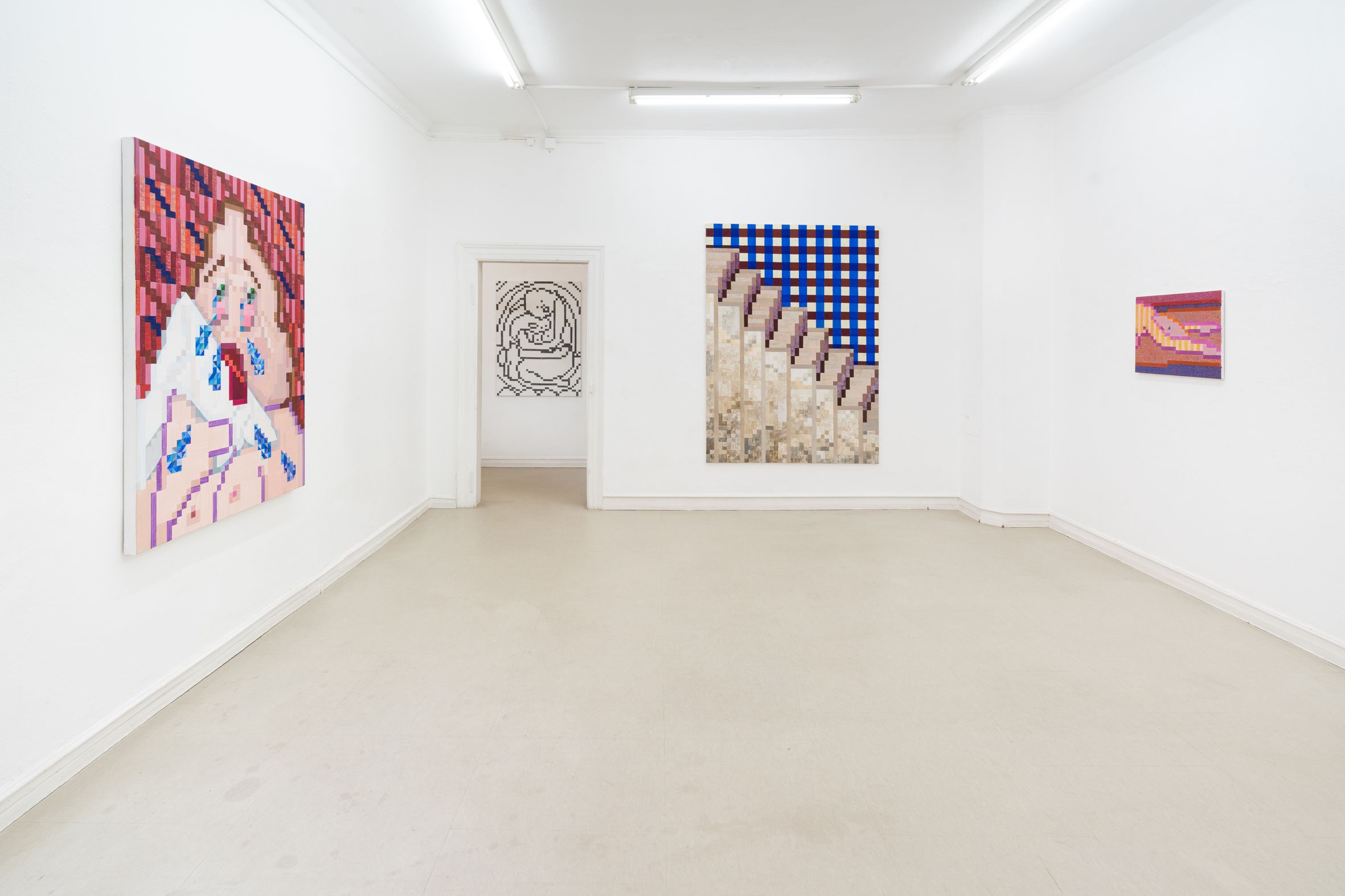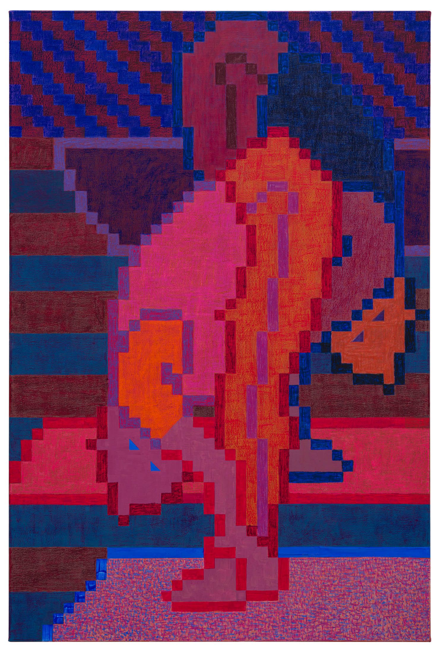 In her Staircase series, the bodies tumble head over heels down the stairs and it almost seems as if the shock, haste and hurry are transferred to the texture of the painting. Instead of a smooth motif, the paintings are made up of a multitude of pixels, similar to those found in digital images. The pixelation creates a field of tension between figuration and abstraction. This can be observed particularly impressively in the contour lines, which frame the physicality of the figures, but at the same time emerge as many individual areas of colour that no longer form a continuous line.