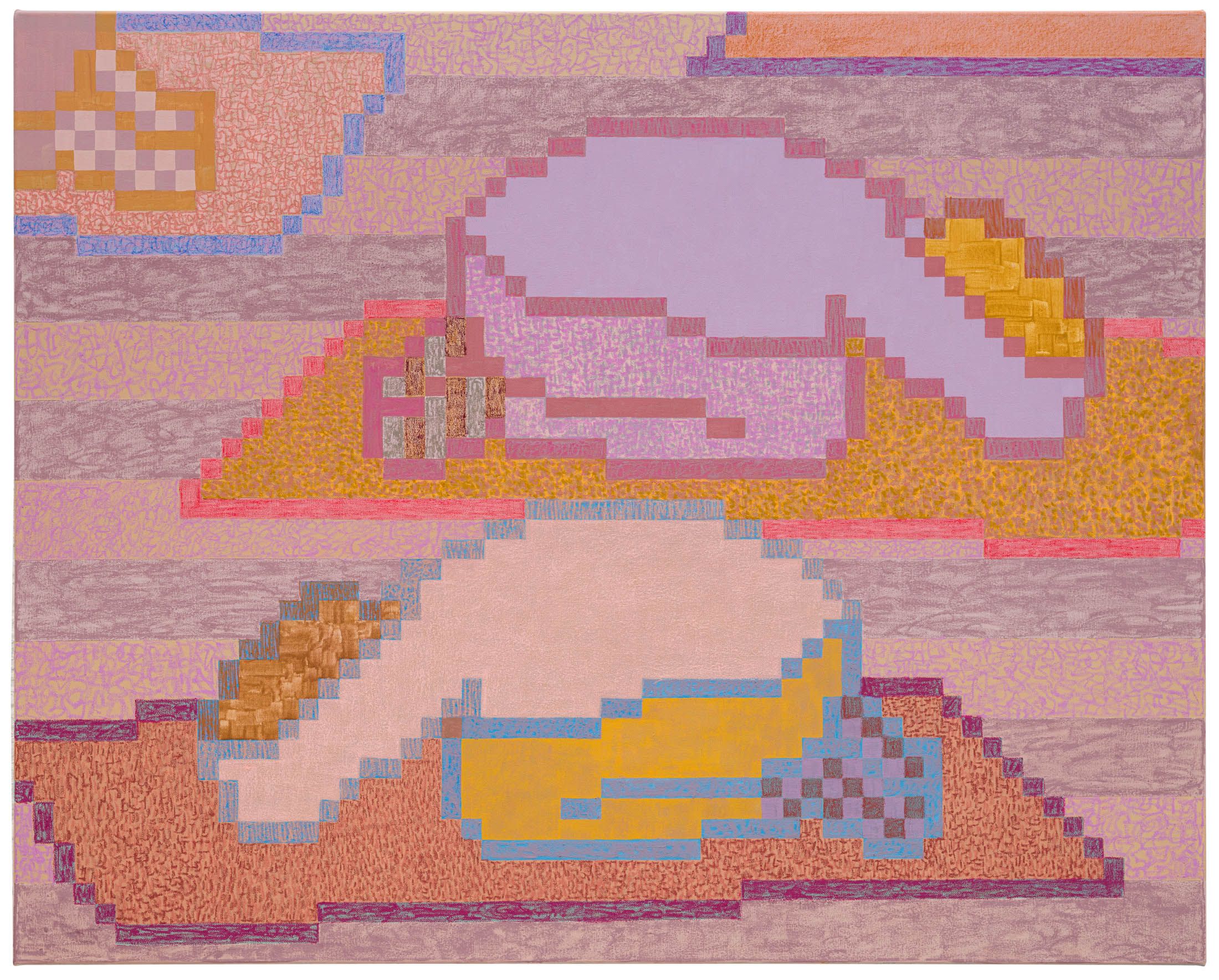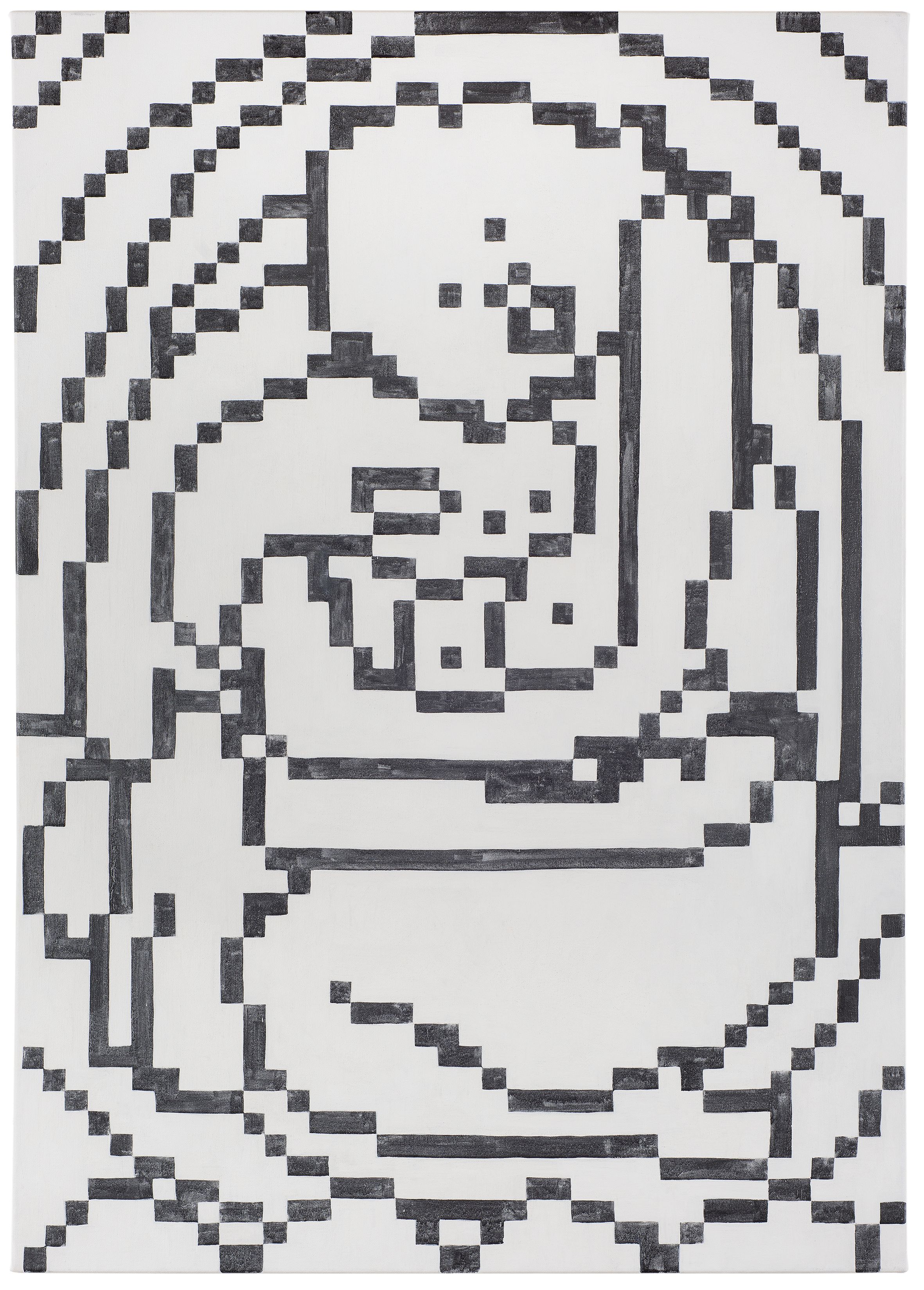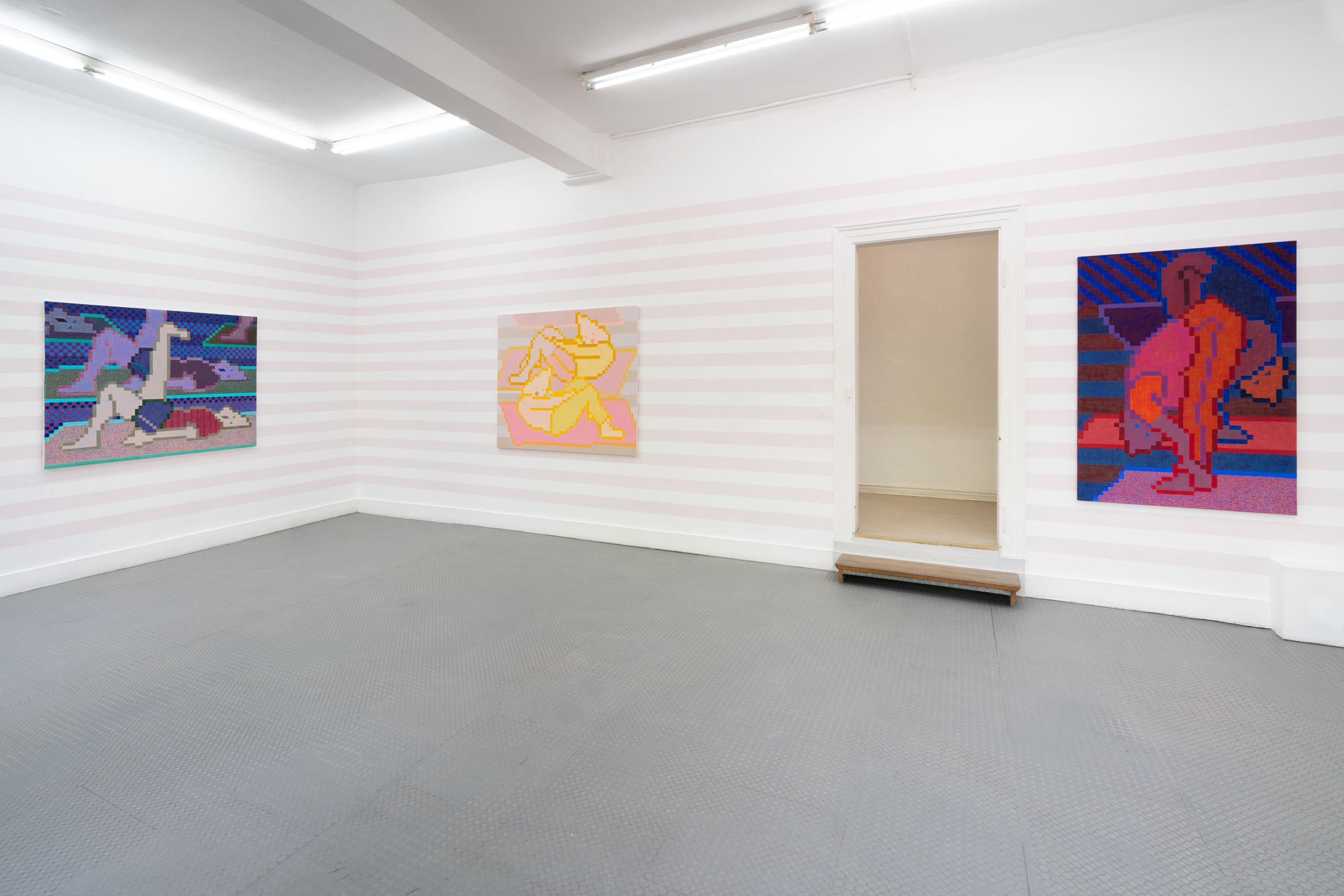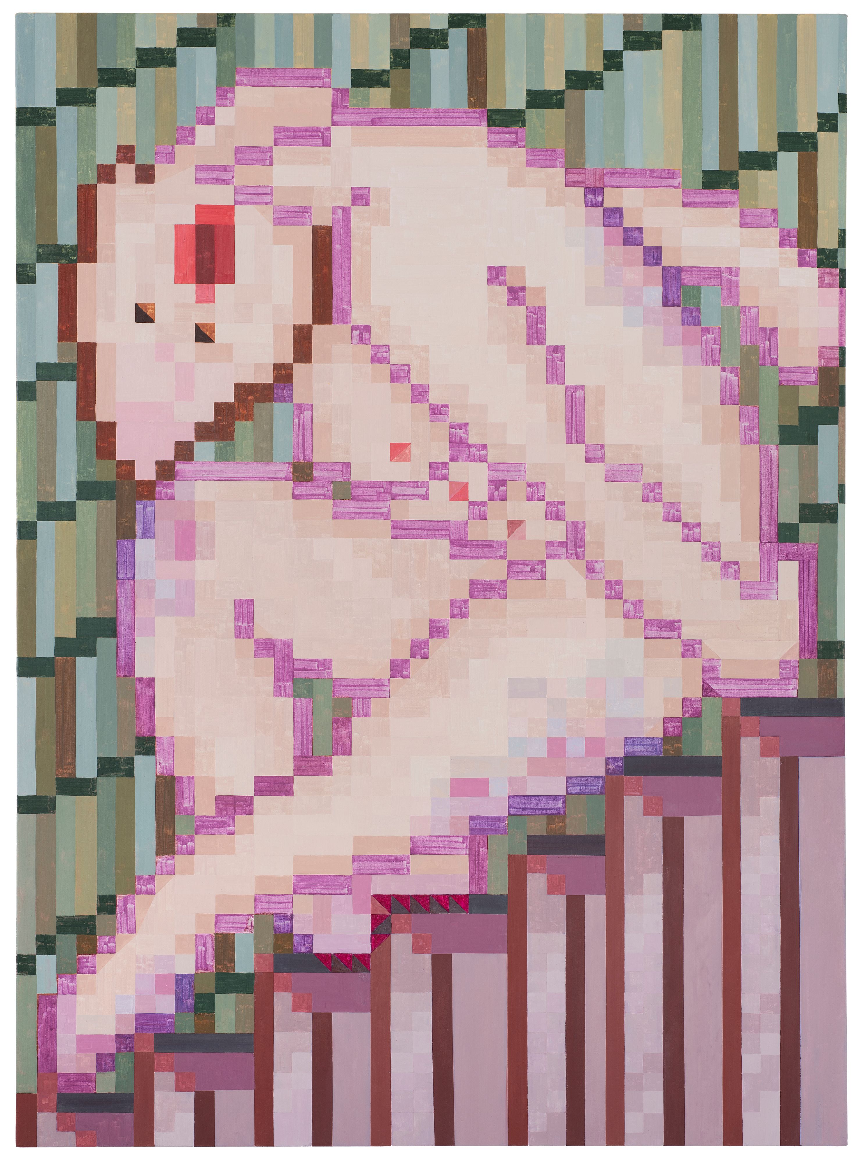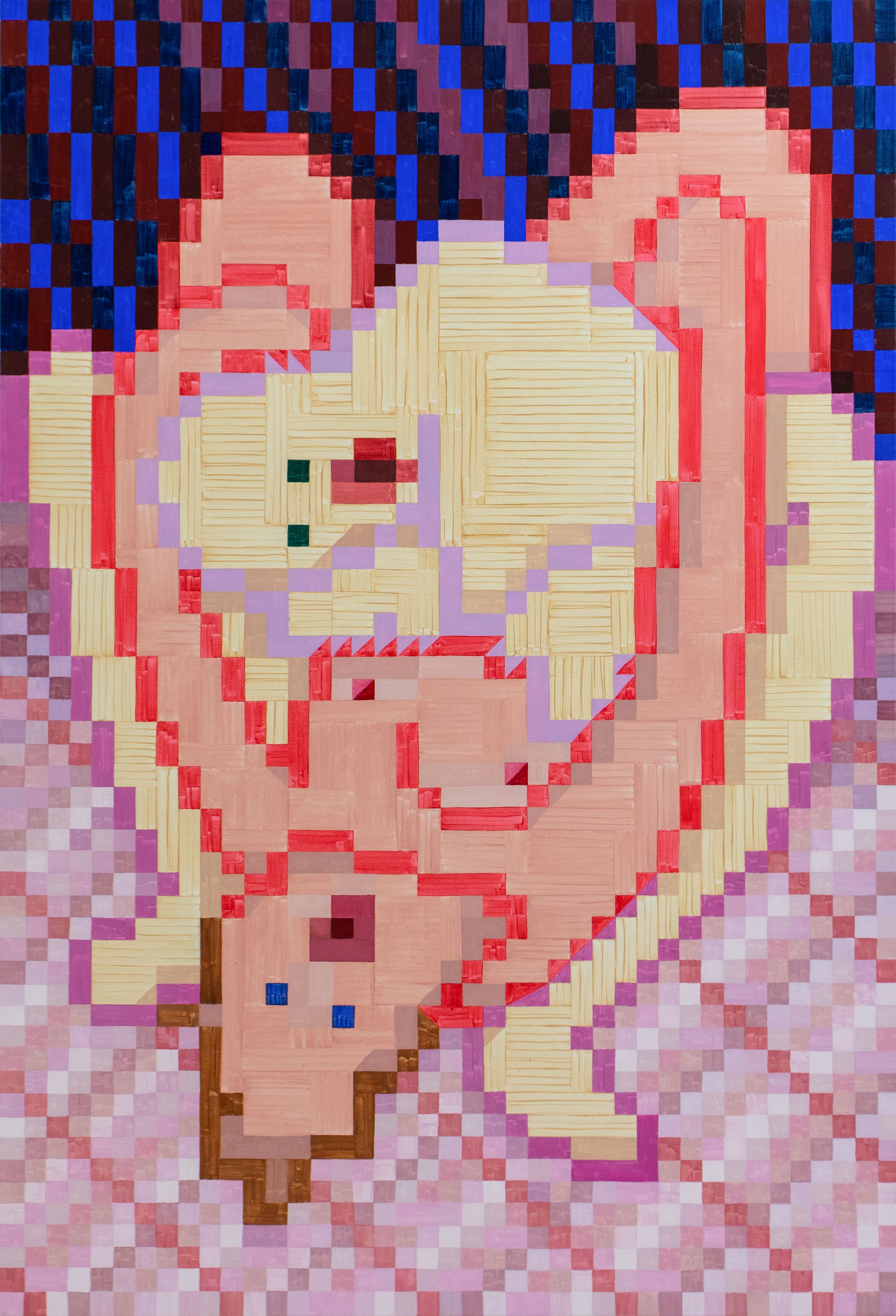 In her Staircase series, the bodies tumble head over heels down the stairs and it almost seems as if the shock, haste and hurry are transferred to the texture of the painting. Instead of a smooth motif, the paintings are made up of a multitude of pixels, similar to those found in digital images. The pixelation creates a field of tension between figuration and abstraction. This can be observed particularly impressively in the contour lines, which frame the physicality of the figures, but at the same time emerge as many individual areas of colour that no longer form a continuous line.