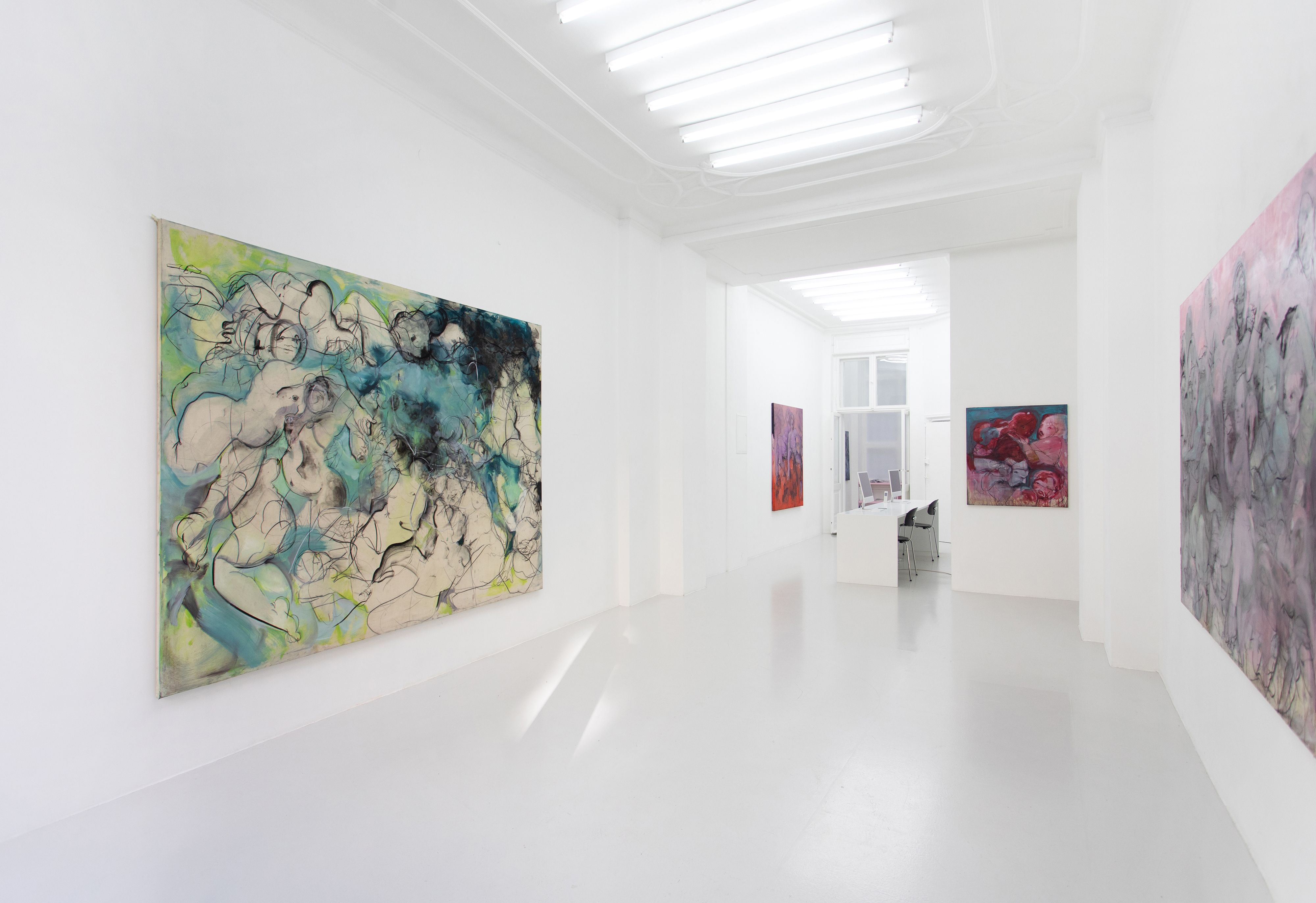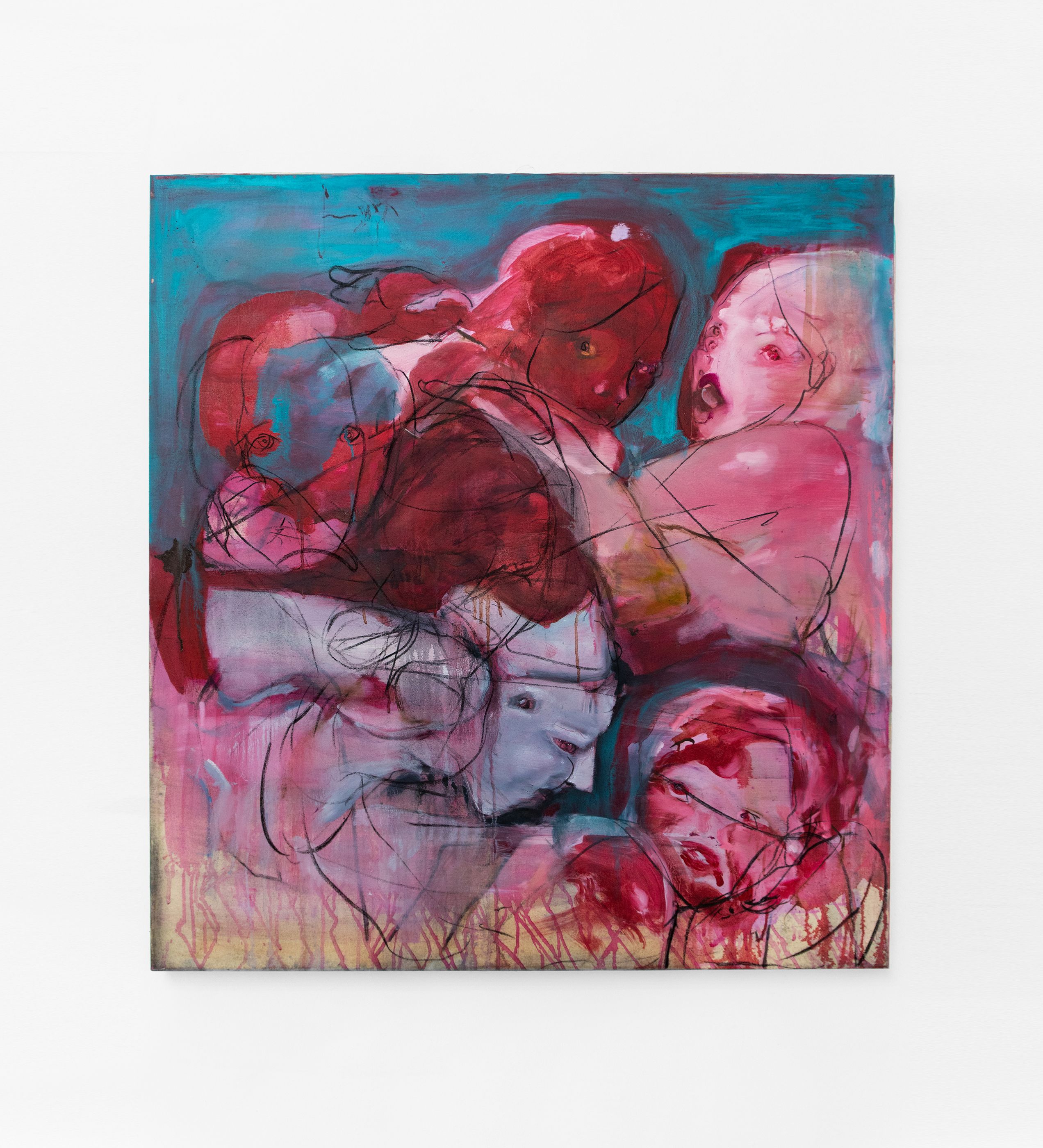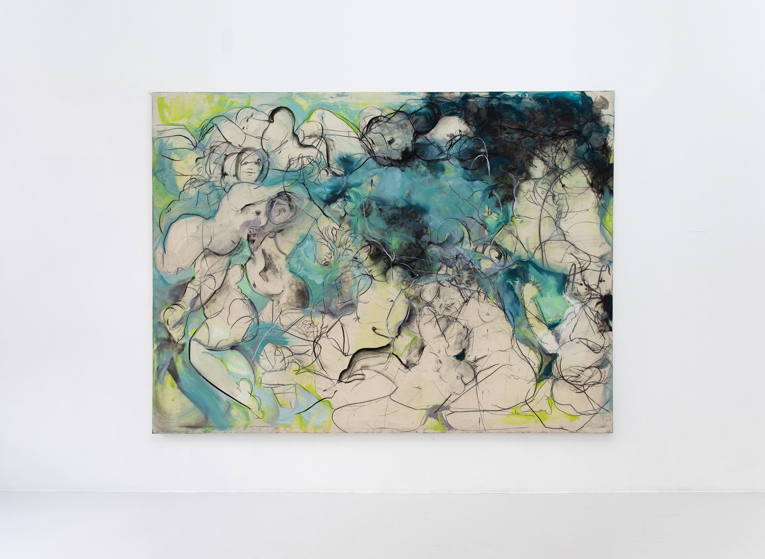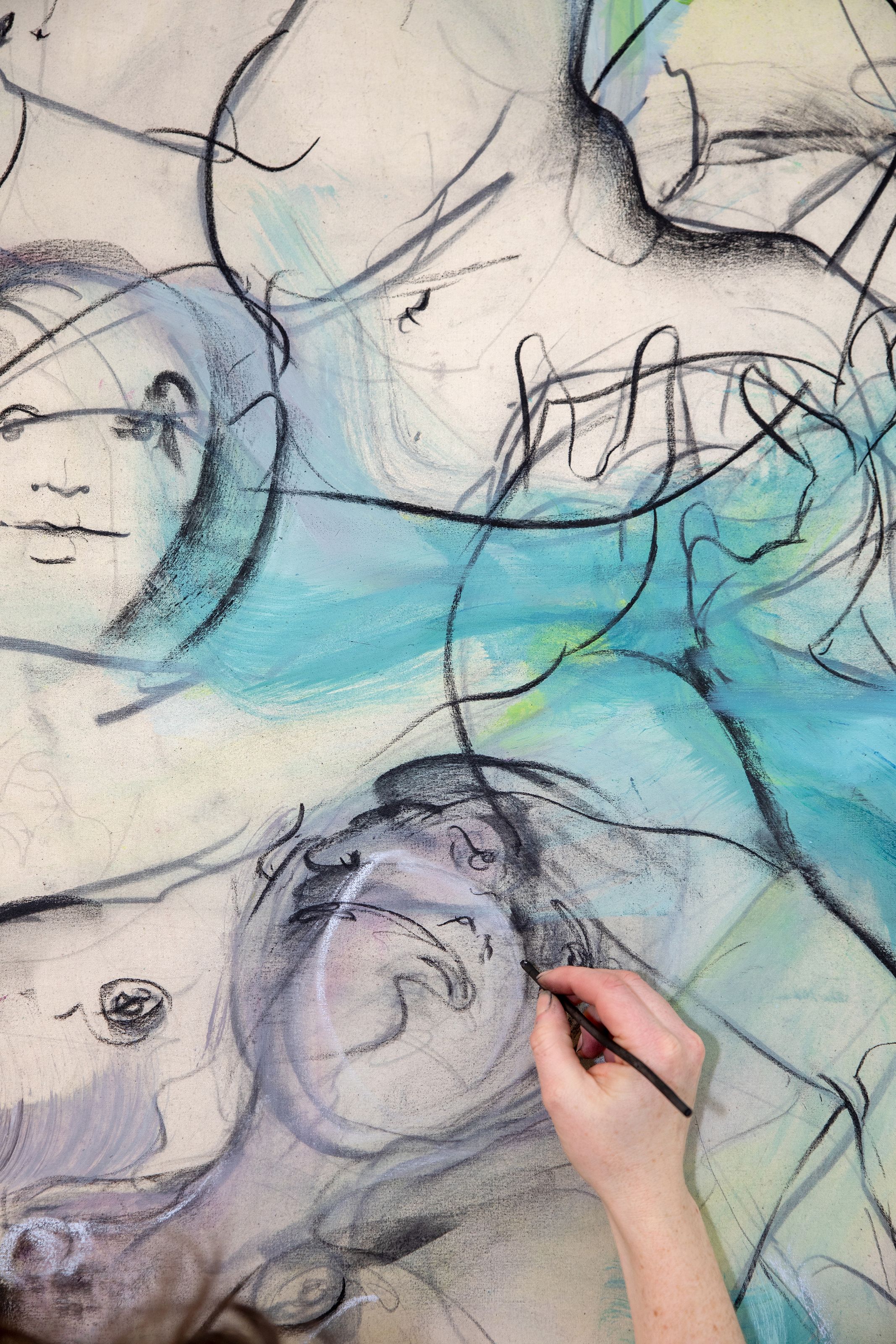 Painted with oil and charcoal on canvas, these intimate moments capture the climax of physical and emotional connection between the subjects.