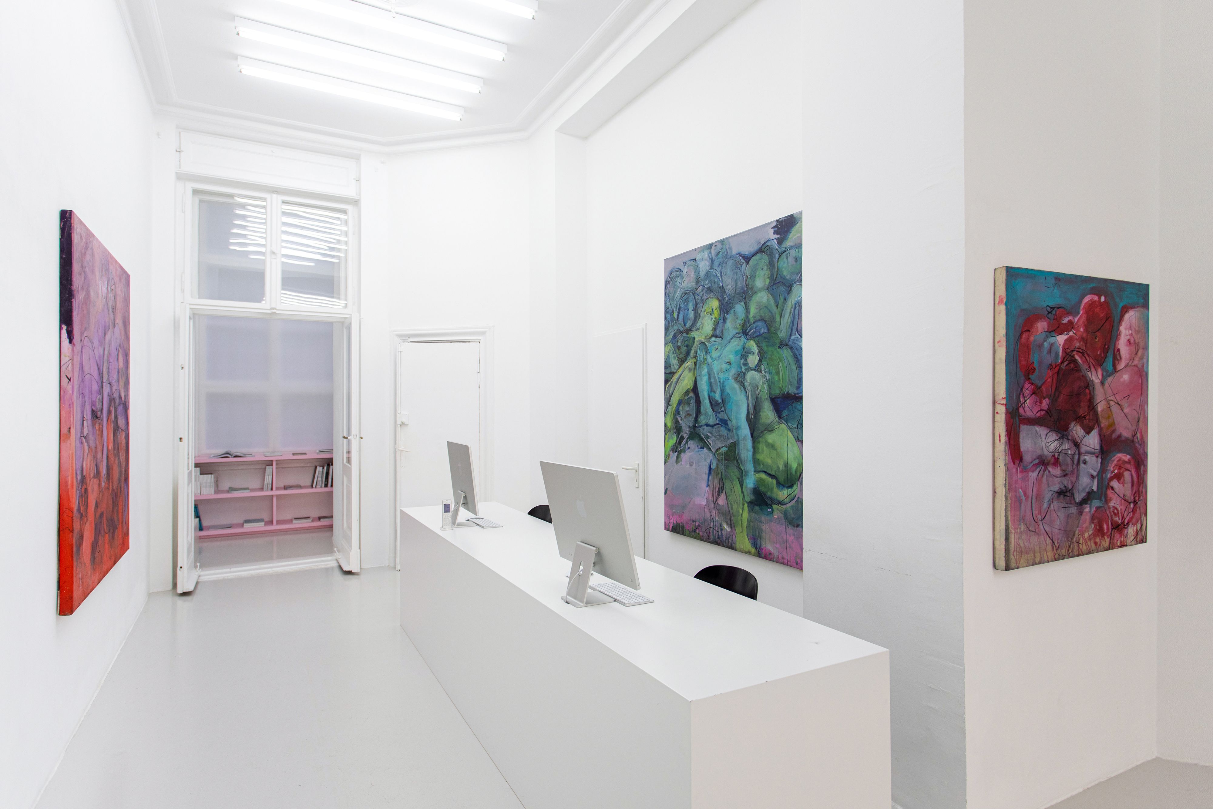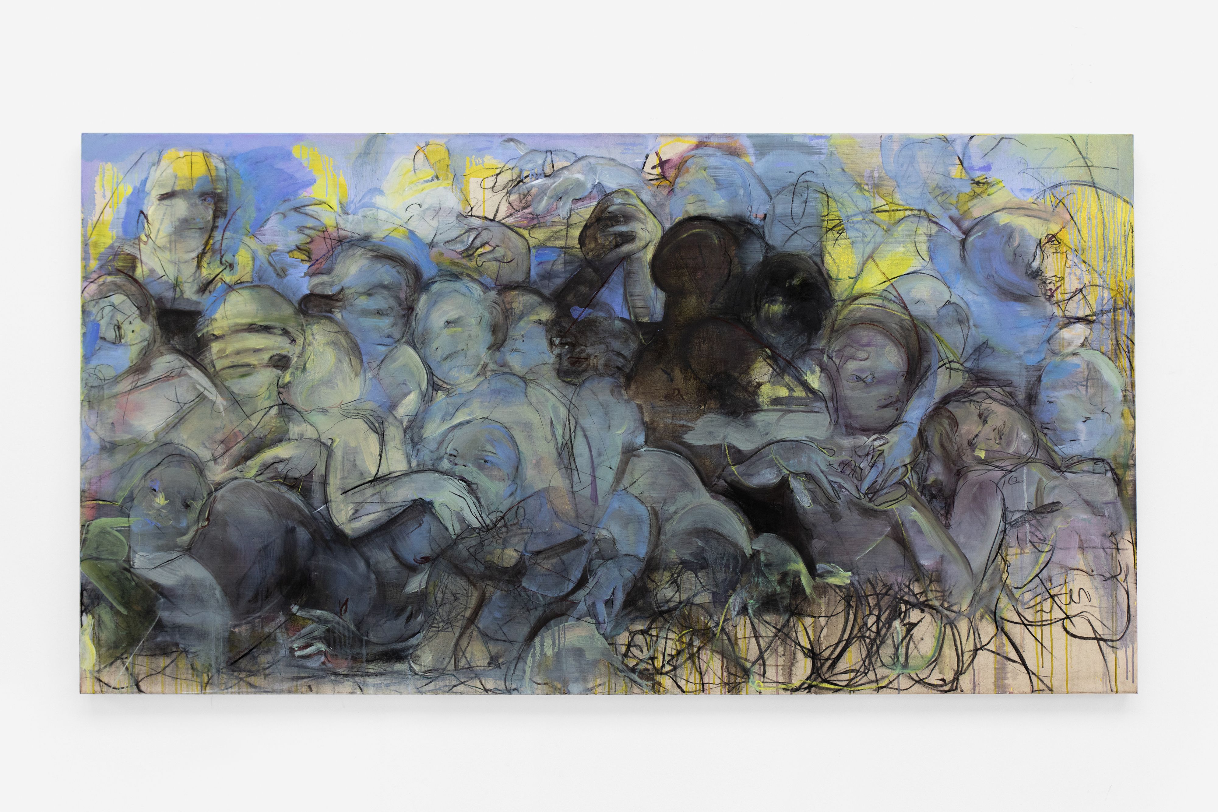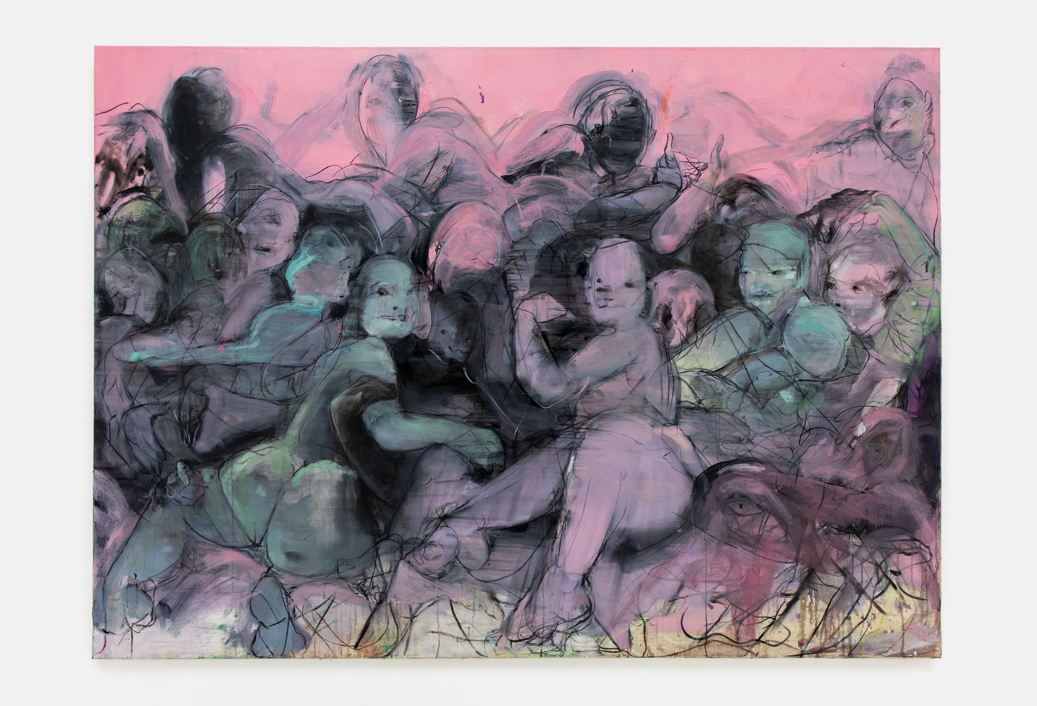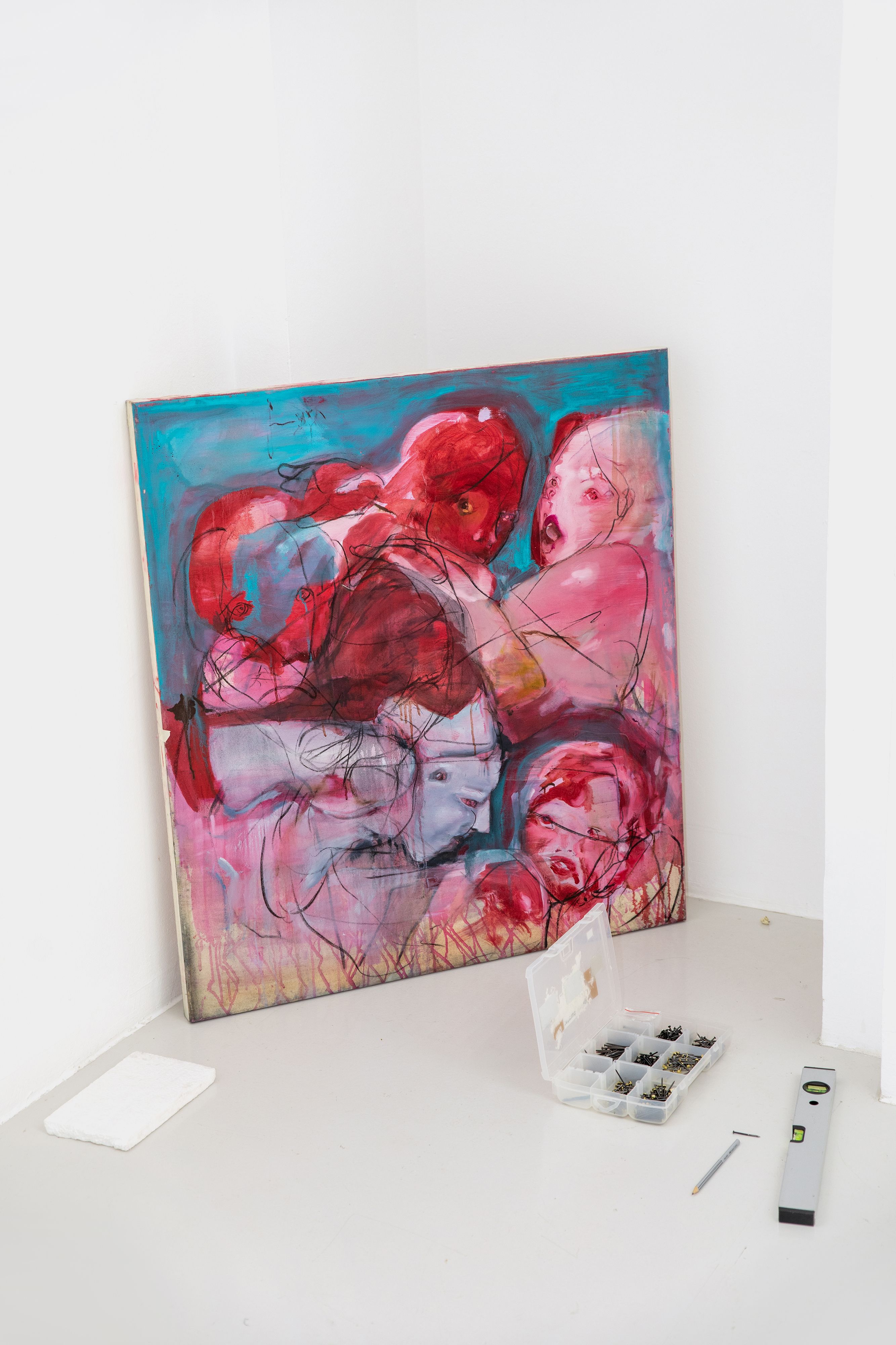 Painted with oil and charcoal on canvas, these intimate moments capture the climax of physical and emotional connection between the subjects.