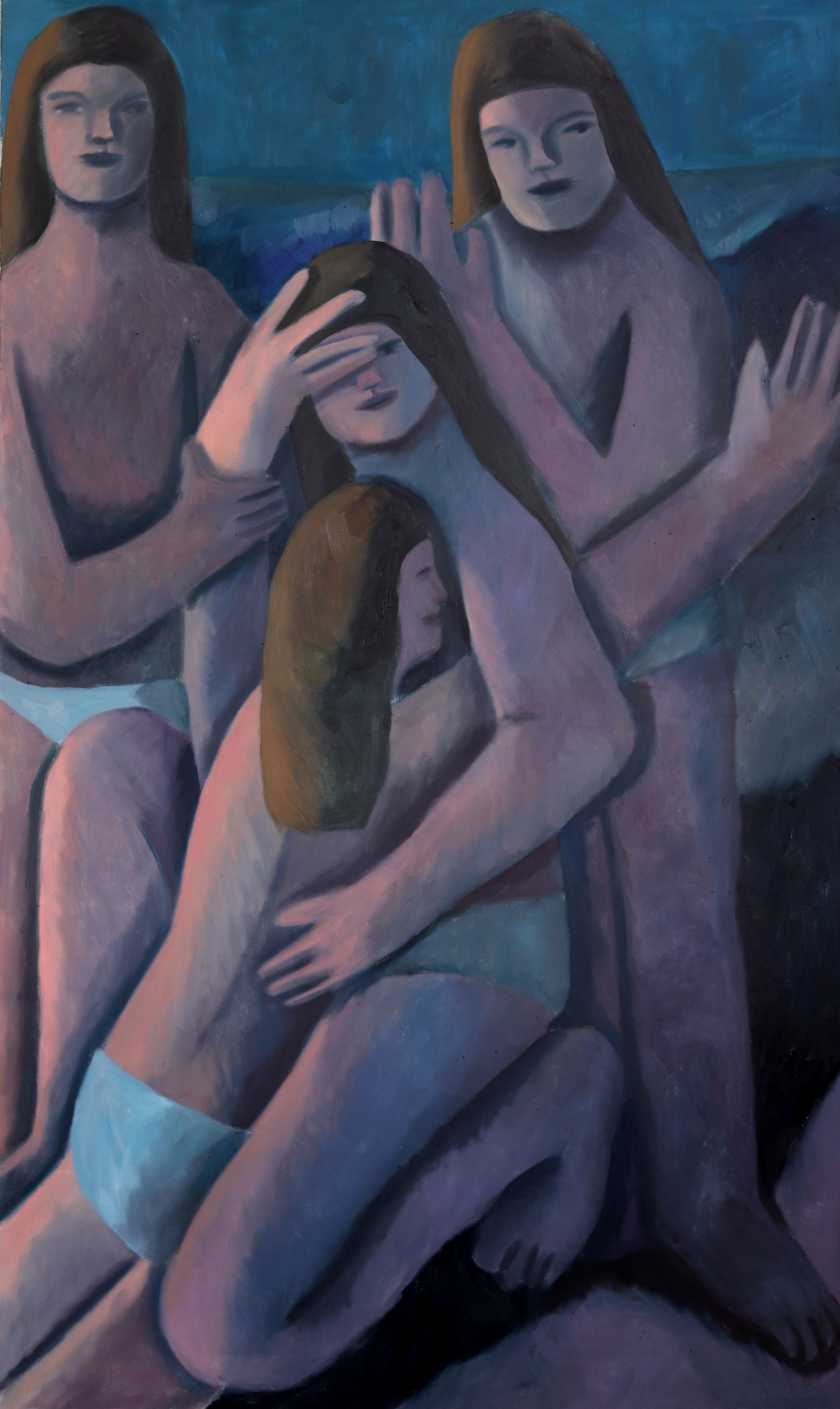 Arndt’s paintings bring figures together in quiet gestures of care, support and trust. Moving in soft circles, they share postures and features, creating a vision of community beyond identity, hierarchy or gender. Her work draws on sacred imagery, recalling Renaissance and Gothic compositions. Baptism becomes a symbol of closeness, lamentation turns to tenderness, and resurrection becomes a shared rising. Vessels appear throughout the paintings, hinting at water. Invisible, but always present in acts of offering and holding.