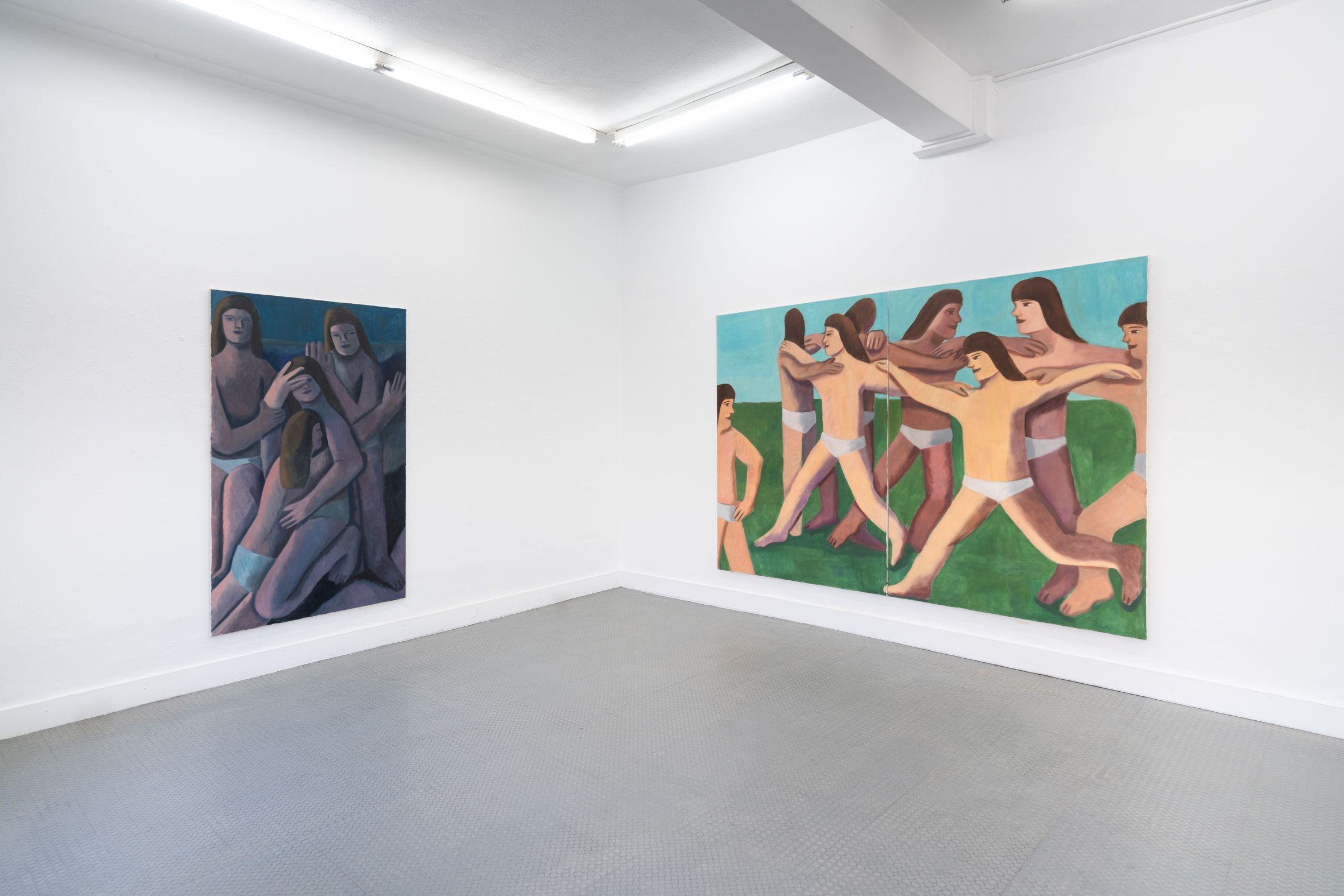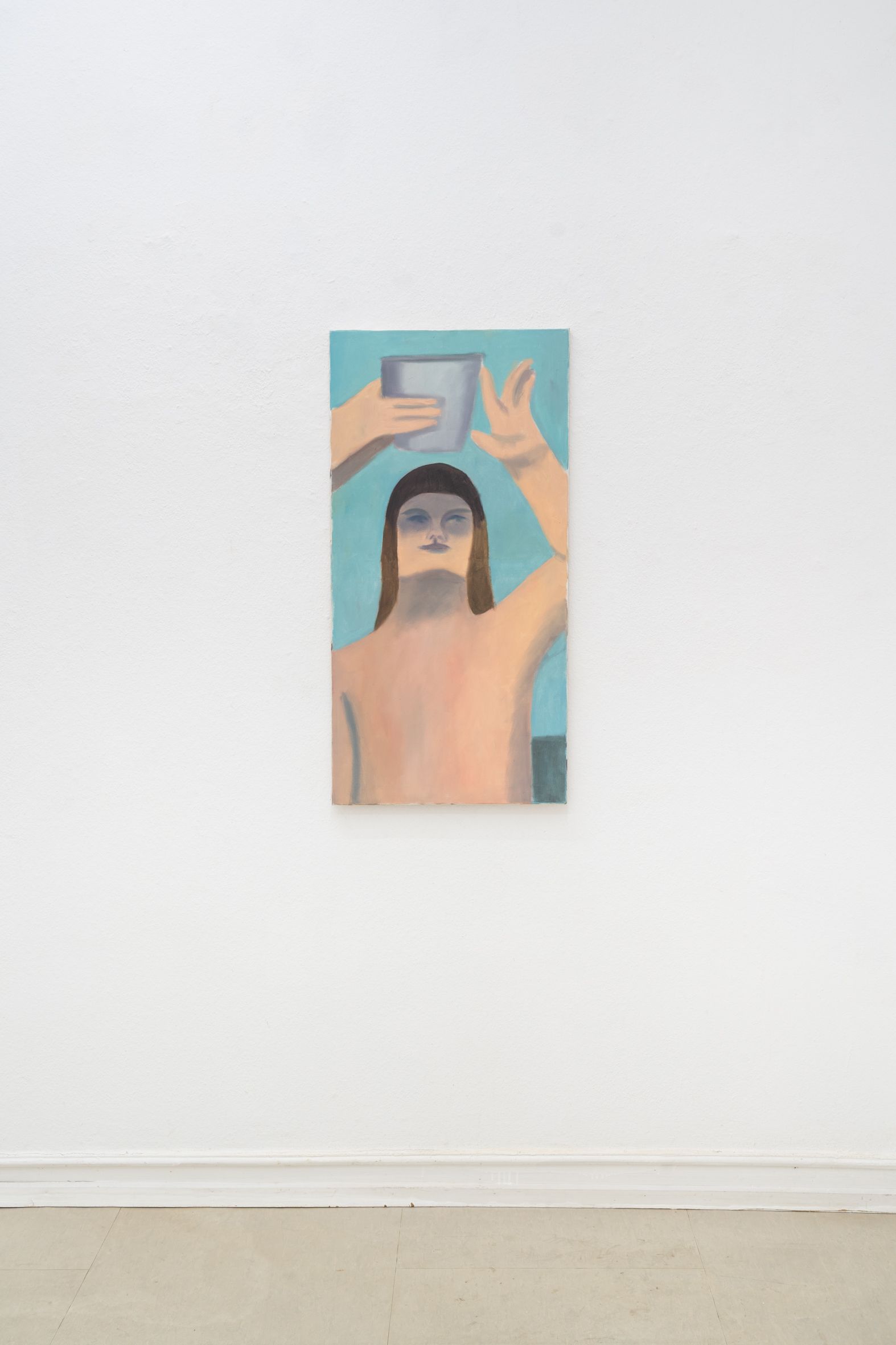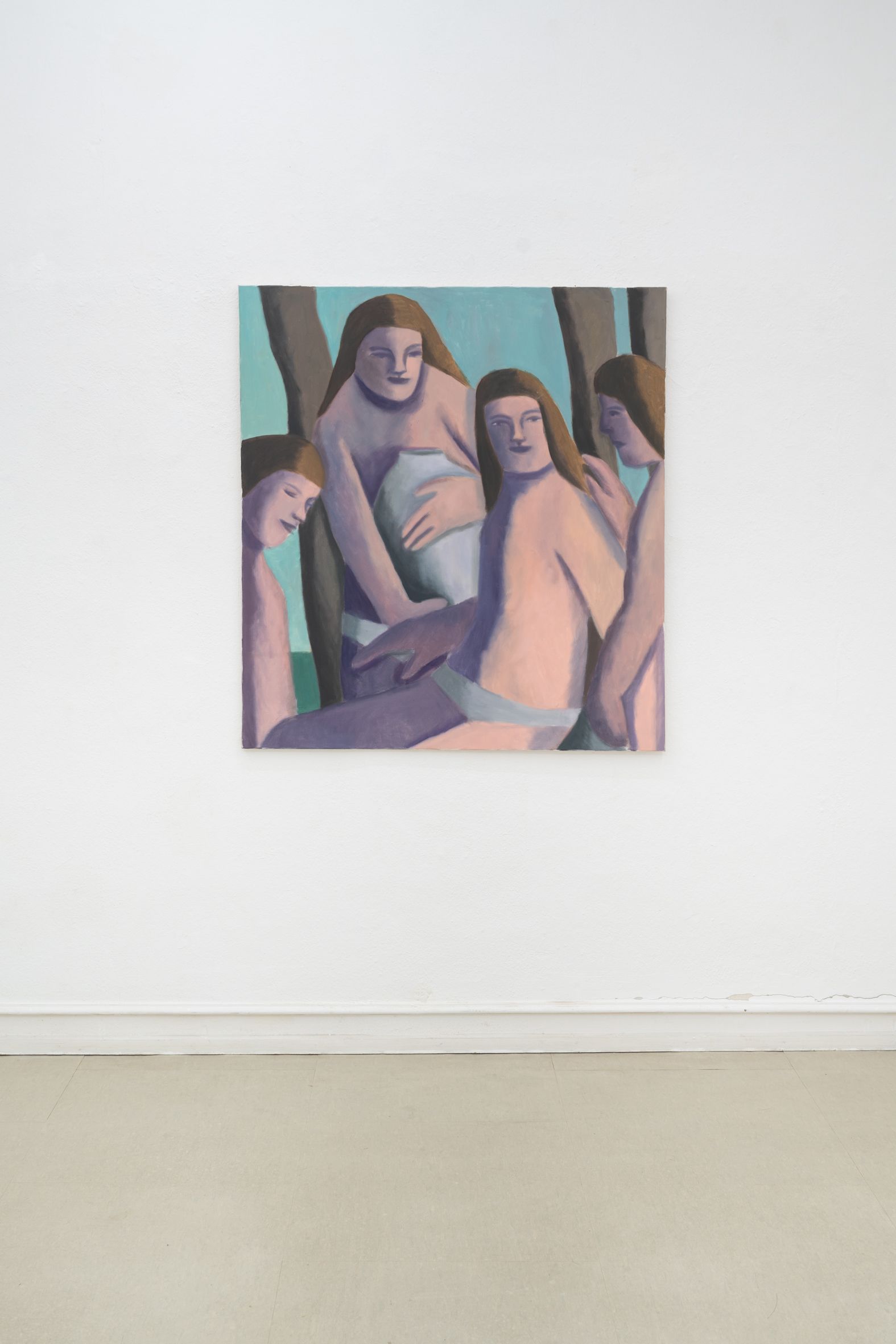 Arndt’s paintings bring figures together in quiet gestures of care, support and trust. Moving in soft circles, they share postures and features, creating a vision of community beyond identity, hierarchy or gender. Her work draws on sacred imagery, recalling Renaissance and Gothic compositions. Baptism becomes a symbol of closeness, lamentation turns to tenderness, and resurrection becomes a shared rising. Vessels appear throughout the paintings, hinting at water. Invisible, but always present in acts of offering and holding.