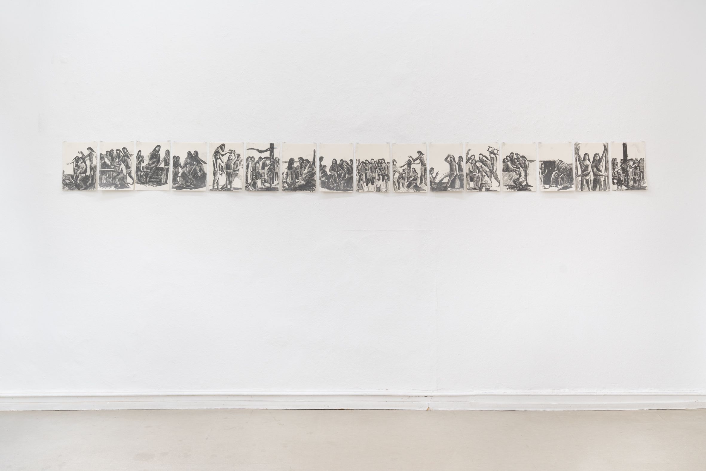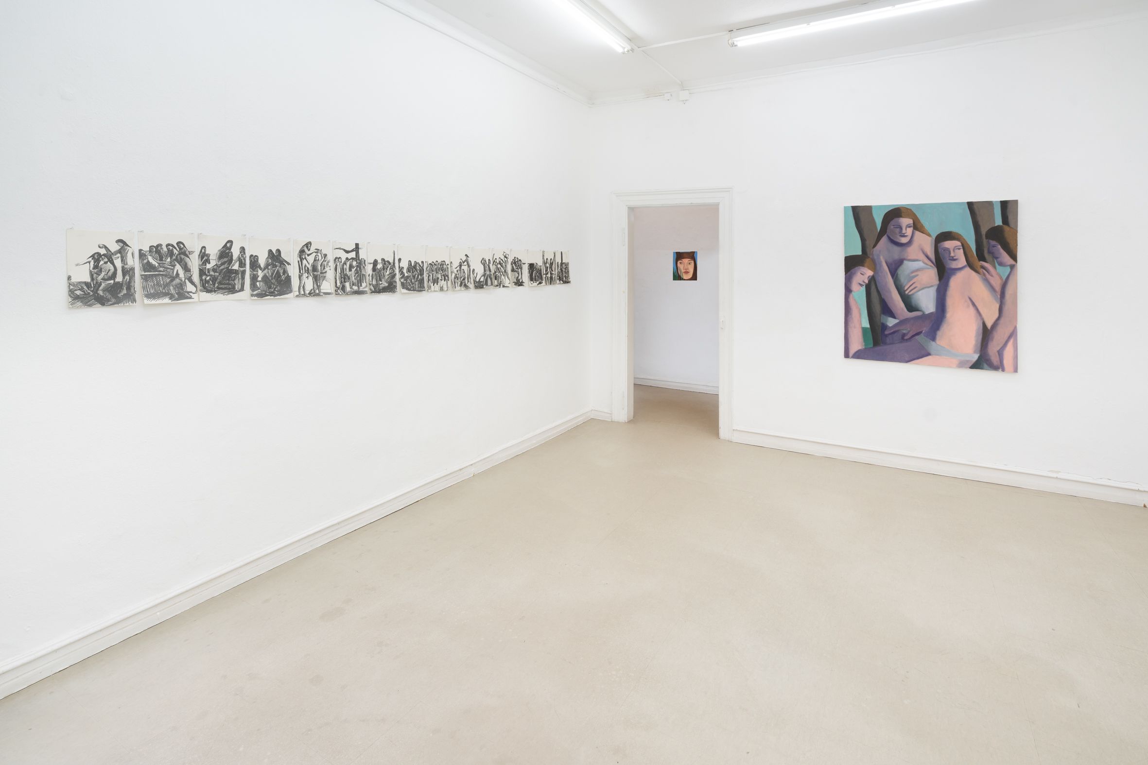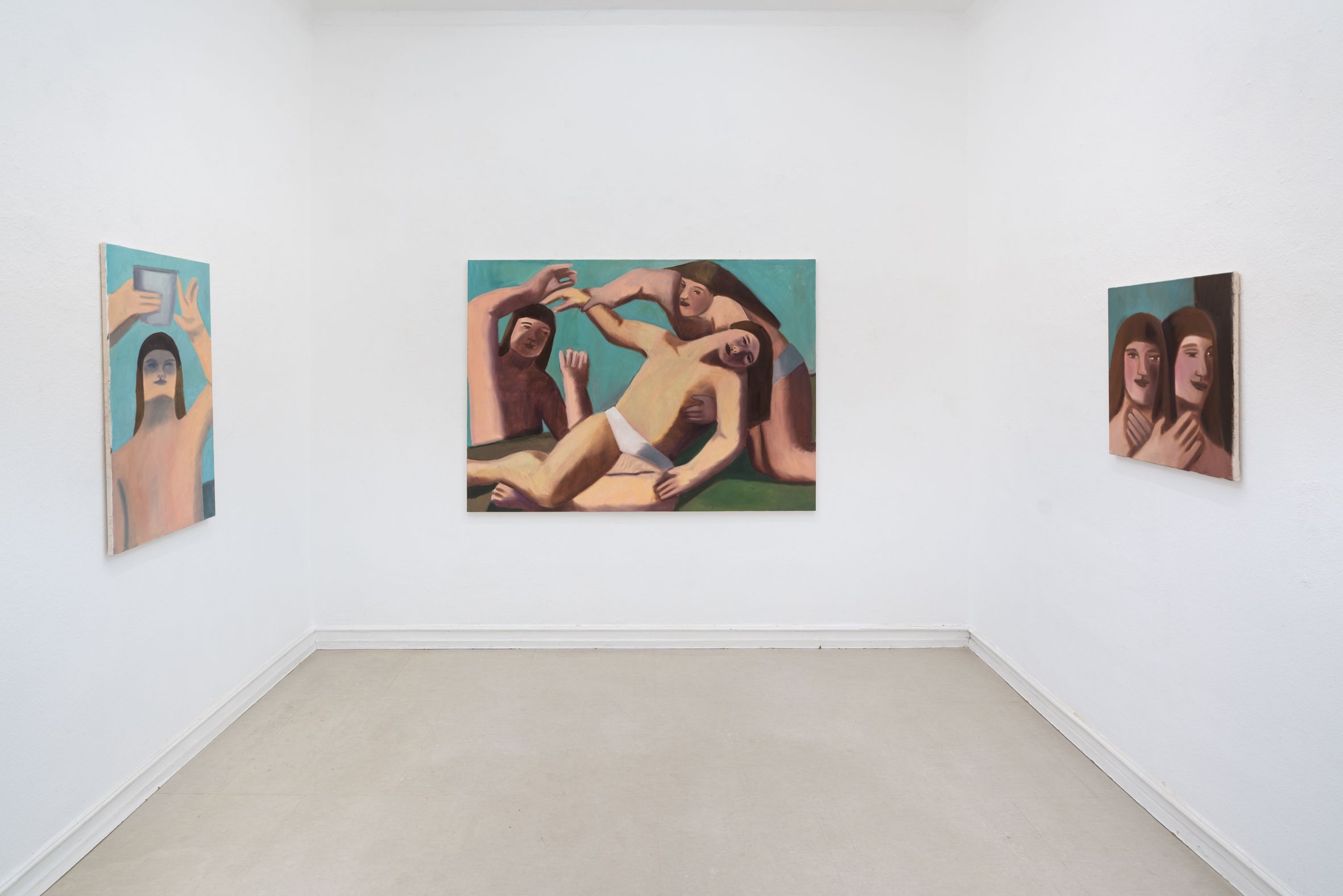 Arndt’s paintings bring figures together in quiet gestures of care, support and trust. Moving in soft circles, they share postures and features, creating a vision of community beyond identity, hierarchy or gender. Her work draws on sacred imagery, recalling Renaissance and Gothic compositions. Baptism becomes a symbol of closeness, lamentation turns to tenderness, and resurrection becomes a shared rising. Vessels appear throughout the paintings, hinting at water. Invisible, but always present in acts of offering and holding.