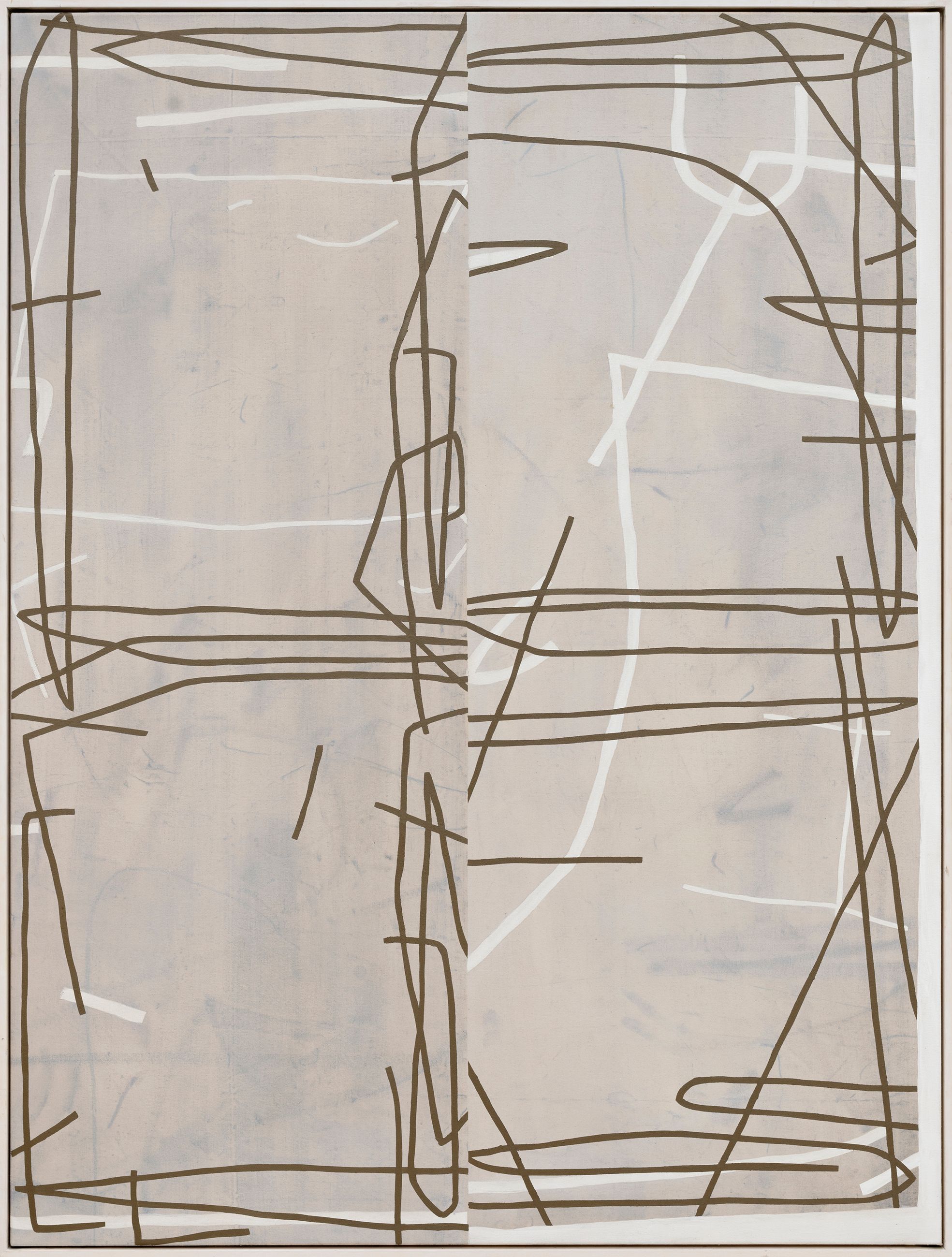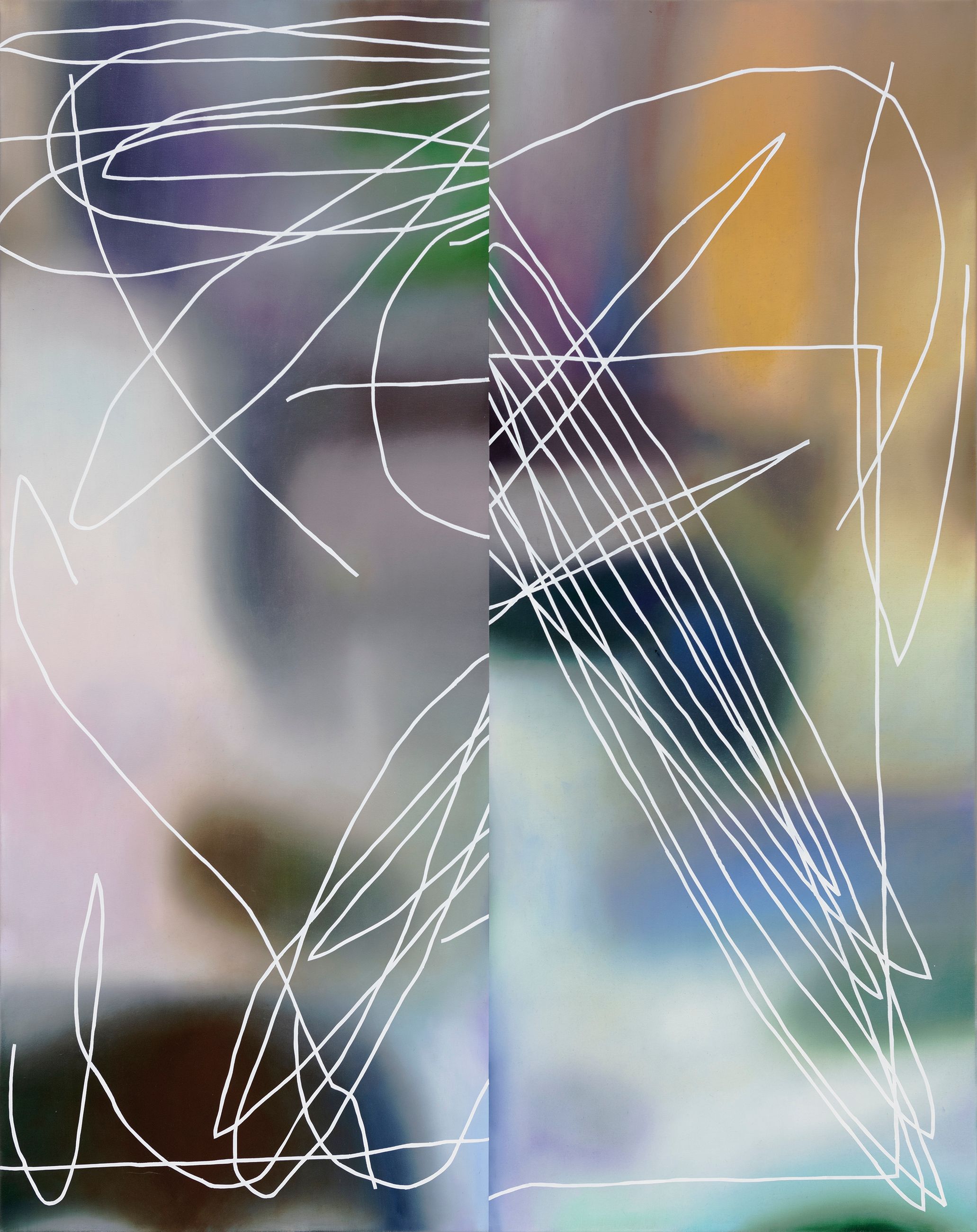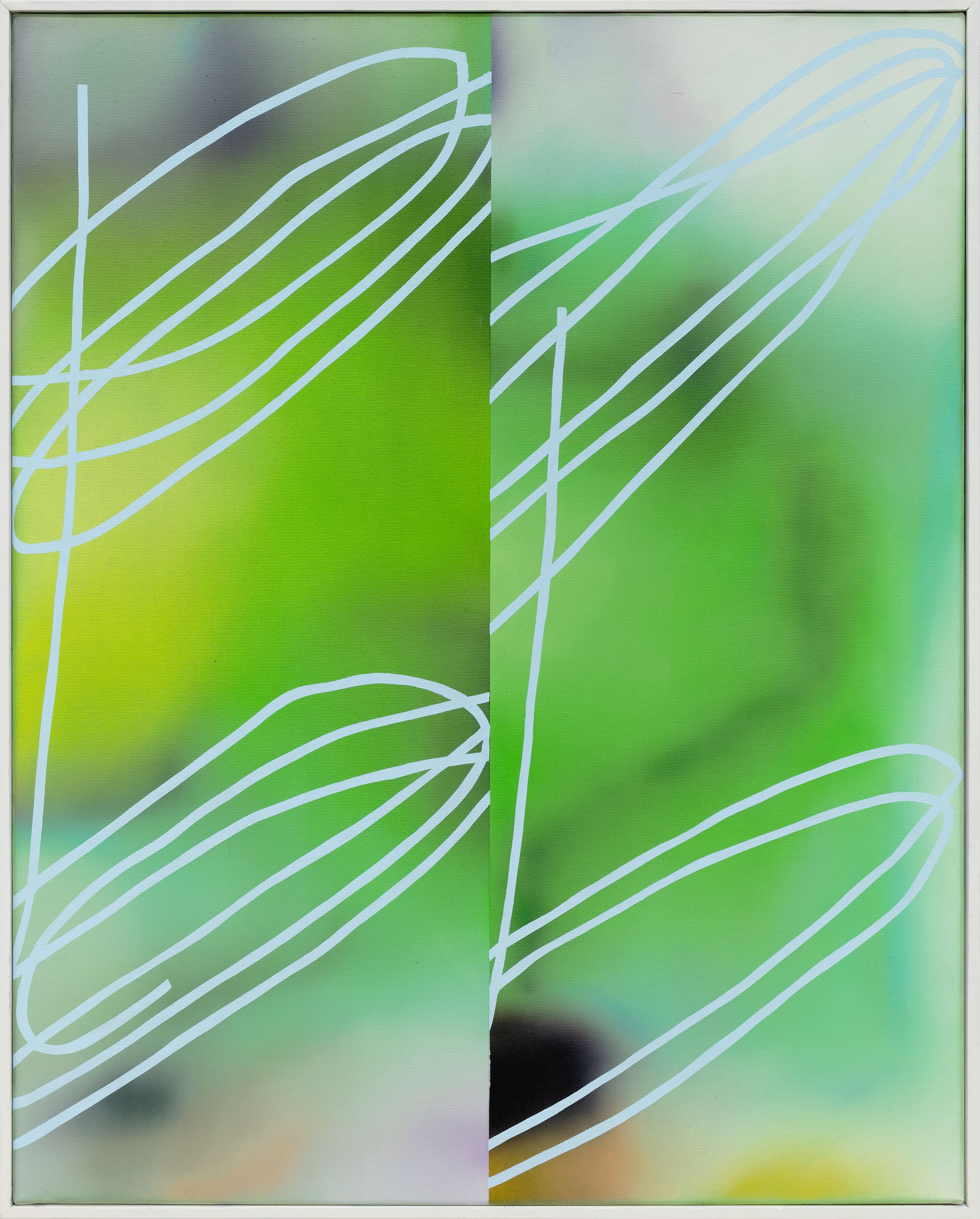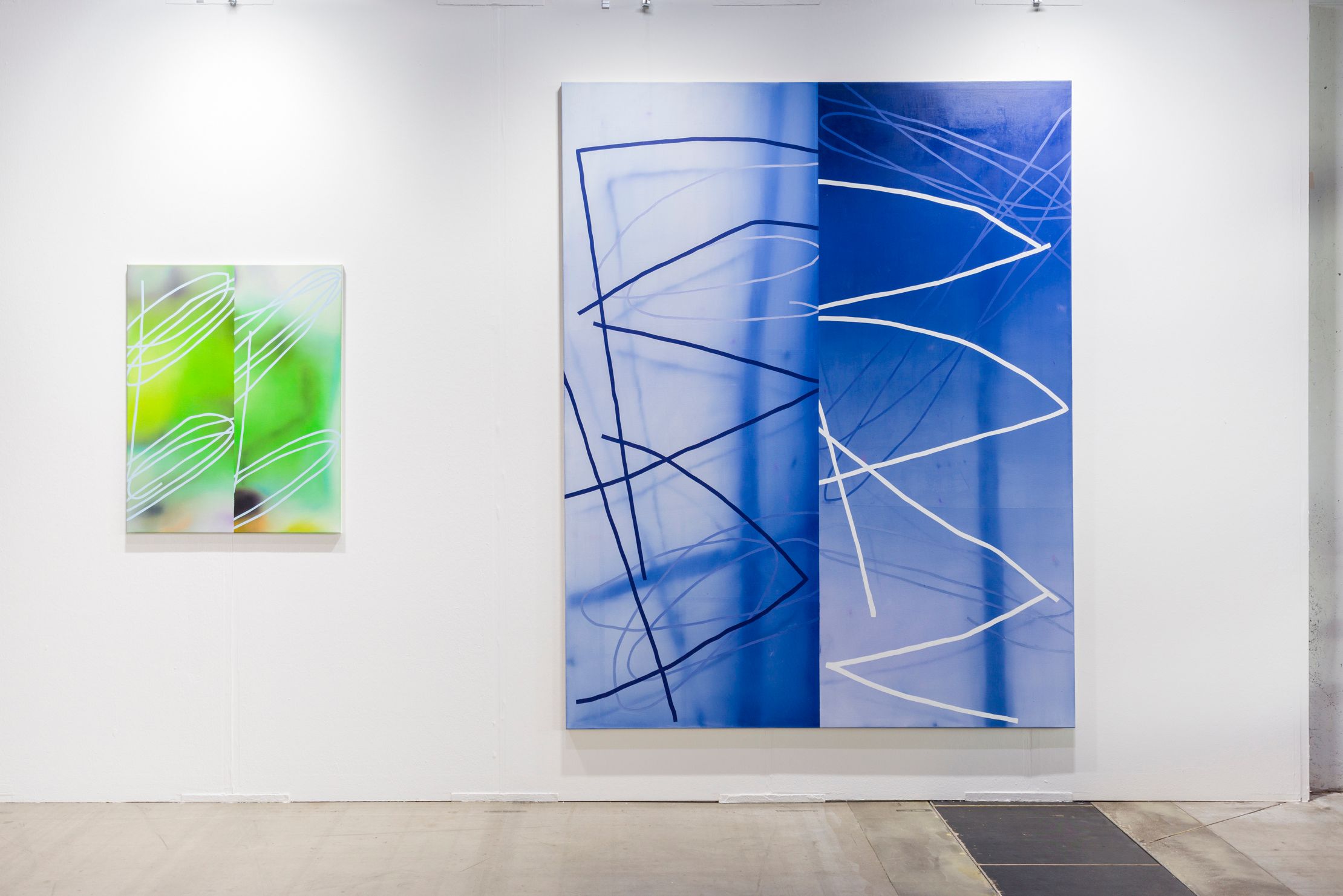 Enrico Bach's compositions are characterized by the division of the pictorial space into two halves. A picture-within-a-picture principle in which each side stands on its own and yet corresponds with the other half. The layered areas of color and pattern thus create the illusion of a more or less deep space. At the same time, Bach leaves behind the conventional compositional pattern of a centered motif: the picture's edge, ground and interfaces become depth-giving design levels.