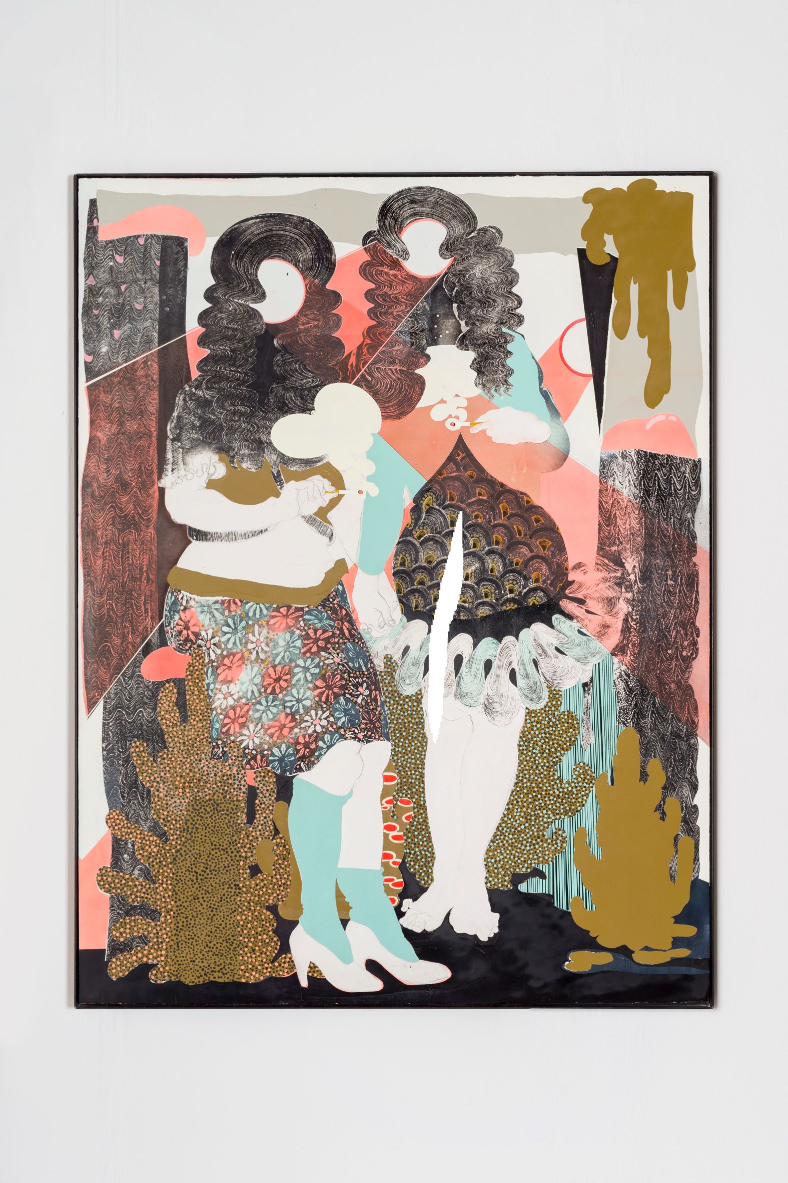 The compositions in Feuerstein's paintings show abstract scenes that oscillate between fiction and reality. Banal perspectives change into dream-like sequences that are left so wide open and alienated that they can neither be clearly assigned in time nor in space: Is it the sun that shines there or perhaps the moon after all? Are the bizarrely billowing loops plumes of smoke or thunderclouds?
